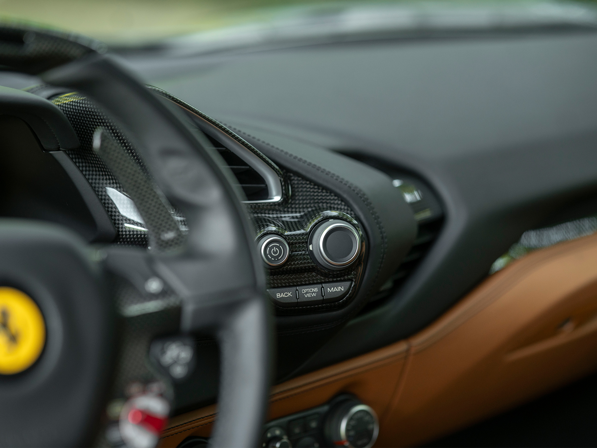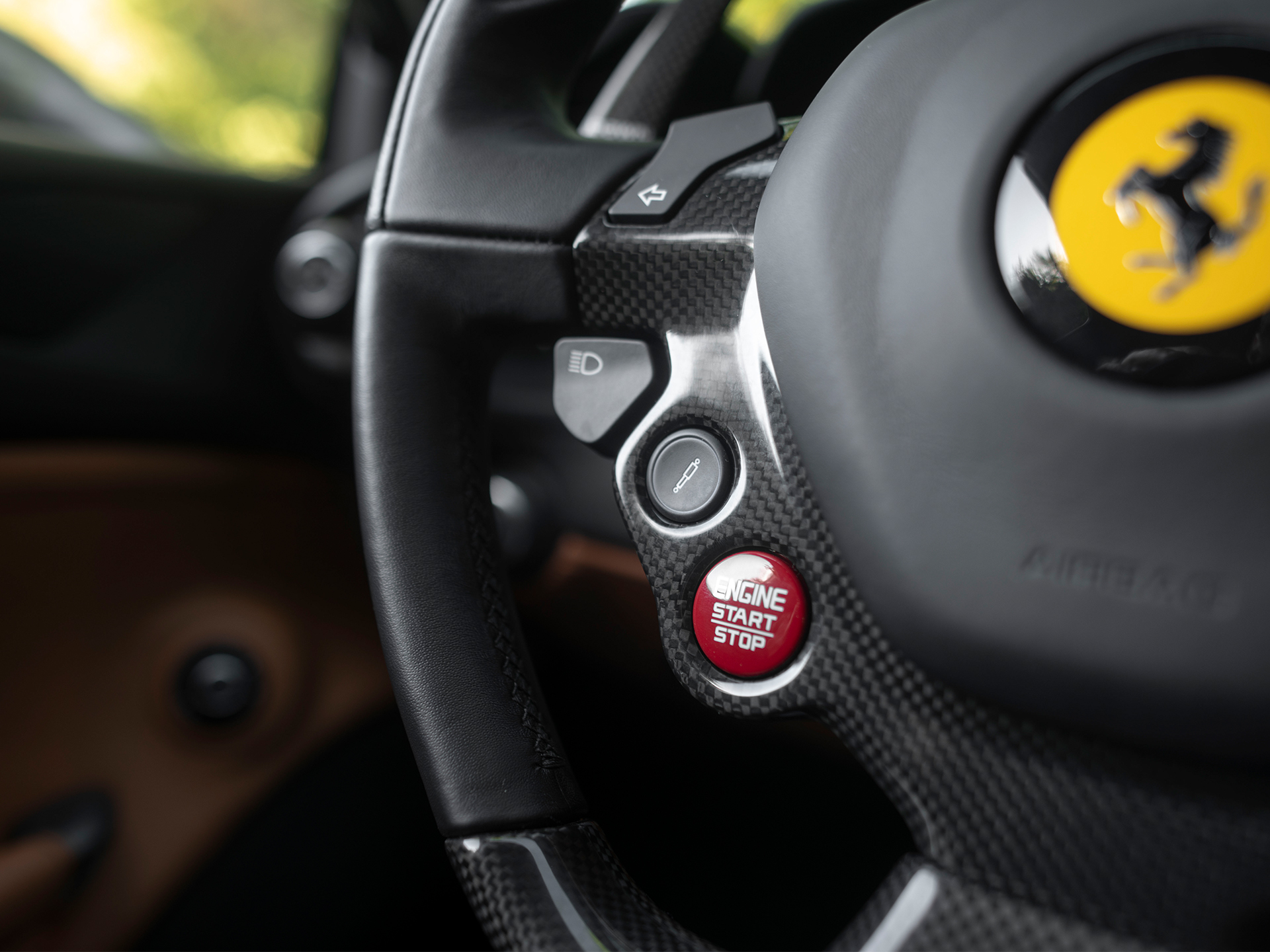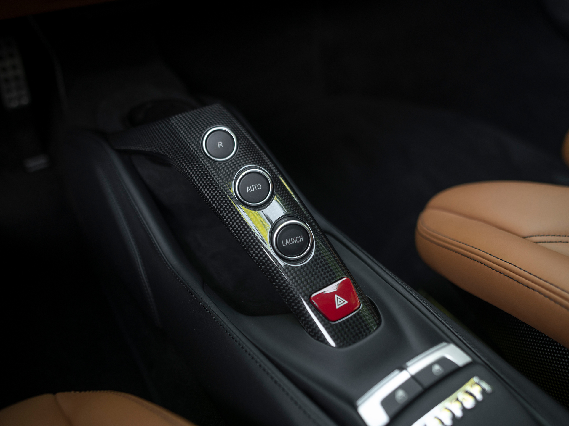 Zo aerodynamisch verantwoord en downforce gericht als de waanzinnige stroomlijn van de GTB is, zo strak en functioneel is de cockpit. Tegelijkertijd spat de originaliteit ervan af dankzij de opvallende keuze voor Cuoio lederen Goldrake Racing Seats – inclusief fraai gestikte Nero Cavallino’s. Wonderschoon zijn ook de Nero lederen hemelbekleding en dito afwerking van de middenconsole + bovenzijde van het dashboard. Enkel de bestuurder heeft zicht op de Giallo rev-counter, die er alles aan doet om de aandacht naar zich toe te trekken vanachter het carbon sportstuur. Dat valt nog niet mee met een geïntegreerde LED Shift Indicator die de ideale schakelmomenten op z’n F1’s weergeeft. Ook het wisselen van verzet gaat met een knipoog naar de racerij, verwijzend naar de in koolstofvezel gegoten Shift Paddles; nóg zo’n onderdeel uit de Carbon Driver Zone. Verder zijn licht van gewicht: de ring rondom de toerenteller, Carbon Dashboard Inserts en Carbon Central Bridge. Voelt u de opwinding al? Wacht maar tot uw vinger de vuurrode “Engine Start” button bereikt…