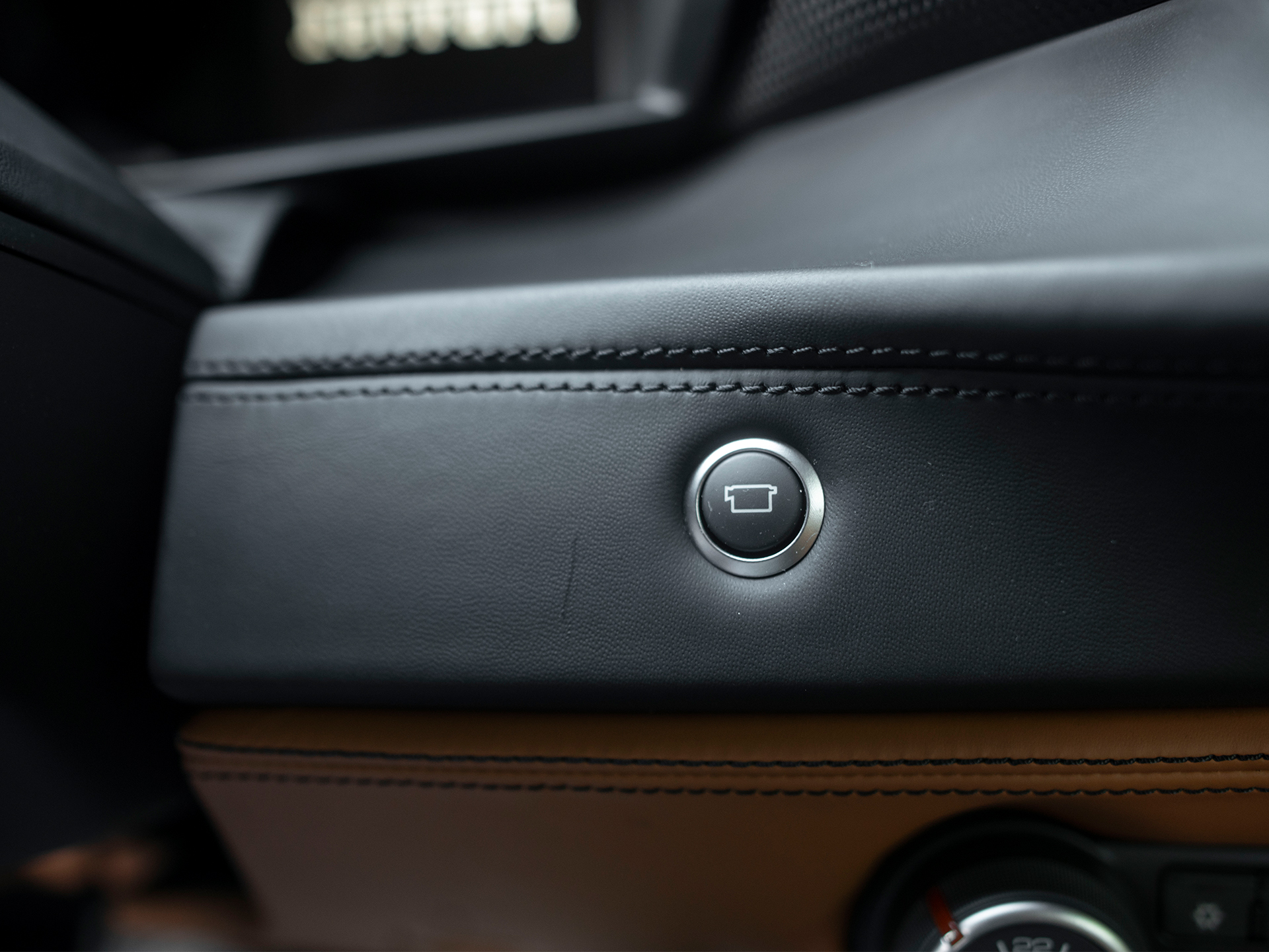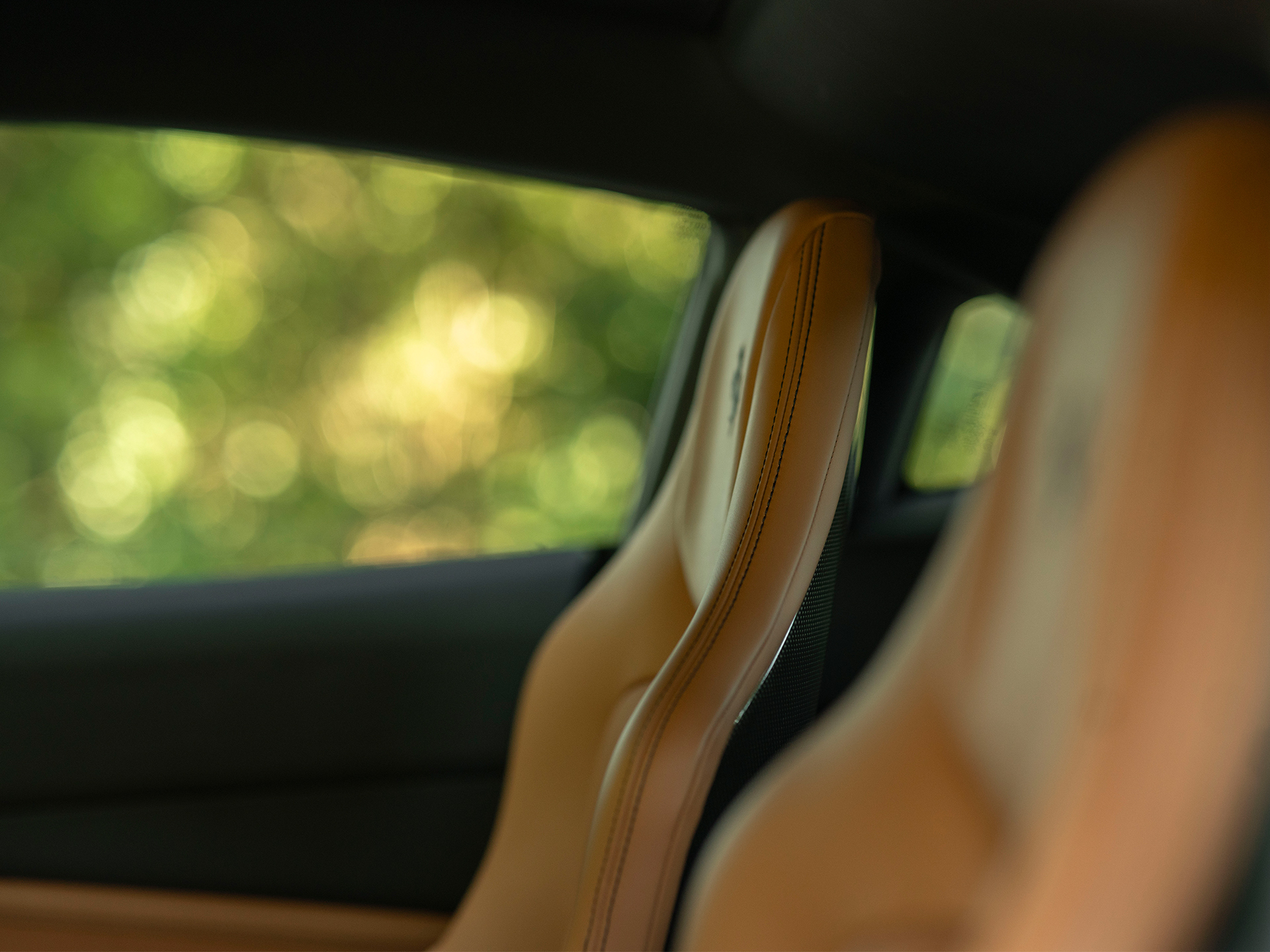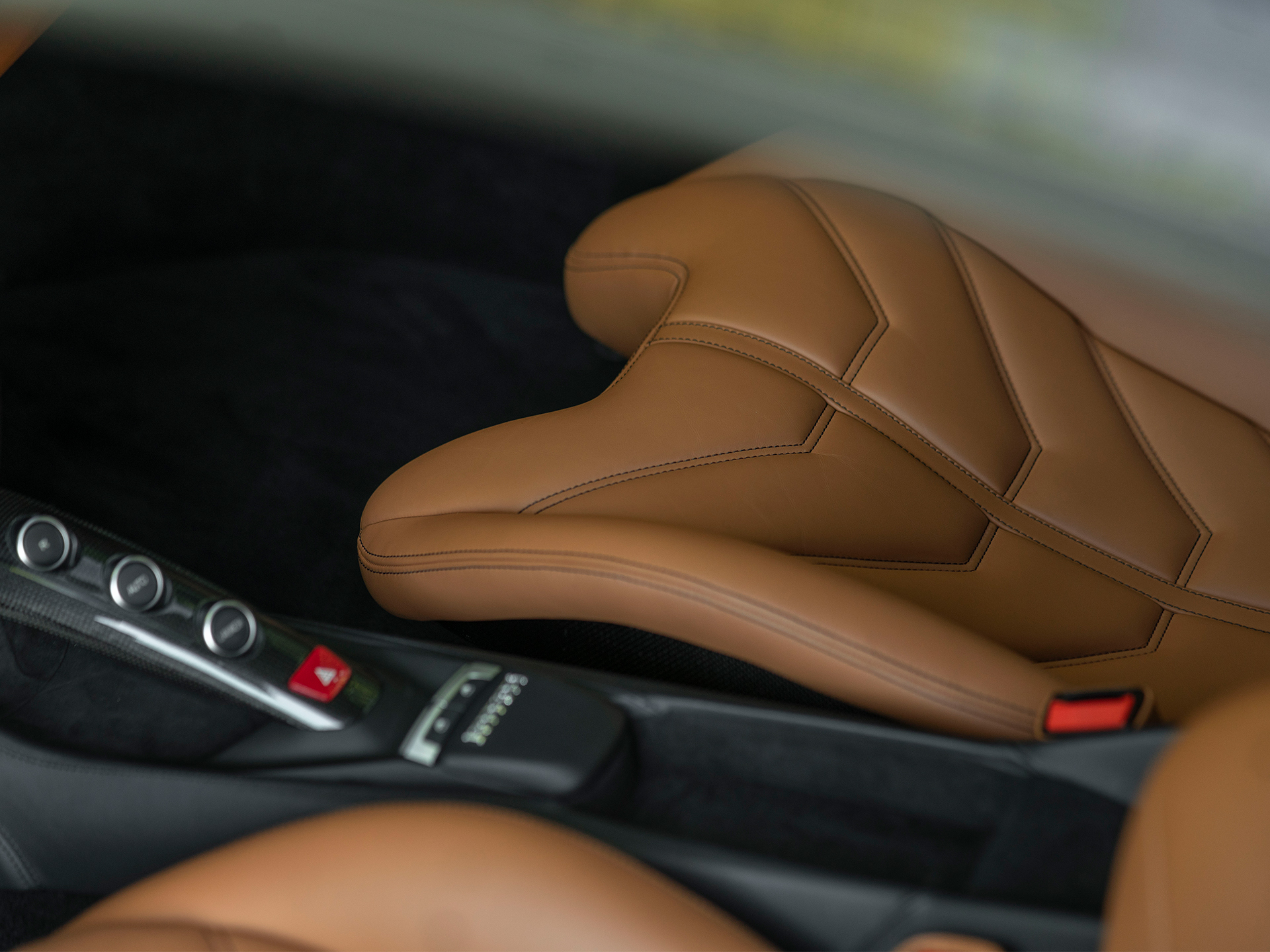 Zo aerodynamisch verantwoord en downforce gericht als de waanzinnige stroomlijn van de GTB is, zo strak en functioneel is de cockpit. Tegelijkertijd spat de originaliteit ervan af dankzij de opvallende keuze voor Cuoio lederen Goldrake Racing Seats – inclusief fraai gestikte Nero Cavallino’s. Wonderschoon zijn ook de Nero lederen hemelbekleding en dito afwerking van de middenconsole + bovenzijde van het dashboard. Enkel de bestuurder heeft zicht op de Giallo rev-counter, die er alles aan doet om de aandacht naar zich toe te trekken vanachter het carbon sportstuur. Dat valt nog niet mee met een geïntegreerde LED Shift Indicator die de ideale schakelmomenten op z’n F1’s weergeeft. Ook het wisselen van verzet gaat met een knipoog naar de racerij, verwijzend naar de in koolstofvezel gegoten Shift Paddles; nóg zo’n onderdeel uit de Carbon Driver Zone. Verder zijn licht van gewicht: de ring rondom de toerenteller, Carbon Dashboard Inserts en Carbon Central Bridge. Voelt u de opwinding al? Wacht maar tot uw vinger de vuurrode “Engine Start” button bereikt…