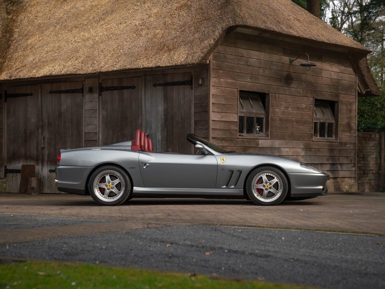 De open Ferrari 550 werd bedacht naar aanleiding van de 70e verjaardag van Pininfarina. Tegelijkertijd was dit het 50e jaar dat de legendarische ontwerper intensief samenwerkte met Maranello. Dubbel feest dus! Eigenlijk mogen we niet van een nummer spreken, zó speciaal is de Ferrari 550 Barchetta Pininfarina. Anderzijds onderstreept het de exclusiviteit van deze limited edition nog maar eens. Dit betreft het 344e exemplaar van in totaal 448 stuks. Nog veel minder zijn er oorspronkelijk in Nederland geleverd. Dit is er één van. Leuk feitje is dat de naam Barchetta bedacht werd door de grote baas van Fiat, die de klassieke Ferrari 166 MM (Mille Miglia) vergeleek met het design van een klein Italiaans bootje: de Barchetta. De typerend lage voorruit van deze auto betreft ook één van de unieke karakteristieken van onze 550, waarmee de link naar vroegere Barchetta’s al gauw was gelegd. Kort voor de officiële introductie van het model waren alle exemplaren al vergeven, die Ferrari enkel aan échte liefhebbers gunde. Ook deze Grigio Titanio gespoten versie is in handen geweest van een Ferrari liefhebber en verzamelaar pur sang. En dat is de auto aan te zien!