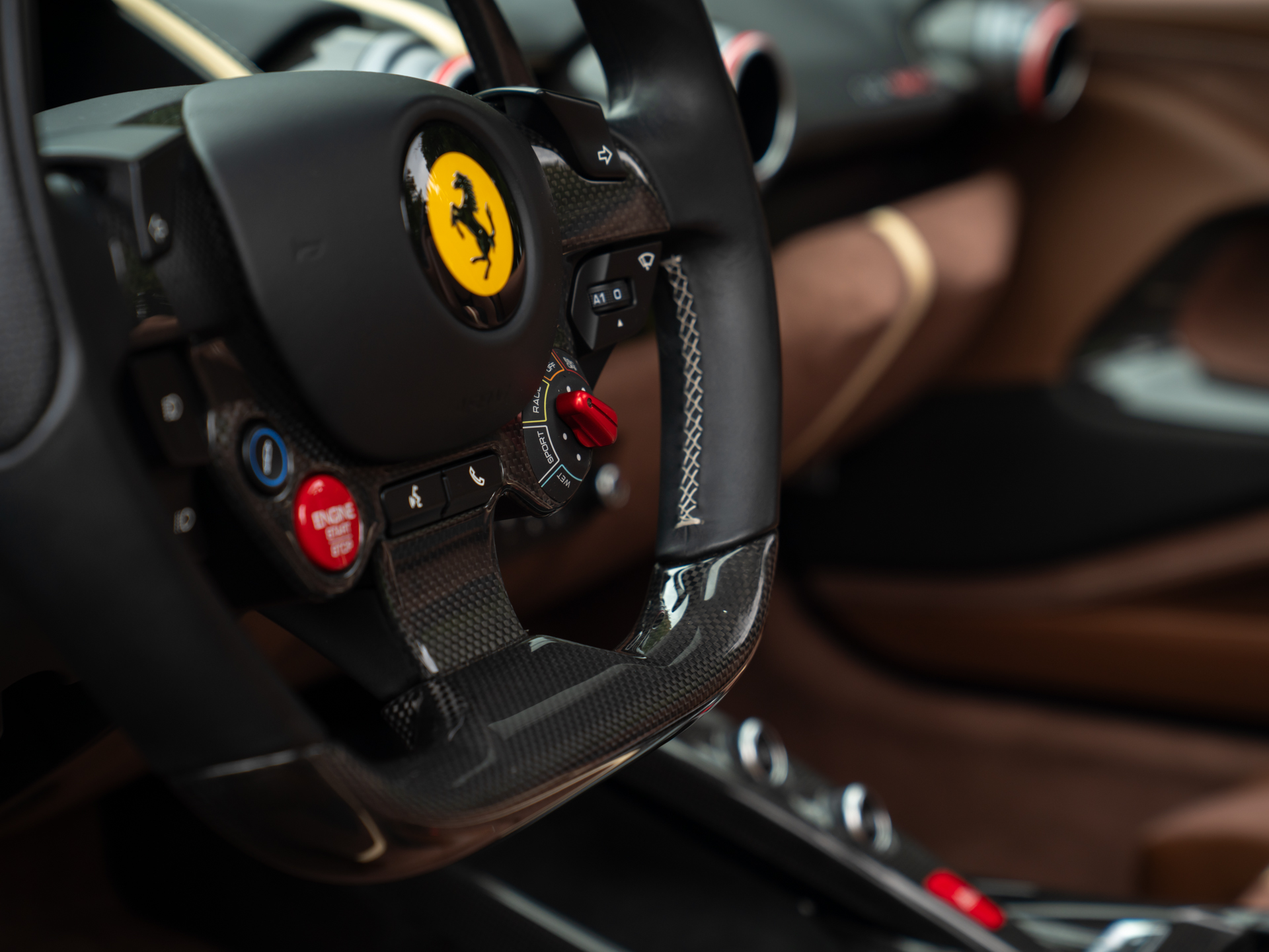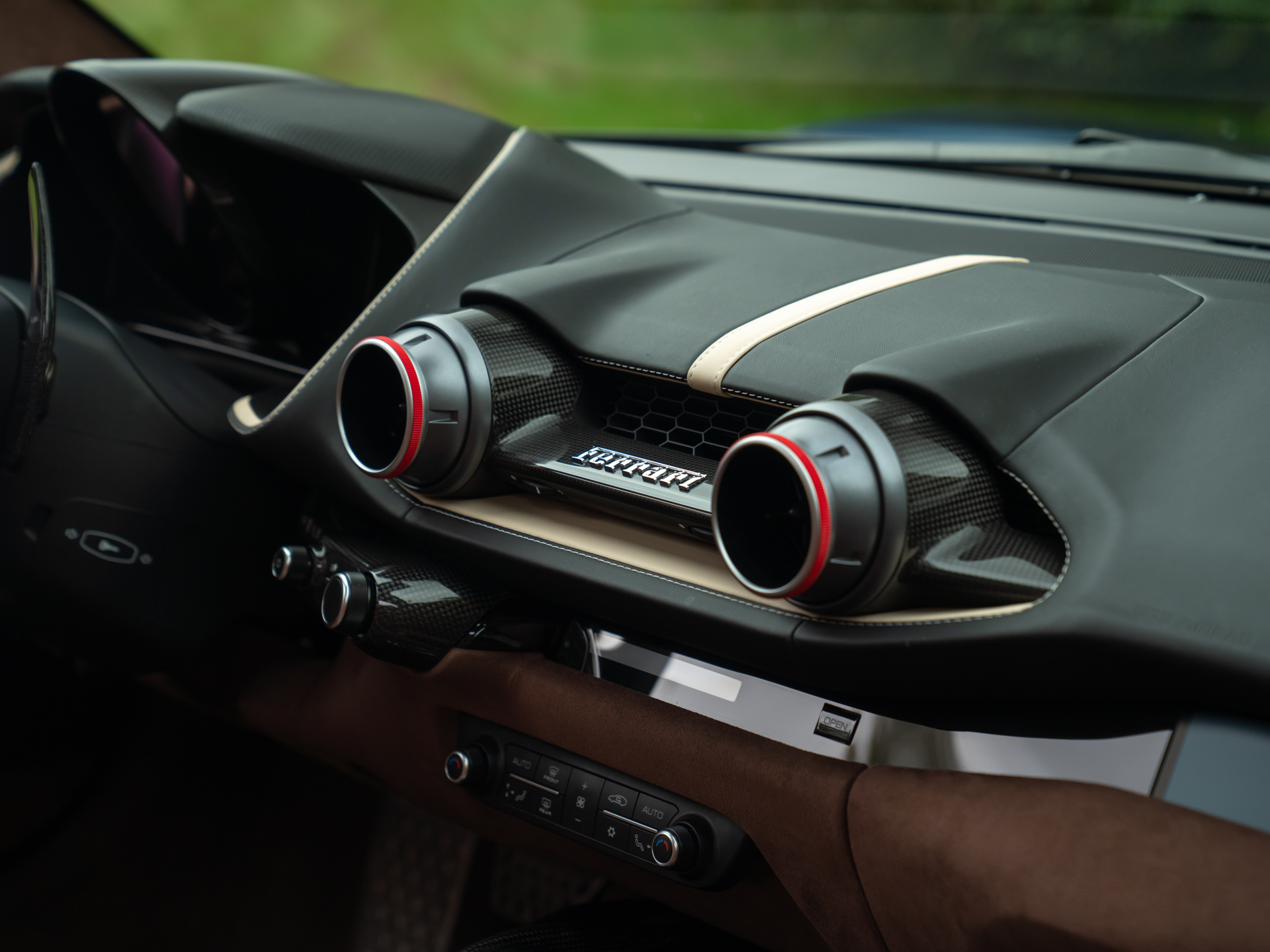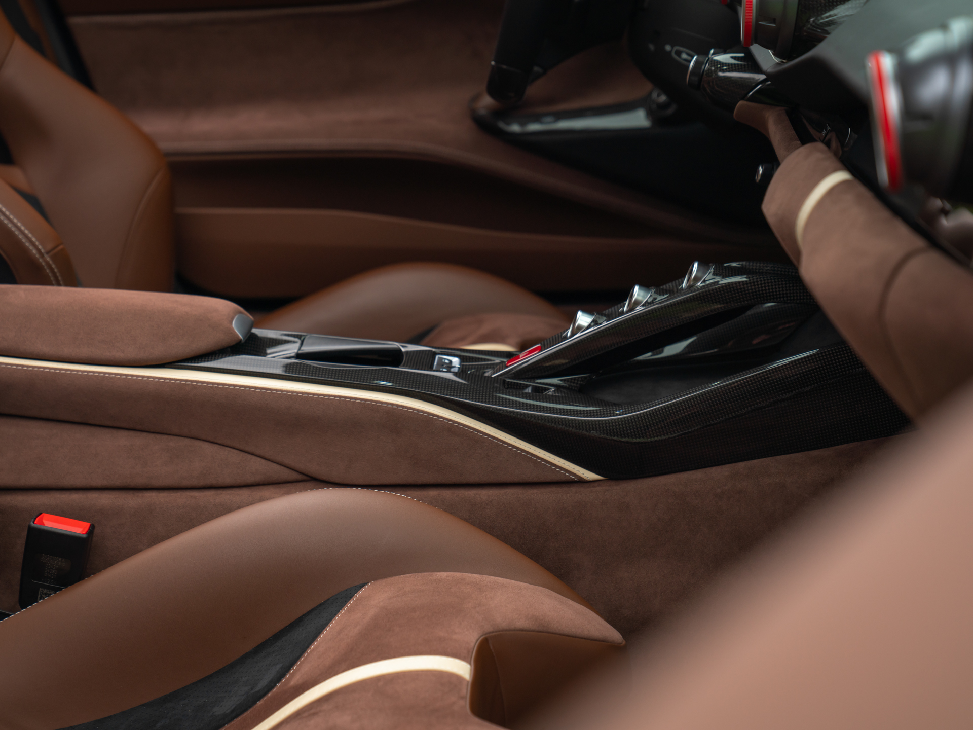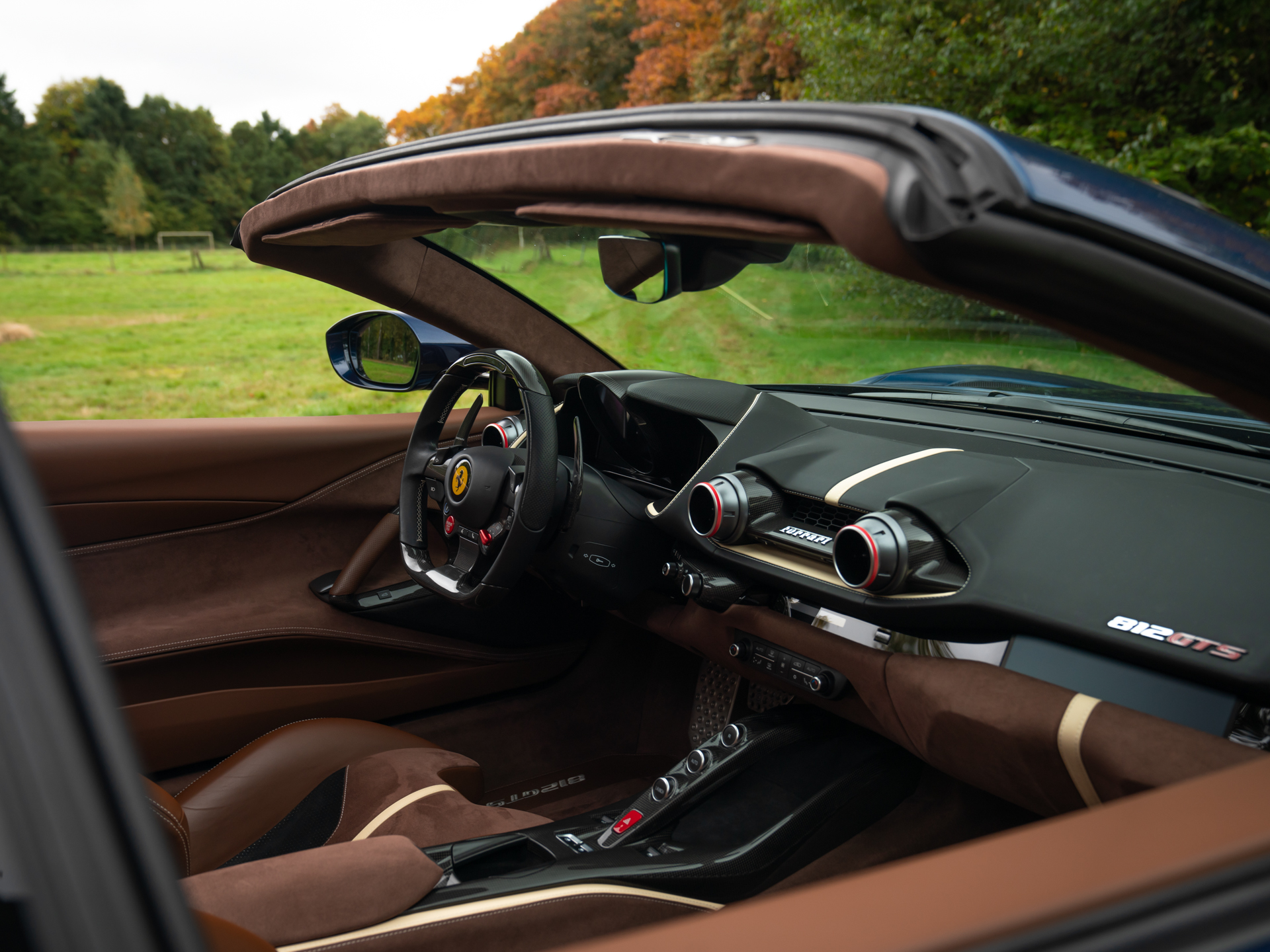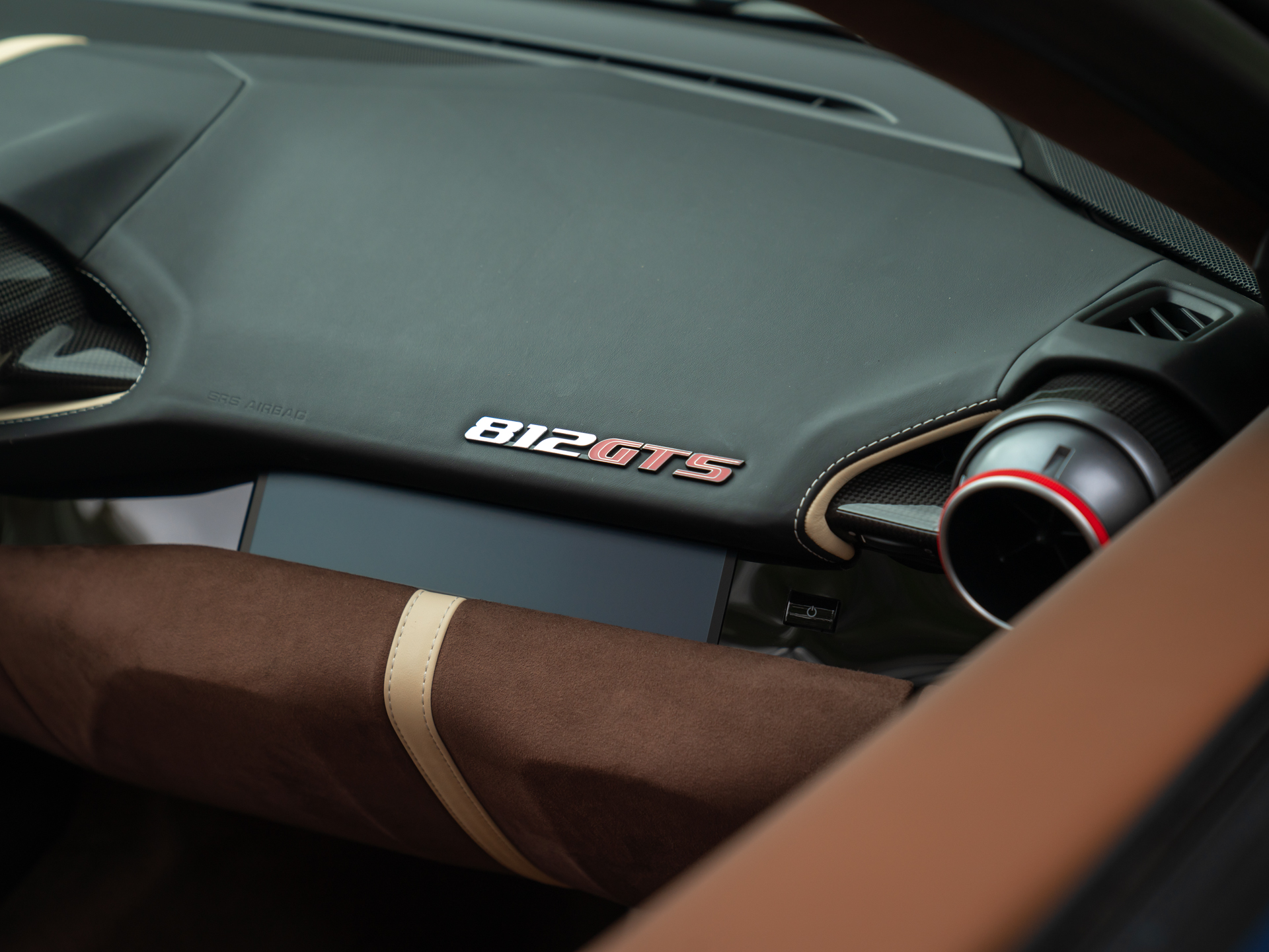 Duik een willekeurig Italiaans modehuis binnen en het is geheid moeilijk kiezen tussen alle fraaie kleuren en materialen; de één nog mooier, verfijnder en exclusiever dan de ander. Zo moet het ook ongeveer gegaan zijn bij de totstandkoming van dit meesterwerk op wielen: in plaats van te kiezen, werd het beste van meerdere werelden op waanzinnige wijze met elkaar verenigd. We bedoelen, Iroko met Nero, met Crema, met aluminium? Deze semi-open 812 kan het hebben! Alsof dat nog niet genoeg is, zien we leder op natuurlijke wijze overgaan in Alcantara. En bevat óók het binnenwerk vrijwel alle mogelijke carbon opties af-fabriek, inclusief de fenomenaal zittende Racing Seats. Contrast is er in overvloed en toch is het allerminst een bonte bedoeling in de kleurrijke cockpit. Terecht; stelt u zich eens voor dat uw aandacht even niet naar het digitale instrumentarium uitgaat…