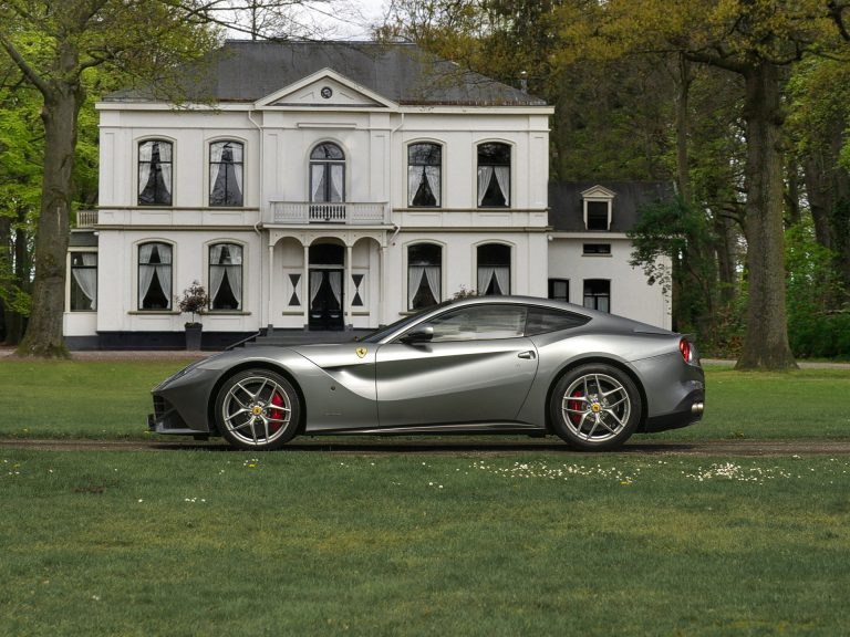 Het Grigio Titanio lakwerk is zeer slim gekozen. Gezien de peperdure lichtgewicht aankleding is deze F12 Berlinetta een racer pur sang. Maar de tamelijk ingetogen lichtgrijze kleurstelling maakt de Ferrari juist bijzonder geschikt voor gelegenheden waarbij enige vorm van elegantie en distinctie vereist is. Schreeuwerig kunnen we de 740 pk sterke 12-cilinder dus allerminst noemen. Desondanks is de Berlinetta een markante verschijning met zijn 20 inch Forged wielen, Rosso remklauwen en met chroom omrande grille. De carbon frontspoiler + dito diffusor en sideskirts garanderen een pure snelheidservaring zonder in beweging te hoeven komen. Scuderia Ferrari Shields op de voorste schermen en een op de Formule 1 geïnspireerde, centraal gepositioneerde mistachterlicht in de bumper doen er nog een serieuze scheut racesensatie bij bovenop. In het bijzonder omdat laatstgenoemde eveneens omringd wordt door koolstofvezel. Gelijktijdig heeft de set-up van de machtig mooie carrosserie ook iets weg van een stijlvolle GT. Inderdaad, de motor ligt voorin en ja de F12 is voorzien van extra ruiten opzij. Maar nee, ruimte voor meer dan één passagier zit er niet in. Misschien is dat wel beter zo, anders zouden al die gewichtsbesparende onderdelen voor niets zijn geweest…