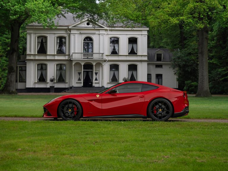 De Ferrari F12 Berlinetta betreft een waarachtig meesterwerk uit Maranello. We zijn inmiddels echt wel wat gewend van de legendarische Italiaanse autofabrikant, maar de F12 is wel één van de fraaiste creaties. Dit zit hem in het concept: een strikte 2-zitter voorzien van een traditionele configuratie. Met andere woorden: voorin veel ruimte voor de motor en een relatief gedrongen achterzijde. De artistieke openingen in de voorste schermen, direct onder de Scuderia Ferrari Shields, geleiden de luchtstroom langs het vloeiende lijnenspel opzij. Deze, maar ook de opening in de motorkap zorgt voor een optimale air-flow en dus maximale neerwaartse druk. De carbon frontsplitter en dito front flaps onderaan de voorbumper leggen extra nadruk op de baanbrekende hoeveelheid downforce die de F12 Berlinetta te bieden heeft. Verder zijn ook de sideskirts, spiegelkappen, diffusor én het karakteristieke F1-mistachterlicht gemaakt van dit peperdure, lichtgewicht materiaalsoort. En dan moet het meest opvallende nog genoemd worden: een vuurrode Rosso Corsa carrosserielak gecombineerd met zwarte Ferrari emblemen, mat-antracietkleurige uitlaateindstukken, een donkere lay-out van de enkele ronde achterlichtunits per kant en natuurlijk de 22 inch grote Vossen wielen met daarachter Rosso remklauwen. Heftig en o zo onderscheidend!