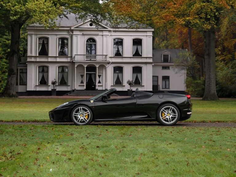 De Ferrari F430 is een ingrijpende evolutie van voorganger 360 Modena. Voor de open Spider versie geldt exact hetzelfde. De modificaties lopen uiteen van grotere luchtinlaten + luchtgeleiders tot aan scherper vormgegeven koplampunits, kleinere achterlichten die deels ‘op’ de carrosserie zijn verzonken à la Ferrari Enzo in plaats van in het achterdek te zijn geïntegreerd, gestroomlijndere buitenspiegels inclusief dubbele poot + badge, nieuwe velgdesigns en een veel grotere diffusor. Ze maken optisch een aanzienlijk verschil, in lijn met de techniek. Dit exemplaar heeft een traditionele samenstelling bestaande uit Nero Daytona lakwerk, een zwarte soft-top en zilverkleurige wielen. Erachter schuilen Giallo remklauwen en de Scuderia Shields op de voorste schermen breiden het Ferrari-geel nog wat verder uit. Voor Ferrari-rood moet u bij de glazen motorkap zijn; zo mooi als de powerunit erbij ligt, zo betoverend klinkt hij…