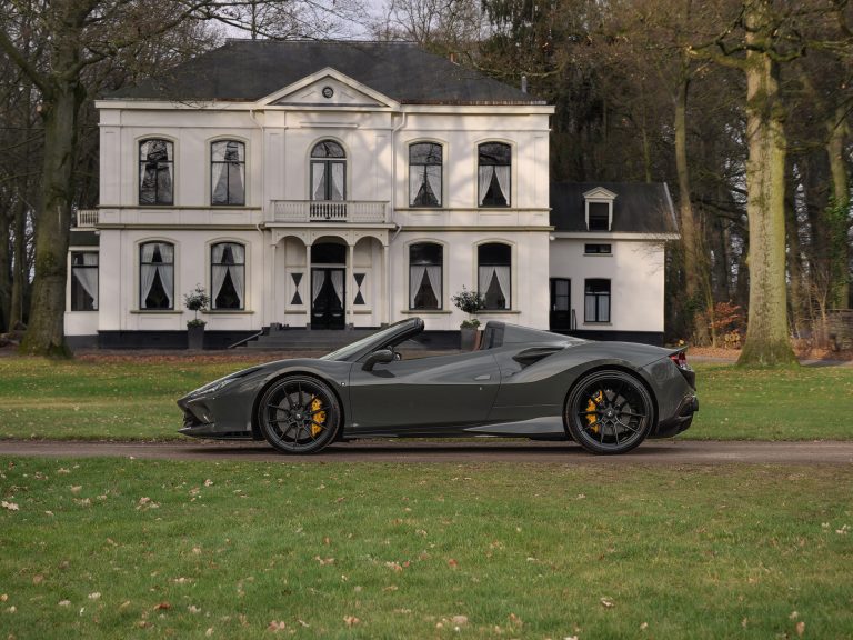 Aan een ontwerp als dat van de F8 Spider hoef je eigenlijk helemaal geen kleur toe te voegen. De carrosserie van deze Ferrari is zó geavanceerd, zó scherp en zó beeldschoon dat elke vorm van opsmuk overbodig lijkt. We schrijven bewust ‘lijkt’, want stiekem is de Italiaanse supercar heel geschikt voor een onderscheidende tint. En dat niet alleen: onze F8 barst van de exotische extra’s! Het Grigio Scuro lakwerk betreft een originele Historical Color van Ferrari. Kortom, een kleur die zich in het verleden allang heeft bewezen op klassiekers uit Maranello. Opvallender zou het contrast met de Nero livery – inclusief dubbele zwarte Racing Stripes en dito biesjes, niet kunnen. Althans, op papier. In werkelijkheid is het een droomconfiguratie voor de fijnproevers onder ons. Extra hightech elementen zijn er in de vorm van matzwarte Novitec wielen, Sport Tailpipe tips en heel veel carbon. Waaronder op de diffusor, front air vents, front spoiler én side skirts. Ondertussen staan de Giallo remklauwen er alleen voor, want van de Scuderia Ferrari Shields ontbreekt ieder spoor. Waarom? Het zou enkel afleiden van andere Ferrari logo’s, zoals die op de carbon naafkappen in de Center Lock Wheels… Gewoon wauw.