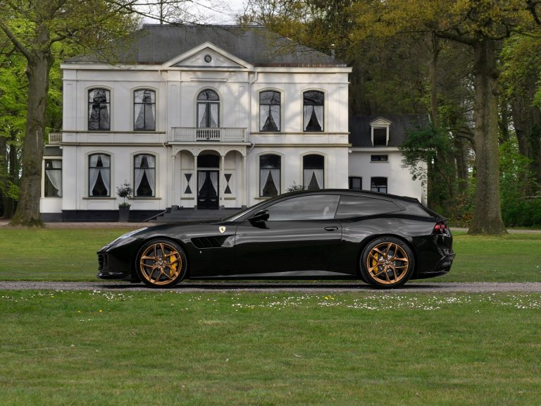 Niet alle Italiaanse pasta hoeft met Rosso saus te worden gegeten. De gitzwarte Nero Daytona carrosserie van deze Ferrari GTC4Lusso smaakt zeker naar meer. Vooral ook omdat het ingrediënten bevat waarmee menig fijnproever omver wordt geblazen: 20 inch mat gouden wielen met daarachter Giallo remklauwen geven het duister getinte raspaard van opzij een wel érg onderscheidende look. Scuderia Ferrari Shields op de voorste schermen doorbreken de inktzwarte lak en dito ramen achter. Aan het front maakt een carbon onderlipspoiler het verschil. De Italiaanse tricolore pronkt op de achterzijde, mocht u vergeten zijn in welk land deze smaakmaker bereid is. Zelden zagen we een dergelijke samenstelling in ons assortiment, laat staan in combinatie met een elegante 2+2 GT. De Shooting Brake configuratie blijkt echter een opvallend goede match. Gedurfd, maar opvallend goed.