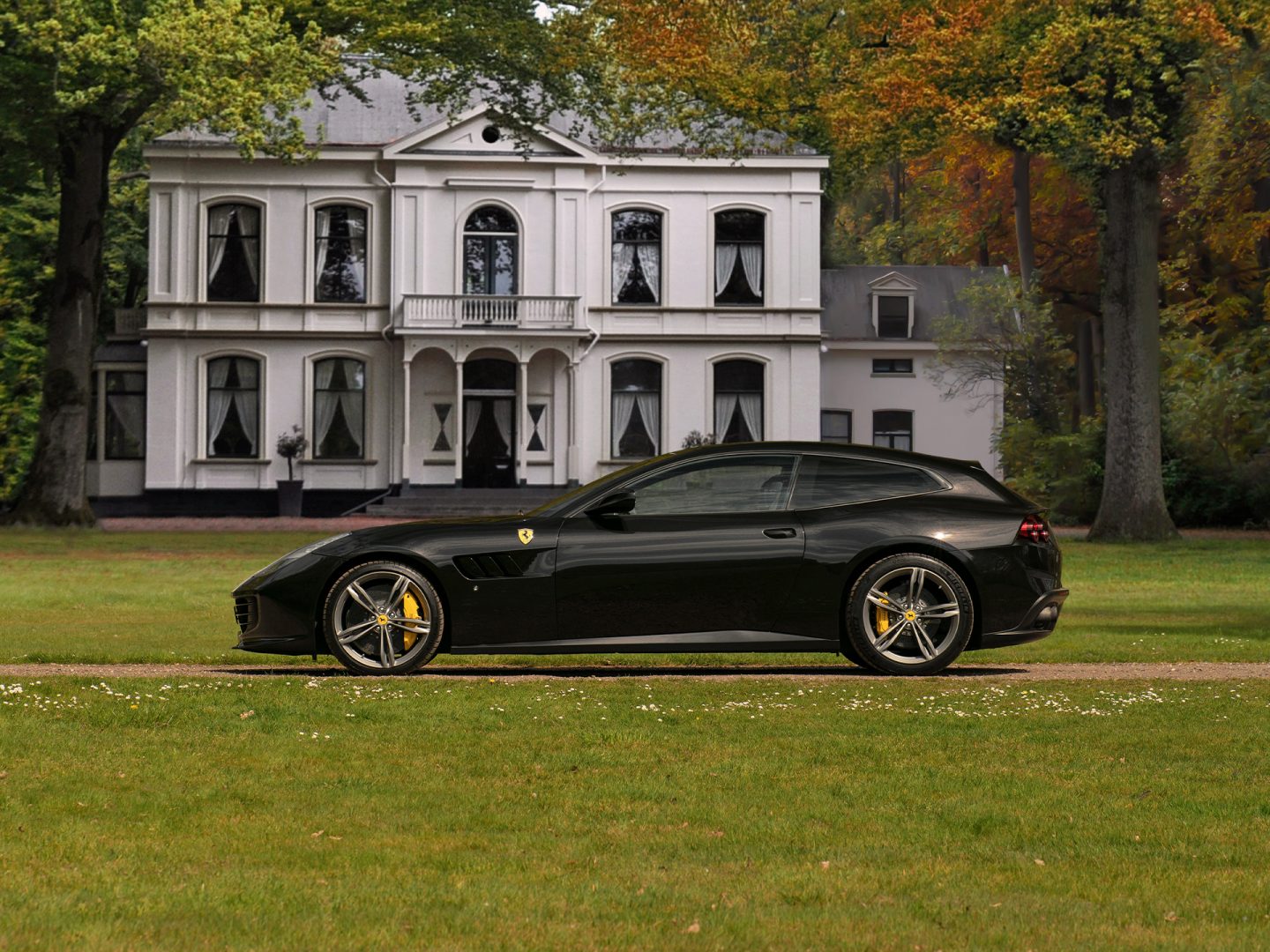 Het Nero Daytona lakwerk geeft deze Black Beauty een mysterieus tintje. Letterlijk. Maar de mystiek omtrent het zwarte raspaard is pas écht compleet dankzij de toevoeging van 20 inch Forged Dark Painted Rims, Dark Edged Front Grill, Black Ceramic Exhaust Pipes en zwartgeblakerde logo’s voor + achter. Des te fraaier is de manier waarop de knalgele details afsteken. En wel in de vorm van Scuderia Ferrari Shields op de voorste schermen en Giallo remklauwen rondom. Denk alle opsmuk weg en een bijzonder opvallend design is wat overblijft. De shooting-brake achtige karakteristieken nam de GTC4Lusso klakkeloos over van voorganger Ferrari FF. Terecht. Want ondanks de tamelijk radicale designfilosofie, is de GTC4 een uiterst elegante verschijning, inclusief – traditioneel voor de Ferrari V12 GT’s – lekker lange motorkap en een vloeiend lijnenspel. De dubbele ronde achterlichtunits laten zien dat dit een Ferrari is van de nieuwste lichting.
