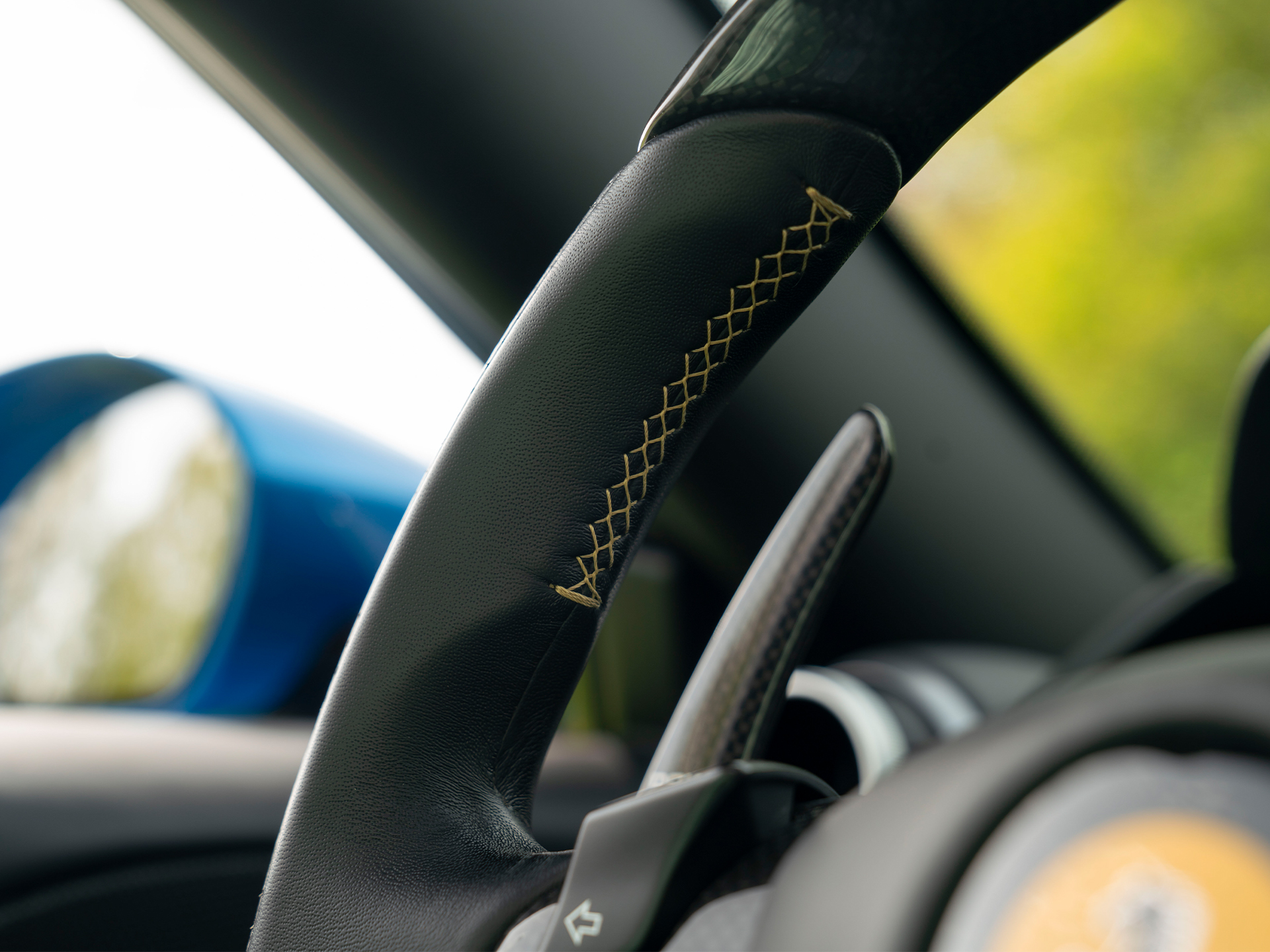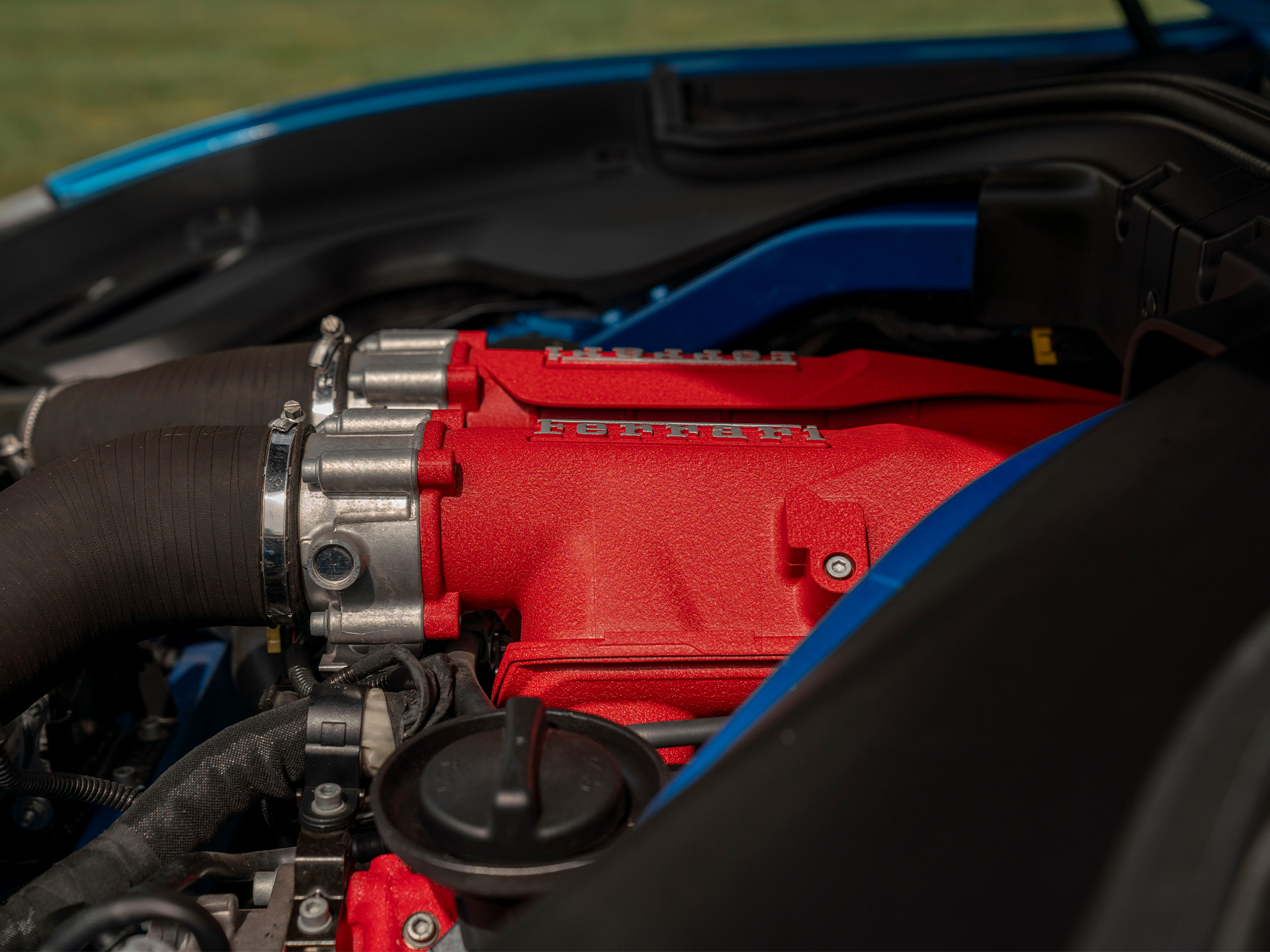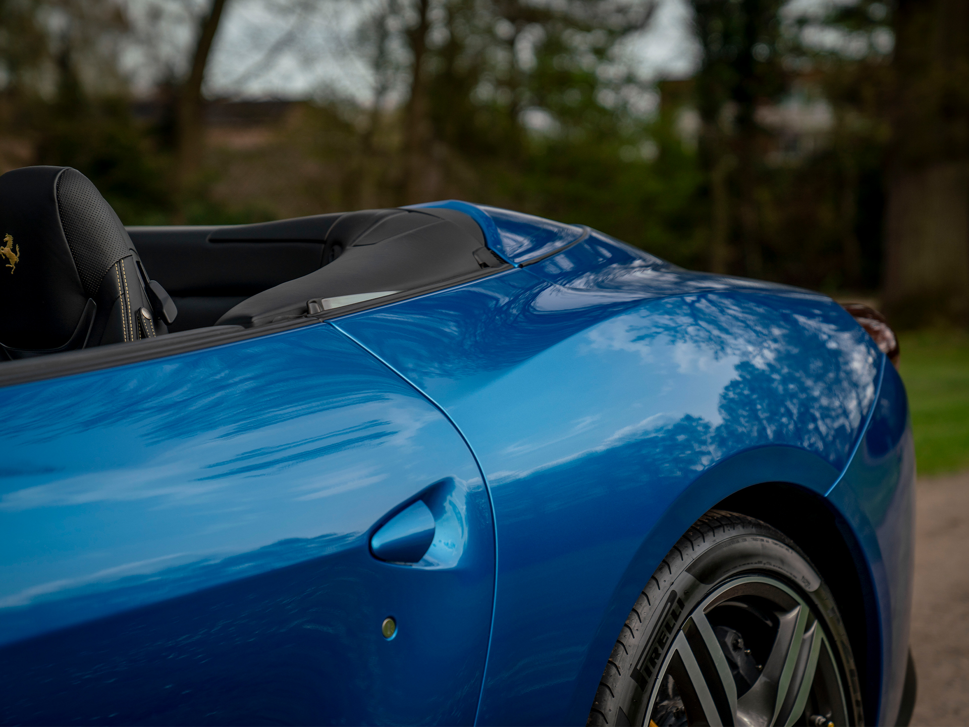 Is Blu Corsa de eerste de beste kleur die in ons opkomt bij het horen vallen van de naam Ferrari Portofino? Allesbehalve. Hoe staan we daar nu in? Compleet anders! Bij het zien van de super strakke, 2-laagse oceaanblauwe lak wanen we ons spontaan aan de Italiaanse kust. Maar de Riviera en deze Portofino hebben meer gemeen: beide zijn eersteklas pareltjes. De charme en de flair spatten er vanaf. Let ook op details zoals de zwarte grille voorzien van chromen Cavallino’s. Het metalen dak (Zwart gewrapt, origineel Blu Corsa!), hoe mooi ook, is op haar best wanneer deze achter de Daytona Seats verdwijnt. En zo hoort het: de coupé-convertible is op de eerste plaats een cabrio! Bestemd voor Prinselijke ritten op bergwegen en langs het strand. Op nabijgelegen circuits komt het ware race-DNA evengoed bovendrijven. Schroom dus niet om af en toe een uitstapje te wagen richting bijvoorbeeld Monaco… Kunt u meteen de boulevard en het casino meepakken. Met gepolijste 20 inch Forged wielen, Giallo remklauwen en Scuderia Ferrari Shields op de voorschermen, komt u sowieso in stijl voorgereden – ongeacht de bestemming.