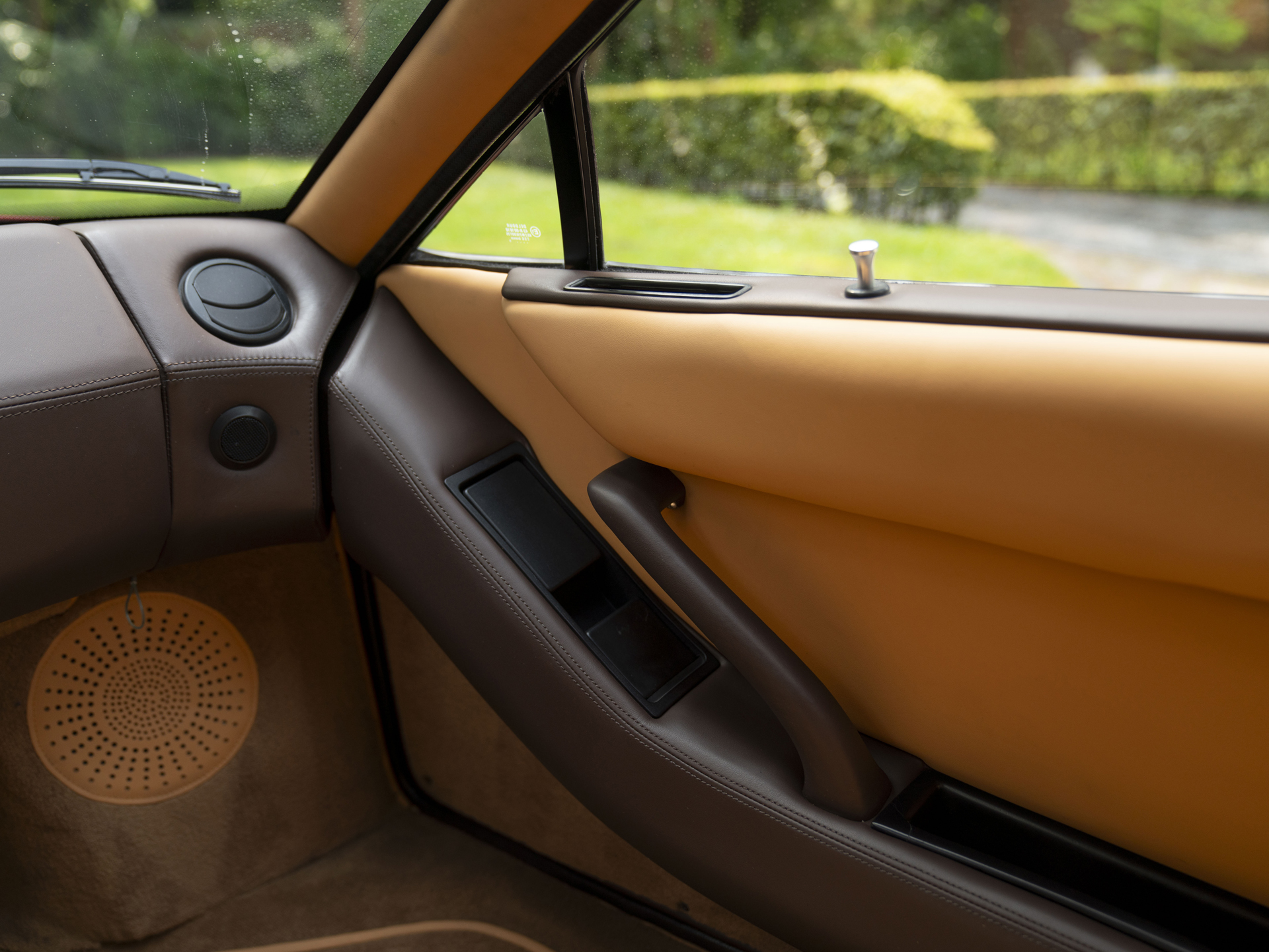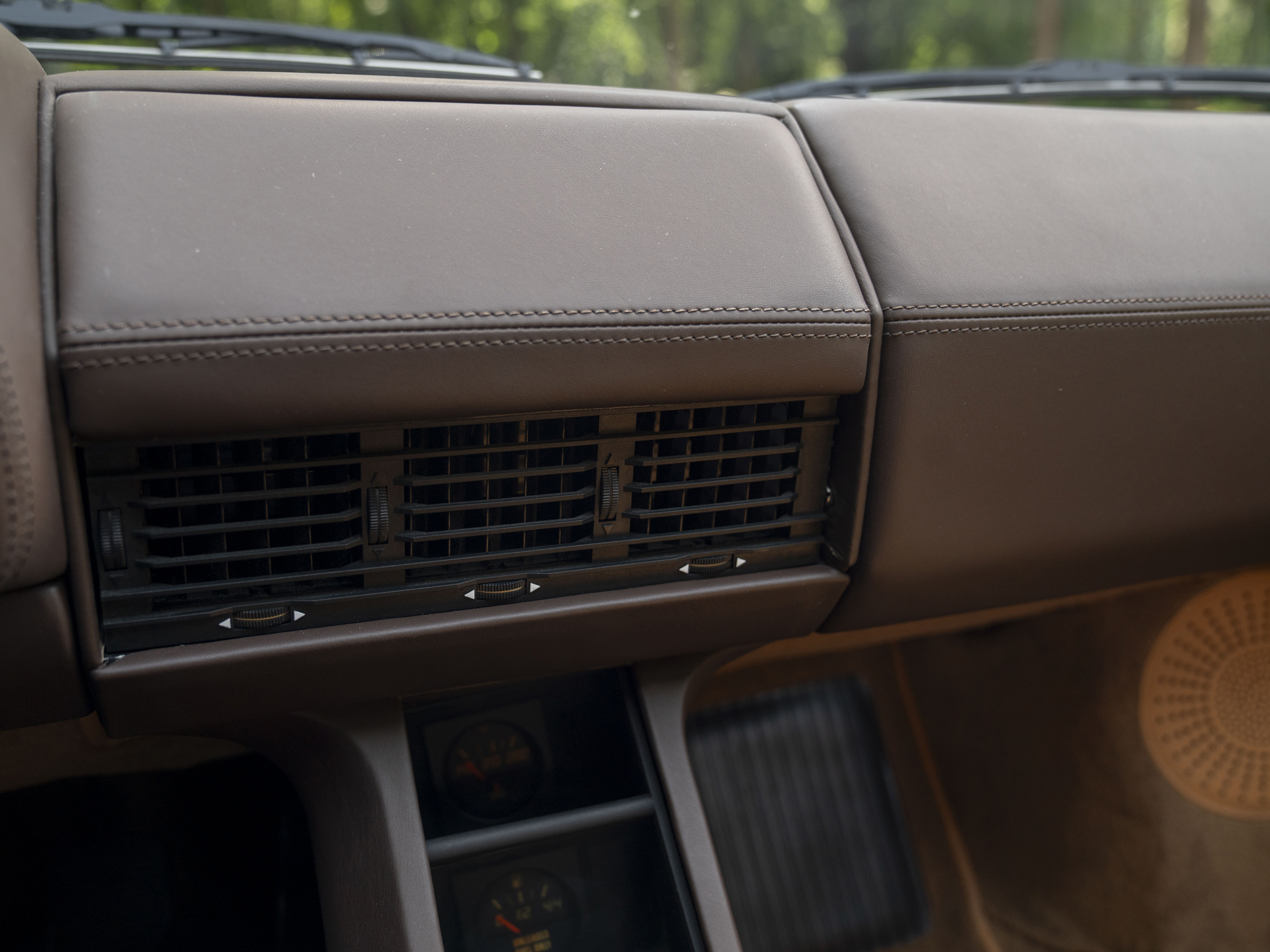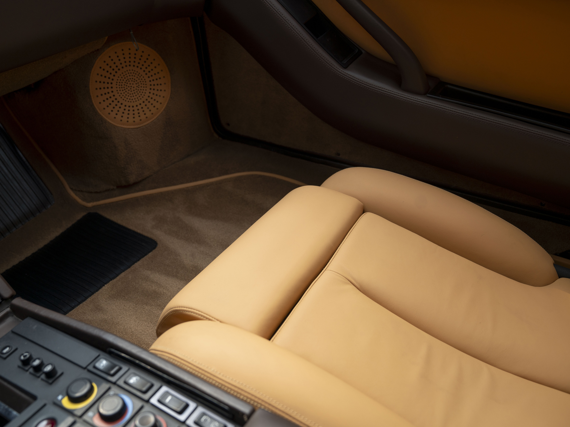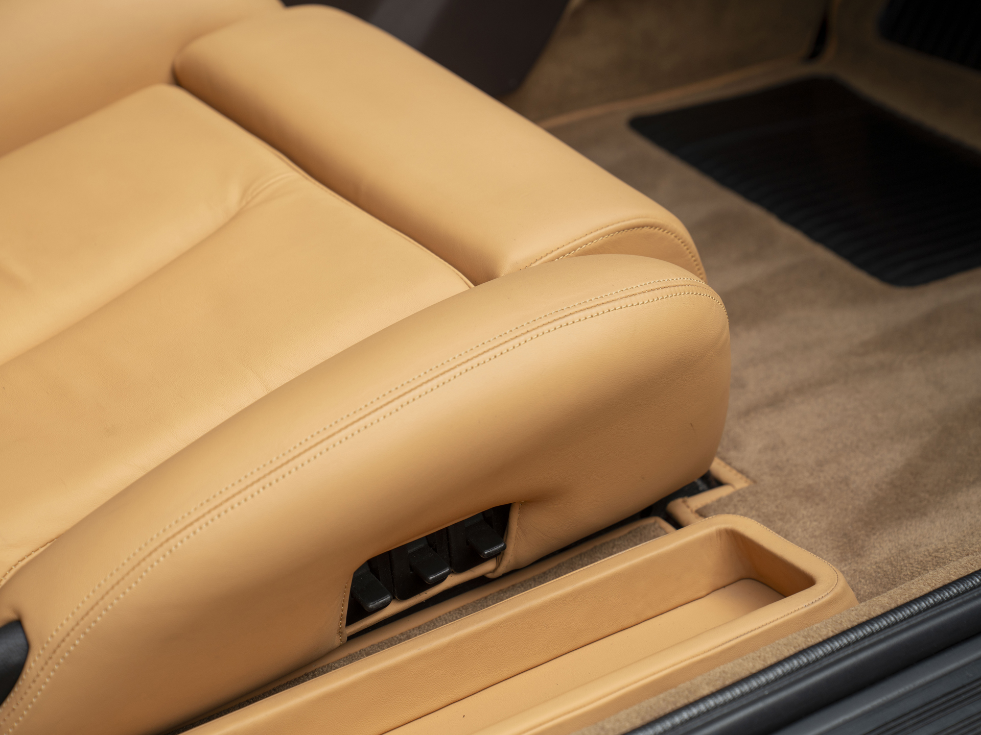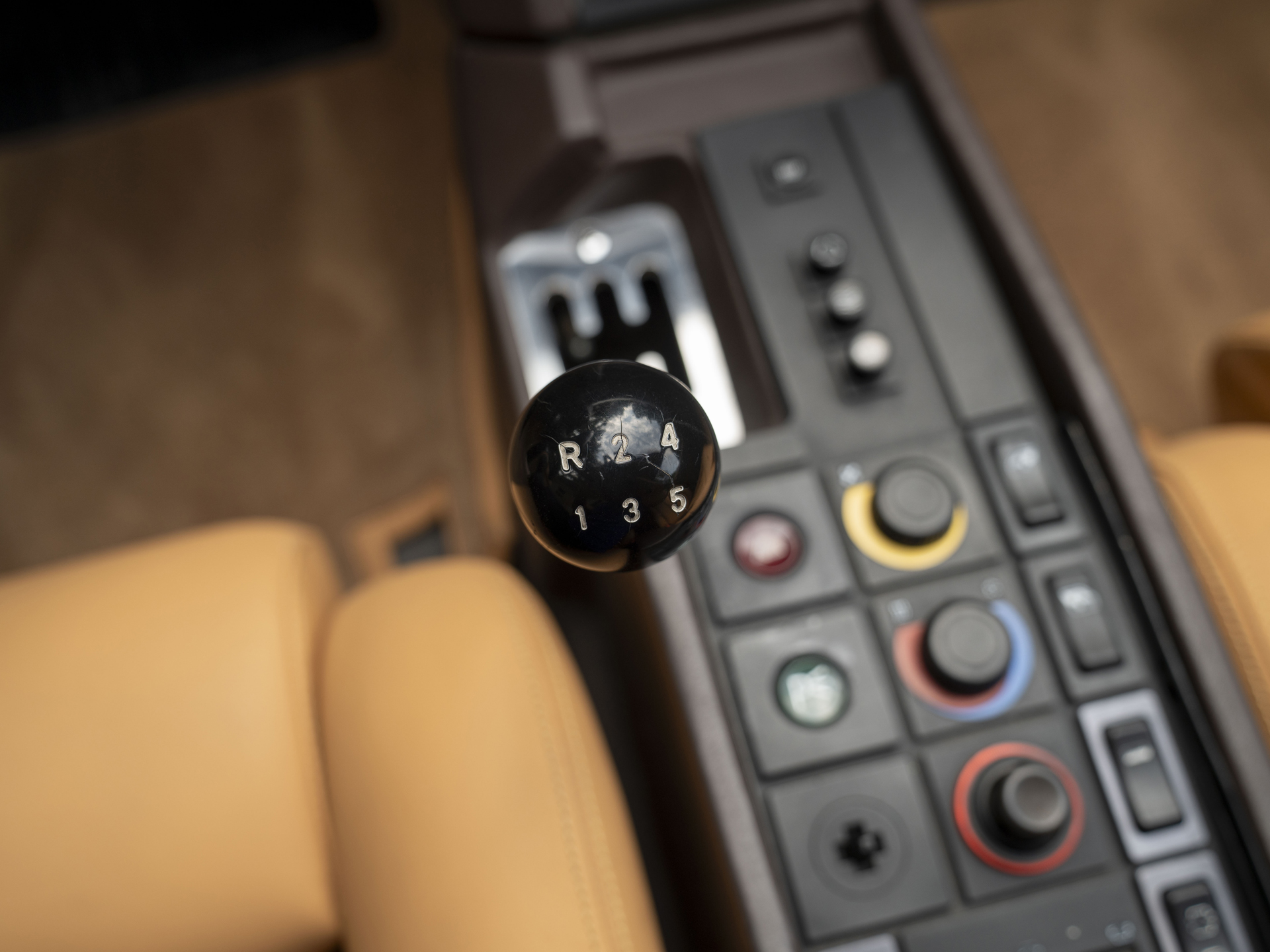 Menig liefhebber zou voor een Nero lederen interieur hebben getekend, echter deze combinatie van Beige lederen stoelen met een bruin lederen dashboard is toch wel de absolute droomspecificatie voor kenners. De smetteloze staat maakt dat dit geen klassieker, maar een tijdmachine is. Wie een beetje nostalgisch is aangelegd, zal bijzondere gevoelens krijgen bij het zien van het hoekige instrumentarium en de schitterend uitgefreesde aluminium schakelcoulissen van de manuele transmissie met klassiek H-patroon. Let ook op de contraststiksels in het minimalistisch vormgegeven Nero lederen Momo-stuurwiel!