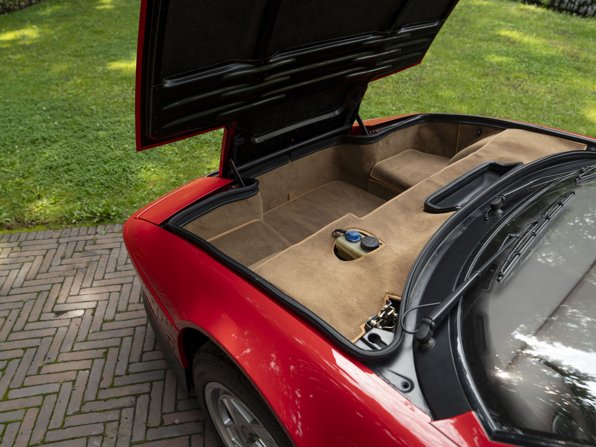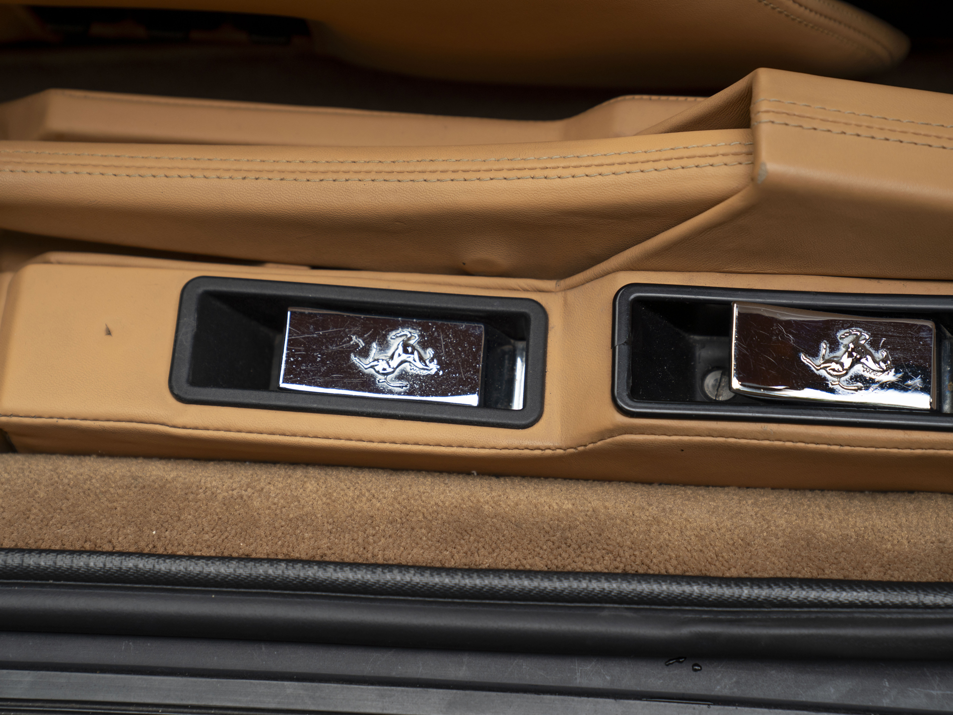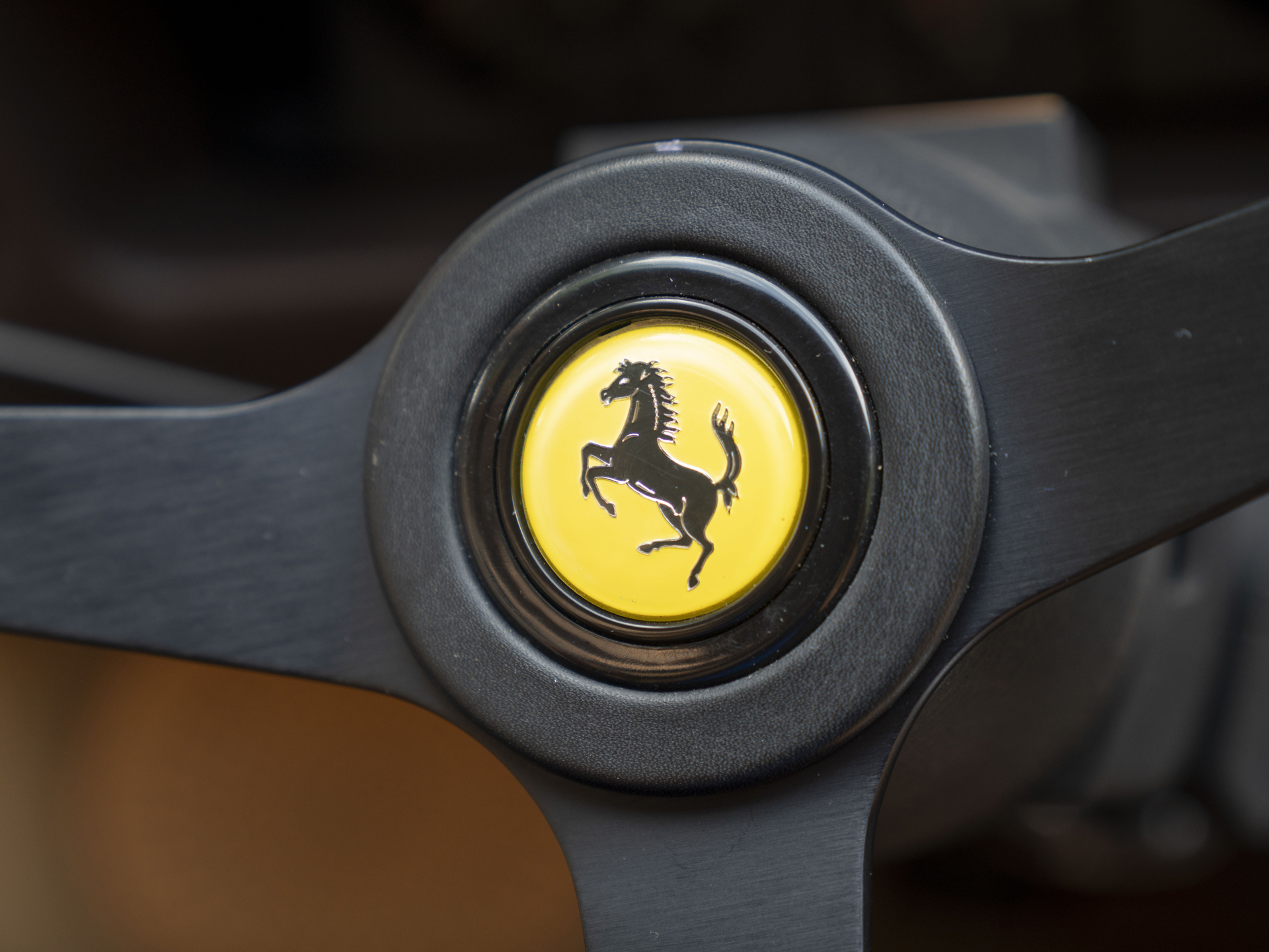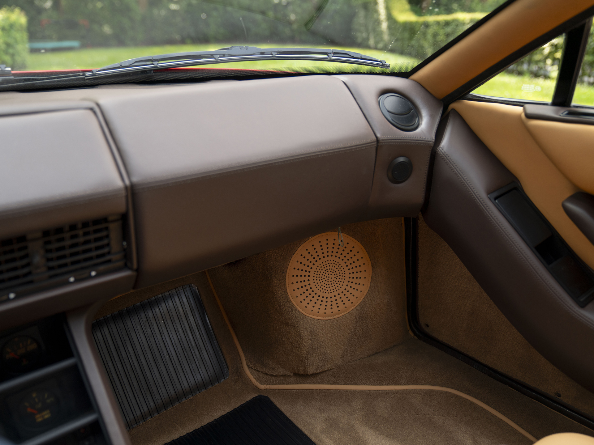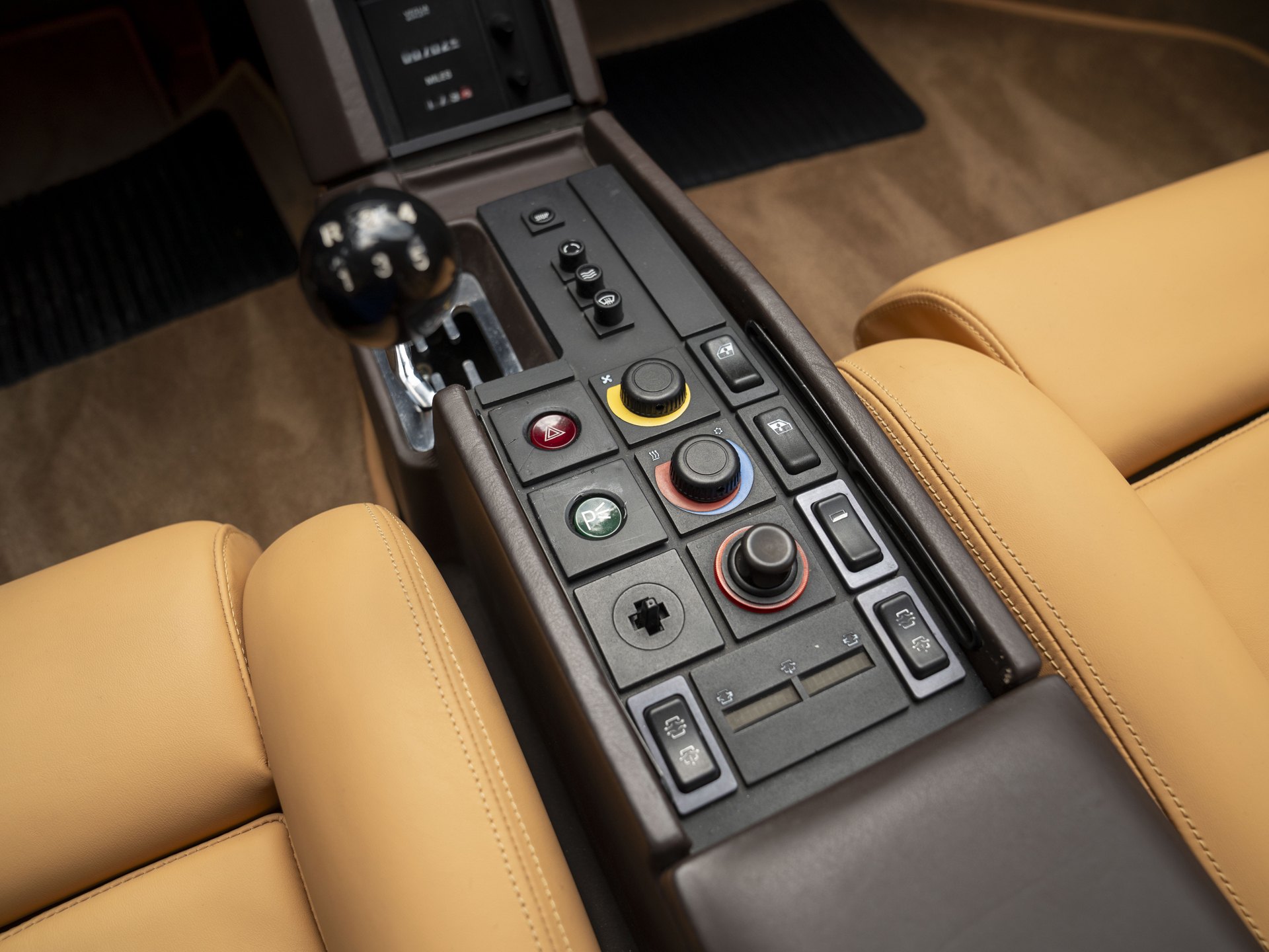 Menig liefhebber zou voor een Nero lederen interieur hebben getekend, echter deze combinatie van Beige lederen stoelen met een bruin lederen dashboard is toch wel de absolute droomspecificatie voor kenners. De smetteloze staat maakt dat dit geen klassieker, maar een tijdmachine is. Wie een beetje nostalgisch is aangelegd, zal bijzondere gevoelens krijgen bij het zien van het hoekige instrumentarium en de schitterend uitgefreesde aluminium schakelcoulissen van de manuele transmissie met klassiek H-patroon. Let ook op de contraststiksels in het minimalistisch vormgegeven Nero lederen Momo-stuurwiel!