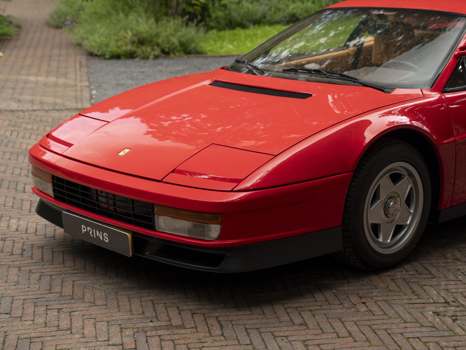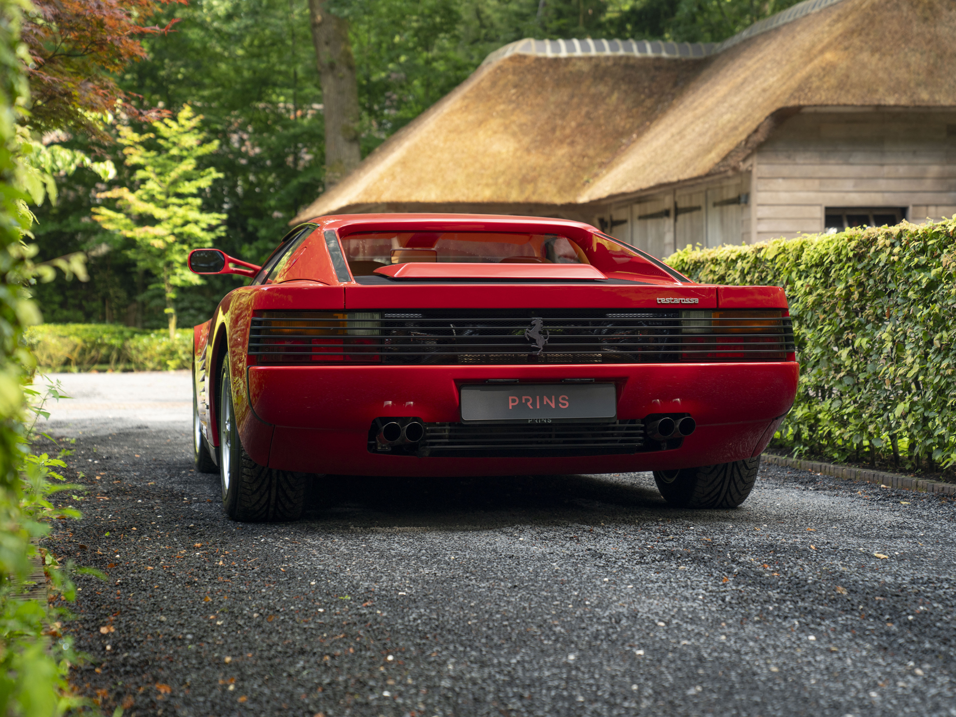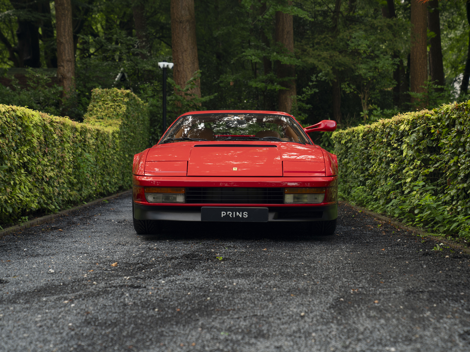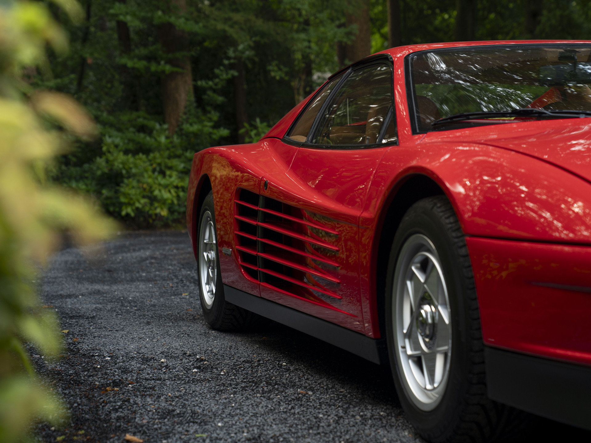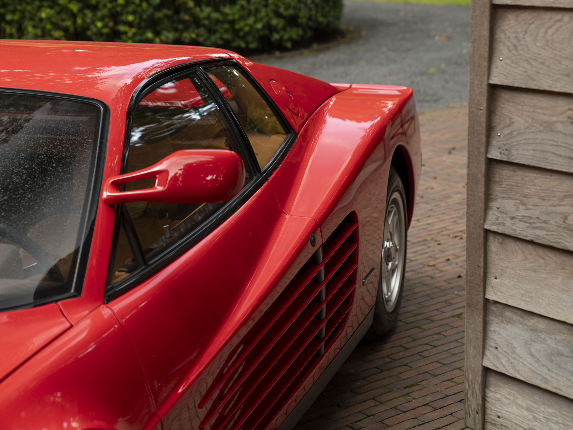 Zonder Testarossa had de toekomst van Ferrari er heel anders kunnen uitzien. Dit karakteristieke model drukte zijn stempel op het merkimago zoals we dat nog nooit eerder hebben gezien. Met zijn vlijmscherpe koets en buitengewone styling is de sportauto te herkennen uit duizenden. Juist in een Rosso Corsa kostuum. De uitvoering én conditie van dit exemplaar is simpelweg ‘perfetto’: het origineel had immers één enkele buitenspiegel (Monospecchio) die opvallend hoger was geplaatst op de A-stijl, plus velgen voorzien van een sterdesign met één centrale wielmoer: de Monodado. Kortom, precies zoals Sonny Crockett ‘m ook had. Die van ons is echter beduidend netter, want deze vurige Italiaan werd allesbehalve ingezet om met 390 paarden tegelijk op jacht te gaan naar schurken. Maar de onmiskenbare ‘slats’ die de achterlichten ‘coveren’, of de aerodynamische ‘vinnen’ die naar de koelradiatoren achter de portieren leiden, hebben niet minder indruk gemaakt op de samenleving…