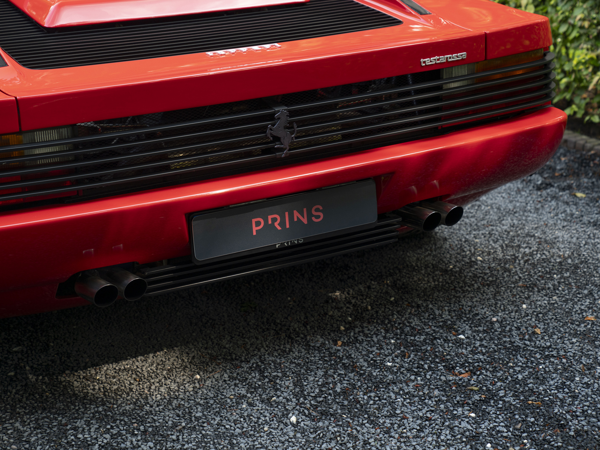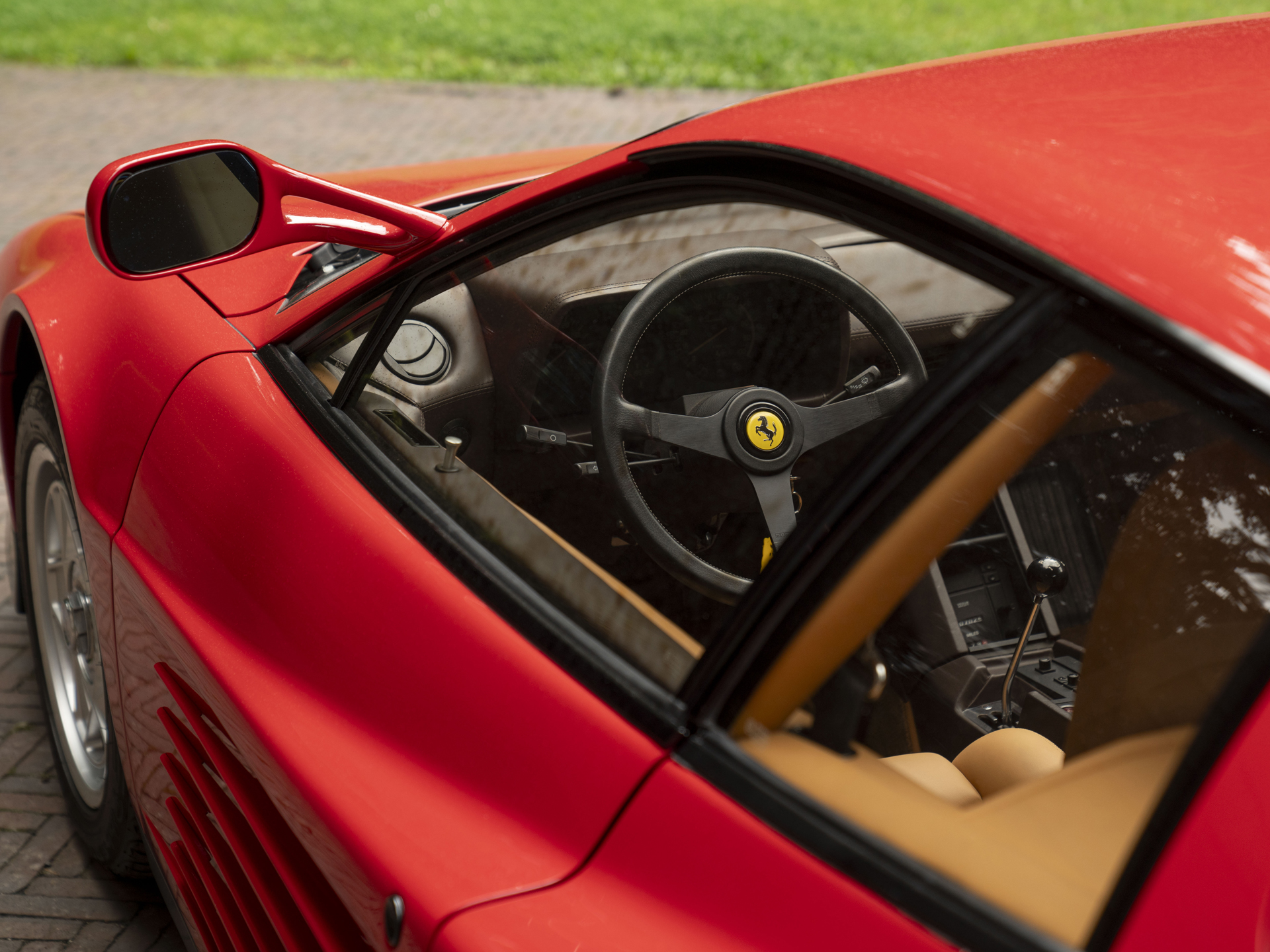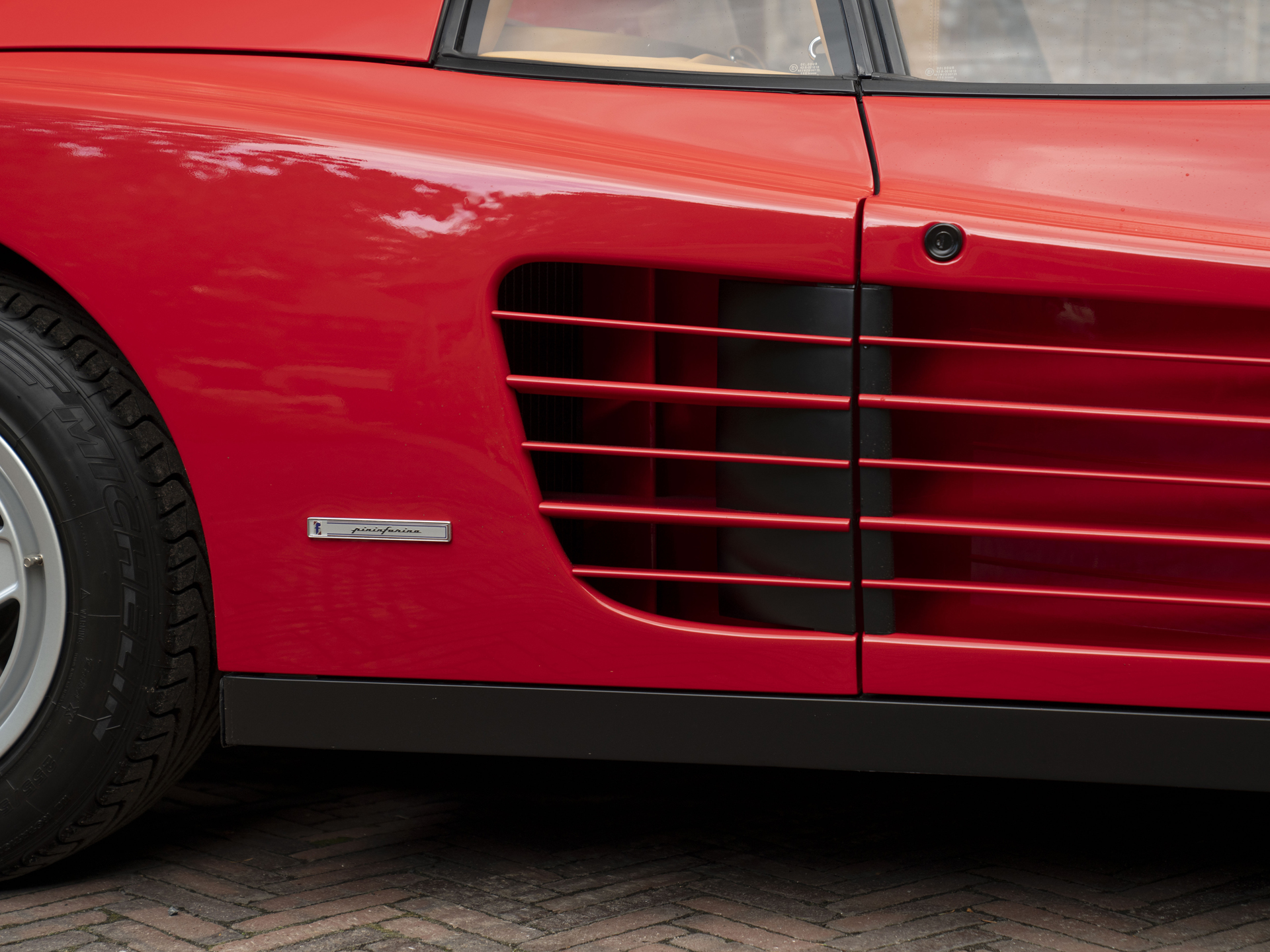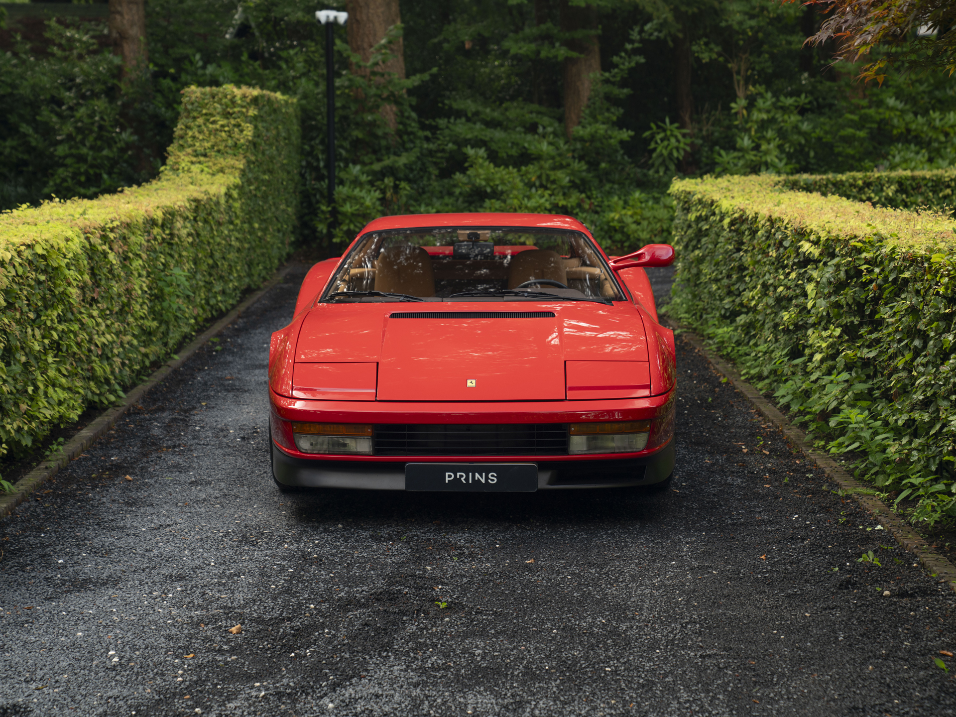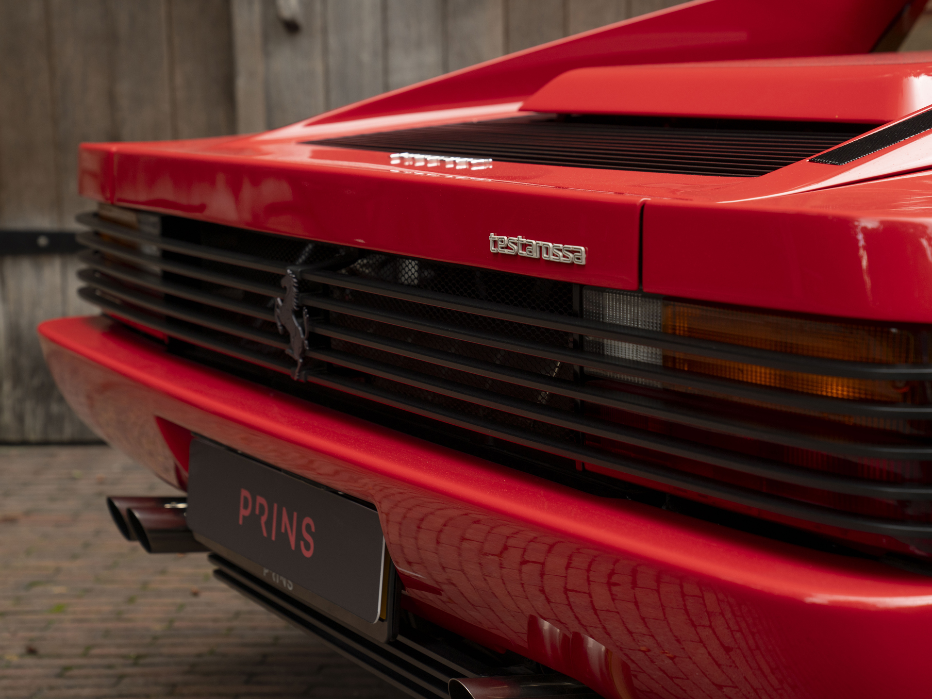 Zonder Testarossa had de toekomst van Ferrari er heel anders kunnen uitzien. Dit karakteristieke model drukte zijn stempel op het merkimago zoals we dat nog nooit eerder hebben gezien. Met zijn vlijmscherpe koets en buitengewone styling is de sportauto te herkennen uit duizenden. Juist in een Rosso Corsa kostuum. De uitvoering én conditie van dit exemplaar is simpelweg ‘perfetto’: het origineel had immers één enkele buitenspiegel (Monospecchio) die opvallend hoger was geplaatst op de A-stijl, plus velgen voorzien van een sterdesign met één centrale wielmoer: de Monodado. Kortom, precies zoals Sonny Crockett ‘m ook had. Die van ons is echter beduidend netter, want deze vurige Italiaan werd allesbehalve ingezet om met 390 paarden tegelijk op jacht te gaan naar schurken. Maar de onmiskenbare ‘slats’ die de achterlichten ‘coveren’, of de aerodynamische ‘vinnen’ die naar de koelradiatoren achter de portieren leiden, hebben niet minder indruk gemaakt op de samenleving…