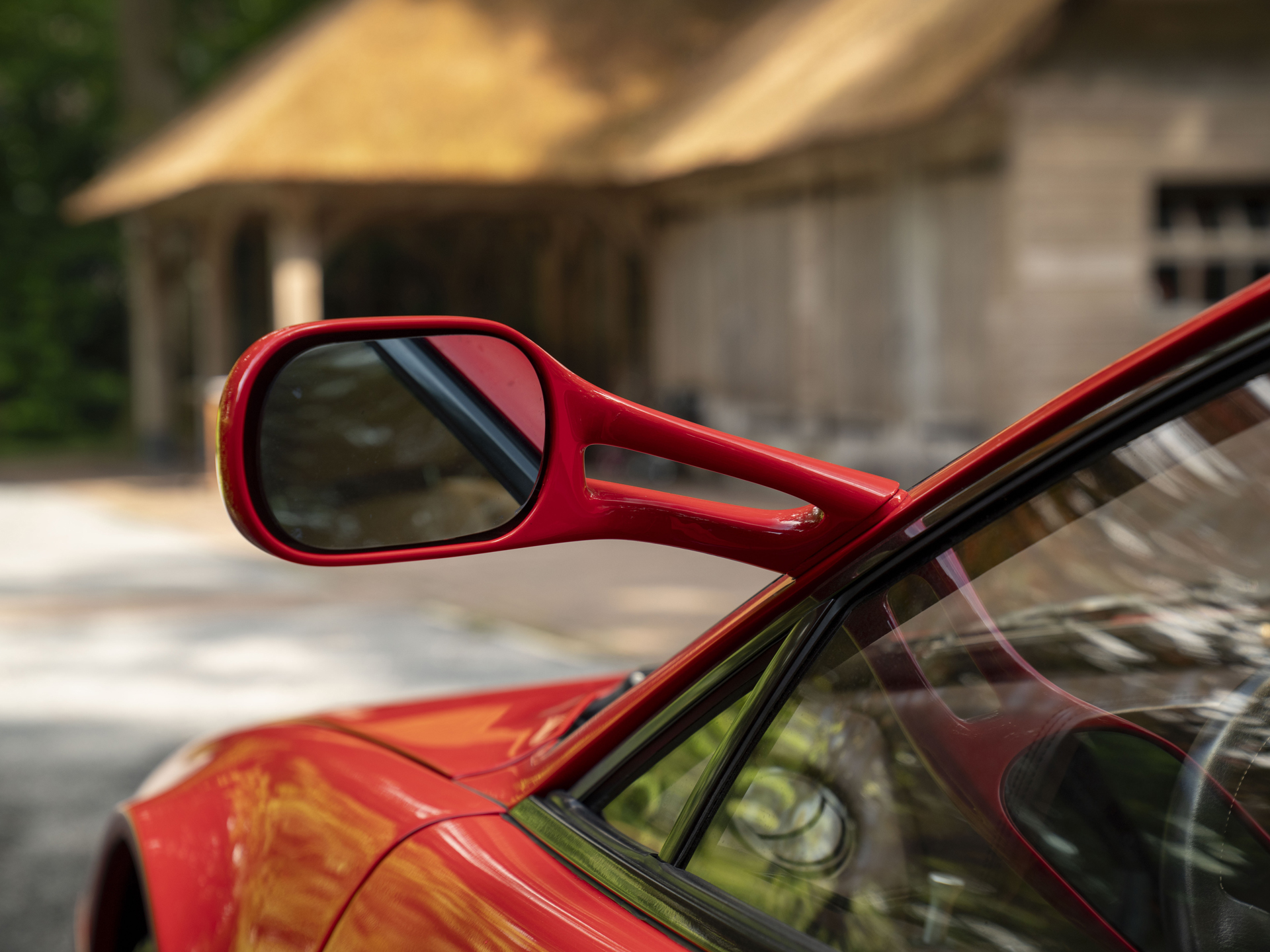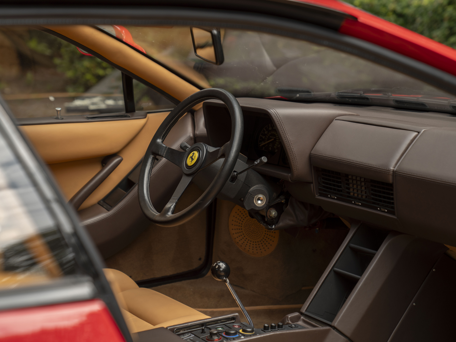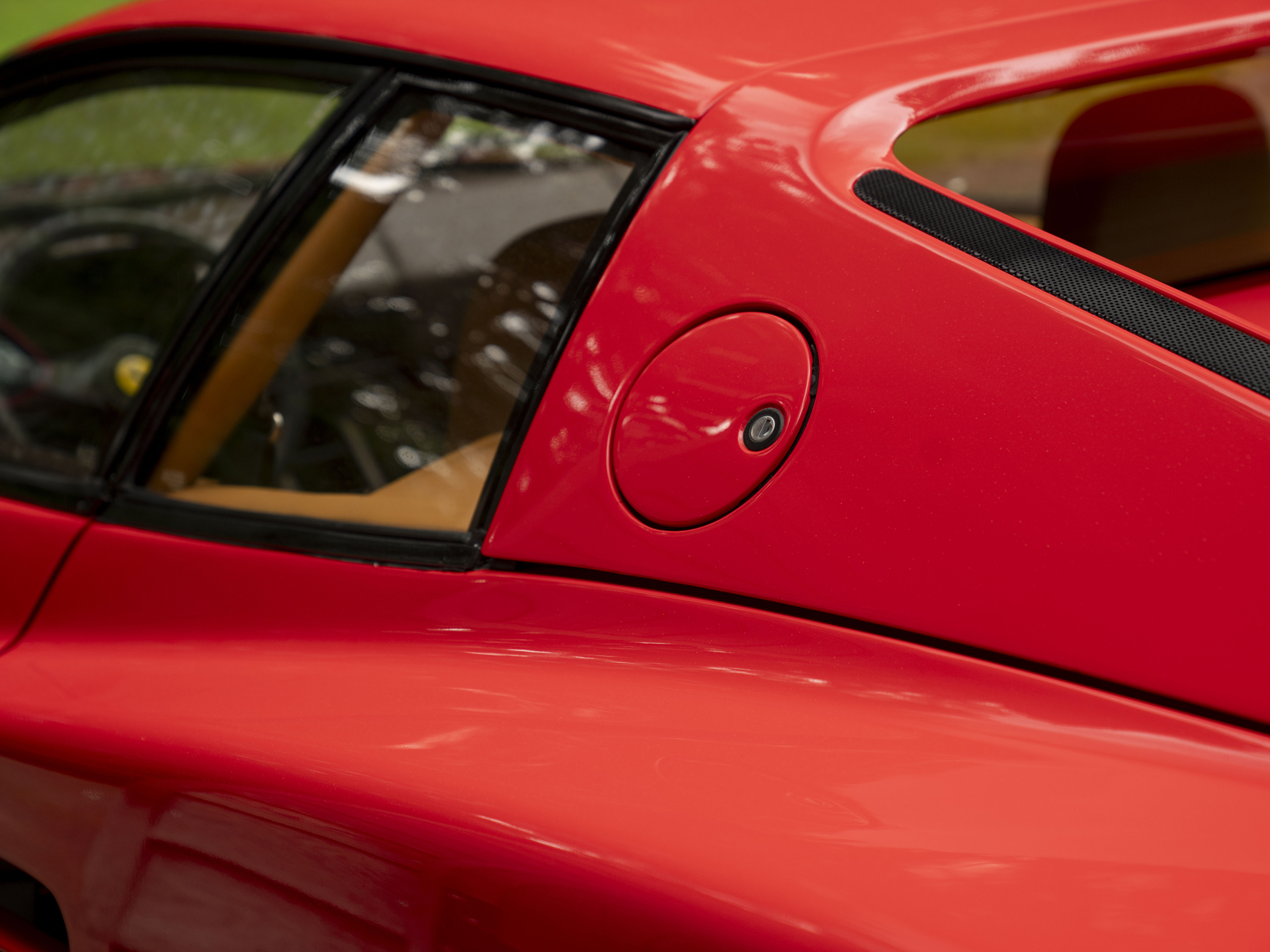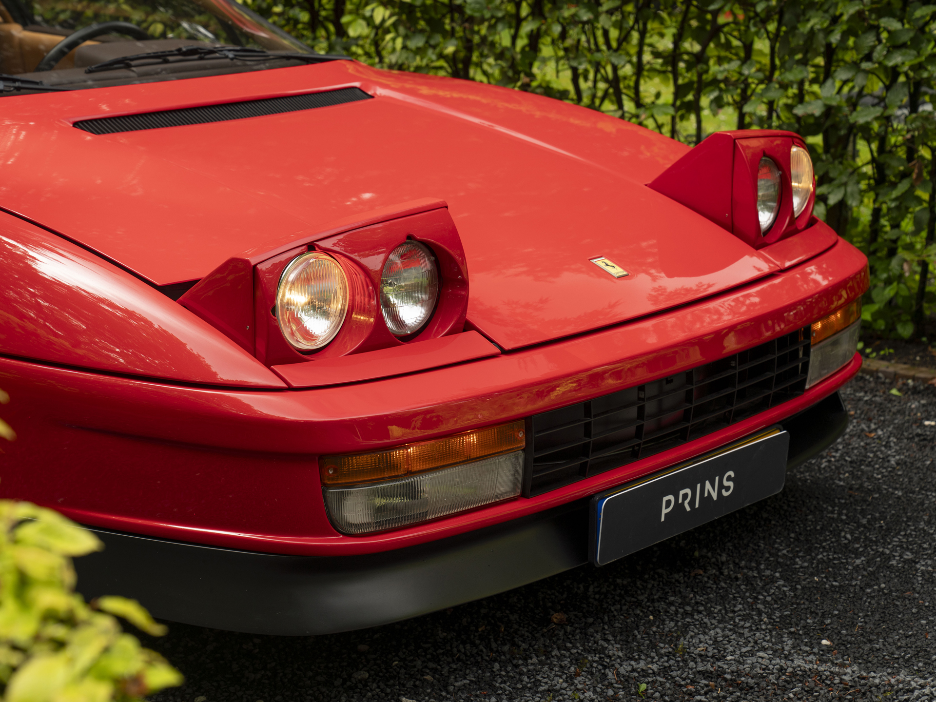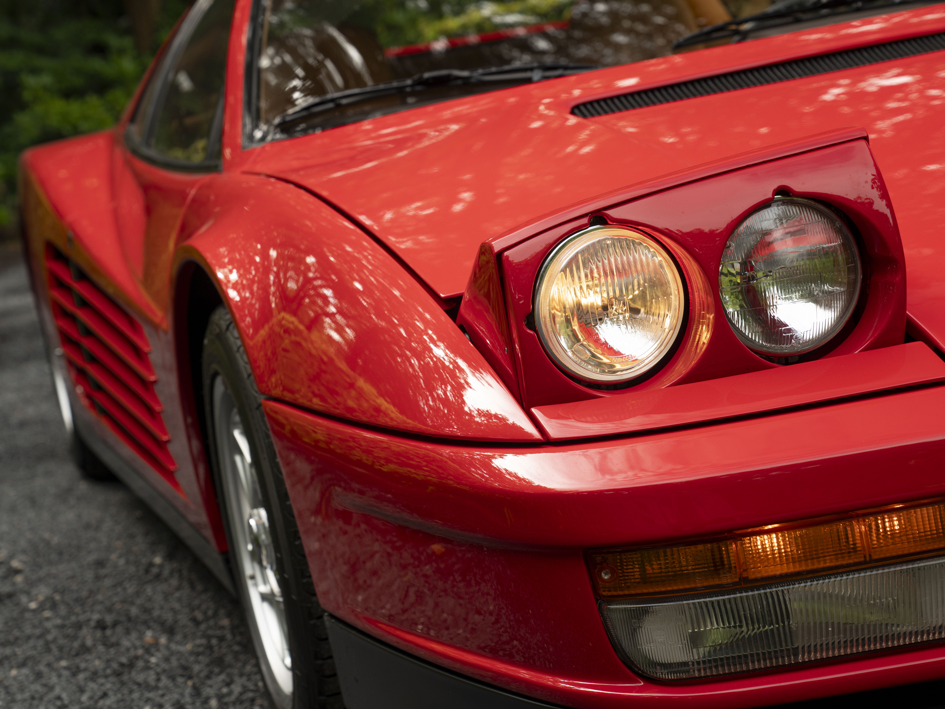 Zonder Testarossa had de toekomst van Ferrari er heel anders kunnen uitzien. Dit karakteristieke model drukte zijn stempel op het merkimago zoals we dat nog nooit eerder hebben gezien. Met zijn vlijmscherpe koets en buitengewone styling is de sportauto te herkennen uit duizenden. Juist in een Rosso Corsa kostuum. De uitvoering én conditie van dit exemplaar is simpelweg ‘perfetto’: het origineel had immers één enkele buitenspiegel (Monospecchio) die opvallend hoger was geplaatst op de A-stijl, plus velgen voorzien van een sterdesign met één centrale wielmoer: de Monodado. Kortom, precies zoals Sonny Crockett ‘m ook had. Die van ons is echter beduidend netter, want deze vurige Italiaan werd allesbehalve ingezet om met 390 paarden tegelijk op jacht te gaan naar schurken. Maar de onmiskenbare ‘slats’ die de achterlichten ‘coveren’, of de aerodynamische ‘vinnen’ die naar de koelradiatoren achter de portieren leiden, hebben niet minder indruk gemaakt op de samenleving…