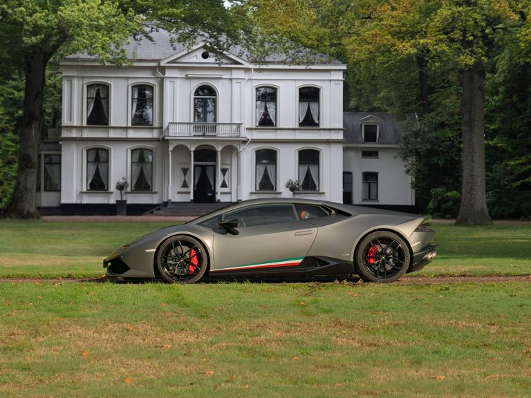U komt letterlijk ogen en oren tekort tijdens een ontmoeting met deze buitenaardse creatie. Wat betreft het visuele aspect onderscheidt de Huracán zich uiteraard met zijn excentrieke Lambo-profiel, te herkennen aan de korte en vlakke neus die optisch in één lijn wordt doorgetrokken tot en met de voorruit. Het dak is dermate laag dat deze bijna horizontaal overgaat in de C-stijl. Ook de stompe achterzijde met sterke wigvorm is typisch Lamborghini sinds de komst van de klassieke Countach. Geen supercar zoals deze Huracán LP-610; de Grigio Titans carrosserie is zo mat als het maar kan. Maar oogt nog heftiger in combinatie met 20 inch hoogglans zwarte Mimas Forged wielen en dito buitenspiegels + sideskirts. De striping bovenop de Italiaan is eveneens zwart en de Engine Bay is zelfs matzwart. Het Akrapovič uitlaatsysteem beschikt over een carbon afwerking; lekker racy. Rode remklauwen en een Tricolore striping op de portieren geven ons brute snelheidswonder een vleugje frivoliteit. Niet te veel natuurlijk, want sturen in dit circuitmonster voor op de openbare weg is een serieuze zaak…