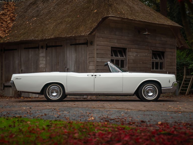 De Lincoln Continental is een unieke verschijning in Europa, maar heeft een geweldig lange en indrukwekkende loopbaan achter de rug in Amerika: 85 jaar geleden kwam het model op de markt, waarvan het 1e prototype in 1939 verscheen. Generatie 1 ging een jaar later in productie, echter generatie 4 van in totaal 10 is veruit de beroemdste. Het model werd onder andere gebruikt als “Presidential state car”, met de op maat gemaakte Limousine van John F. Kennedy als waarschijnlijk de meest notoire dienstwagen ter wereld. Ons exemplaar is van de 3e en laatste serie – gebouwd tussen 1966-1969, en heeft dus 2 facelifts achter zijn naam staan. Deze specifieke serie is te herkennen aan zijn hoekigere front met uitgeschreven modelnaam en strakgetrokken grille. Aan de achterkant vallen de grille-achtige kappen op die over de luchtunits zijn geplaatst. Wat bleef was het riante chroomwerk (inclusief extra rand onderlangs de dorpels), de 4 ronde koplampen en natuurlijk de reusachtige afmetingen met enorme overhang achter. Typerend zijn tevens de 2 extra portieren alias “suicide doors” die achterstevoren openen. Ondanks de comfortabele instap achterin werd speciaal voor JFK dus een (nog) langere Limousine versie naar een Convertible omgebouwd. De conditie van onze witte slee is overigens heel behoorlijk, zeker gezien zijn leeftijd. De techniek verkeert zelfs in zeer goede staat! Daarover gesproken: ‘natuurlijk’ wordt de ruim 5,5 meter lange gigant aangedreven door een échte big-block: voor de serie uit ‘66 werd de magische 8-cilinder zowaar opgeboord tot een inhoud van maar liefst 7,6 liter! “Whatever you’re thinking, think bigger.” Nu exclusief bij Prins.
