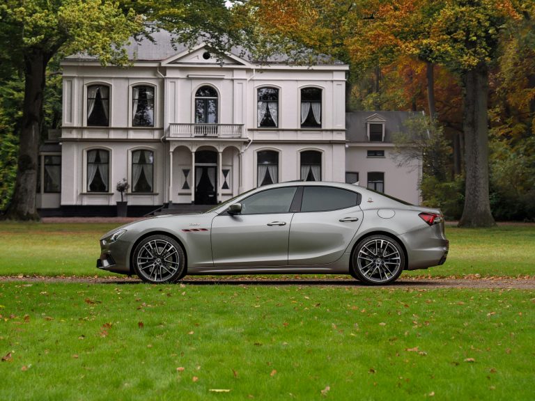 De Maserati Ghibli behoort niet tot een uitstervend ras. Het is de enige in zijn soort. Altijd al geweest. Waar we zogenaamde ‘concurrenten’ gemakkelijk over één kam kunnen scheren met hun zakelijke ‘premium’ uitstraling, voorzien de Italianen hun drietand in de compacte limousine klasse doodleuk van een extreem charismatisch kostuum vol tijdloze flair en opwindende sportiviteit. Daarvan is de Ghibli Trofeo het summum: het model leunt op de meest recente updates die de 4-deurs onderging, en giet daar nog wat extra jeu overheen. Kenmerkend voor het 580 pk sterke topmodel zijn onder andere de 21 inch grote Orione Forged Dark velgen en Rosso randen langs de klassieke coolings slots in de voorste schermen. Zeer fraai is de toevoeging van een Carbon Exterior Pack, welke een koolstofvezel finish van de bumperspoilers en diffusor omvat. Samen met de Nero remklauwen, 4 zwarte uitlaateindstukken, dito raamlijsten + grille en deels antraciet gekleurde wielen zorgt het carbon voor een prachtig uitgebalanceerd contrast met de Grigio carrosserielak. Verder profiteert ons exemplaar van de scherper getekende bumpers, sideskirts en luchtinlaten van de eerdere facelift. Dit is nu wat we noemen: maximaal onderscheid zonder schreeuwerig te worden bevonden. Oftewel, precies goed!