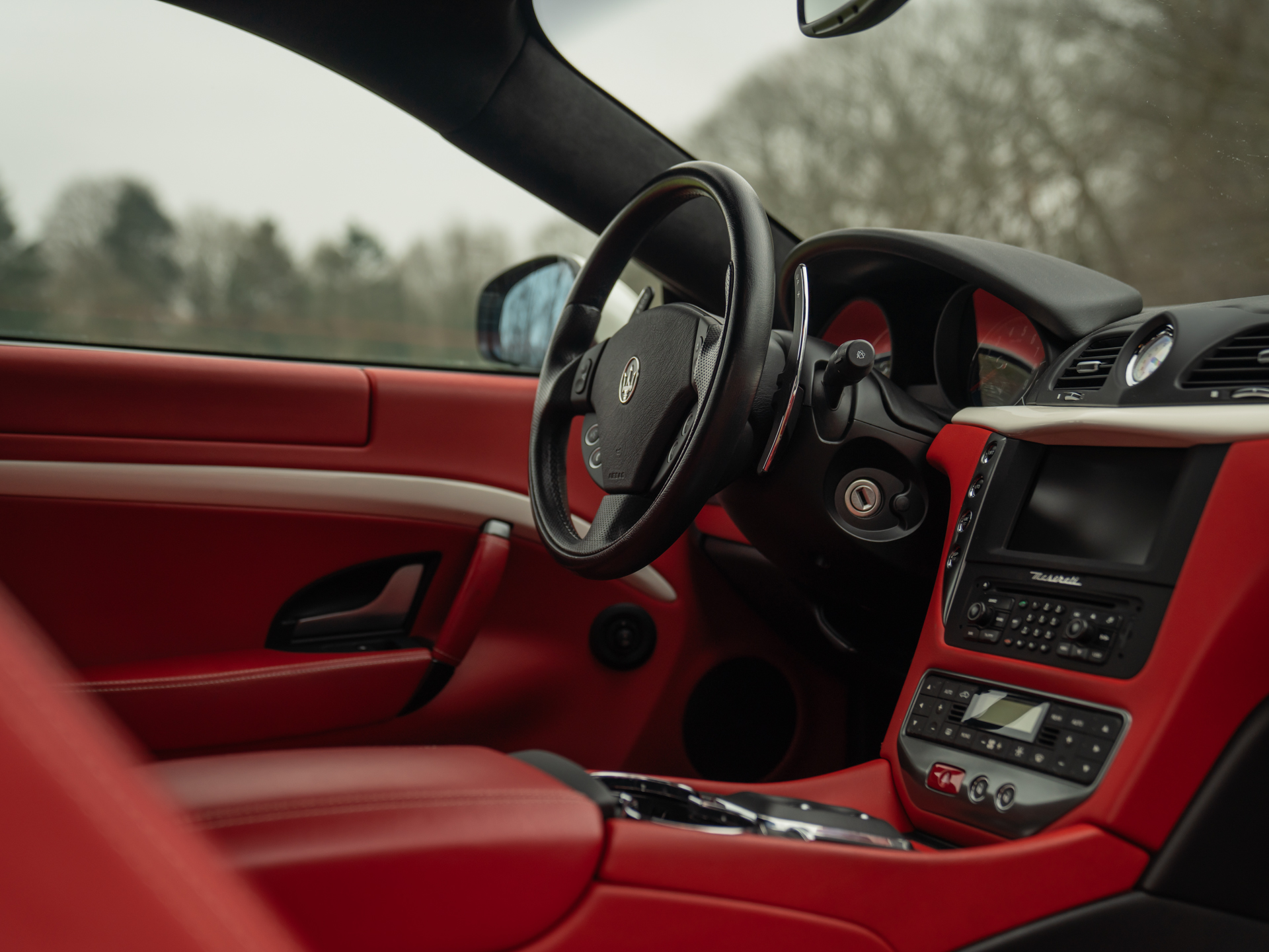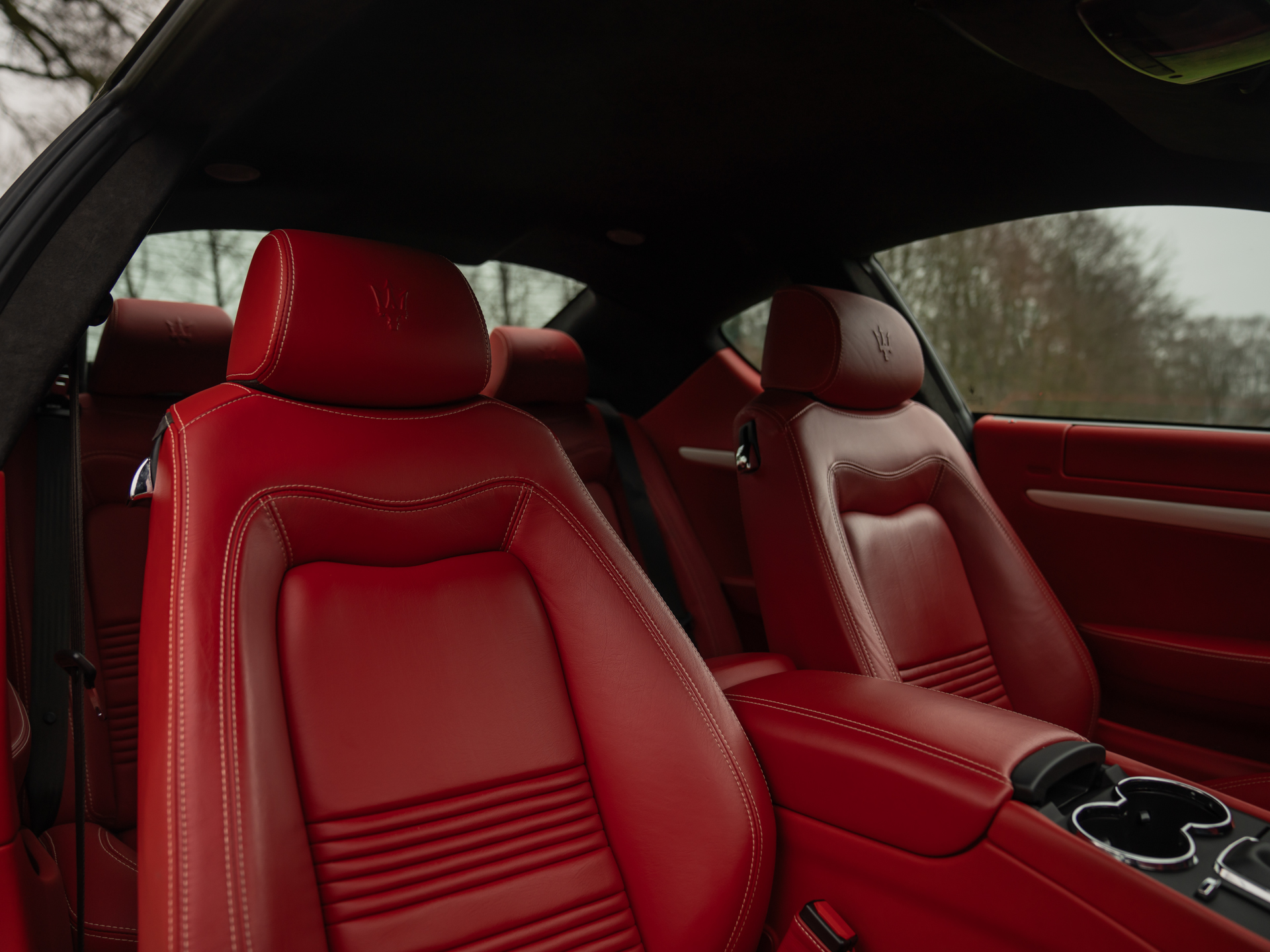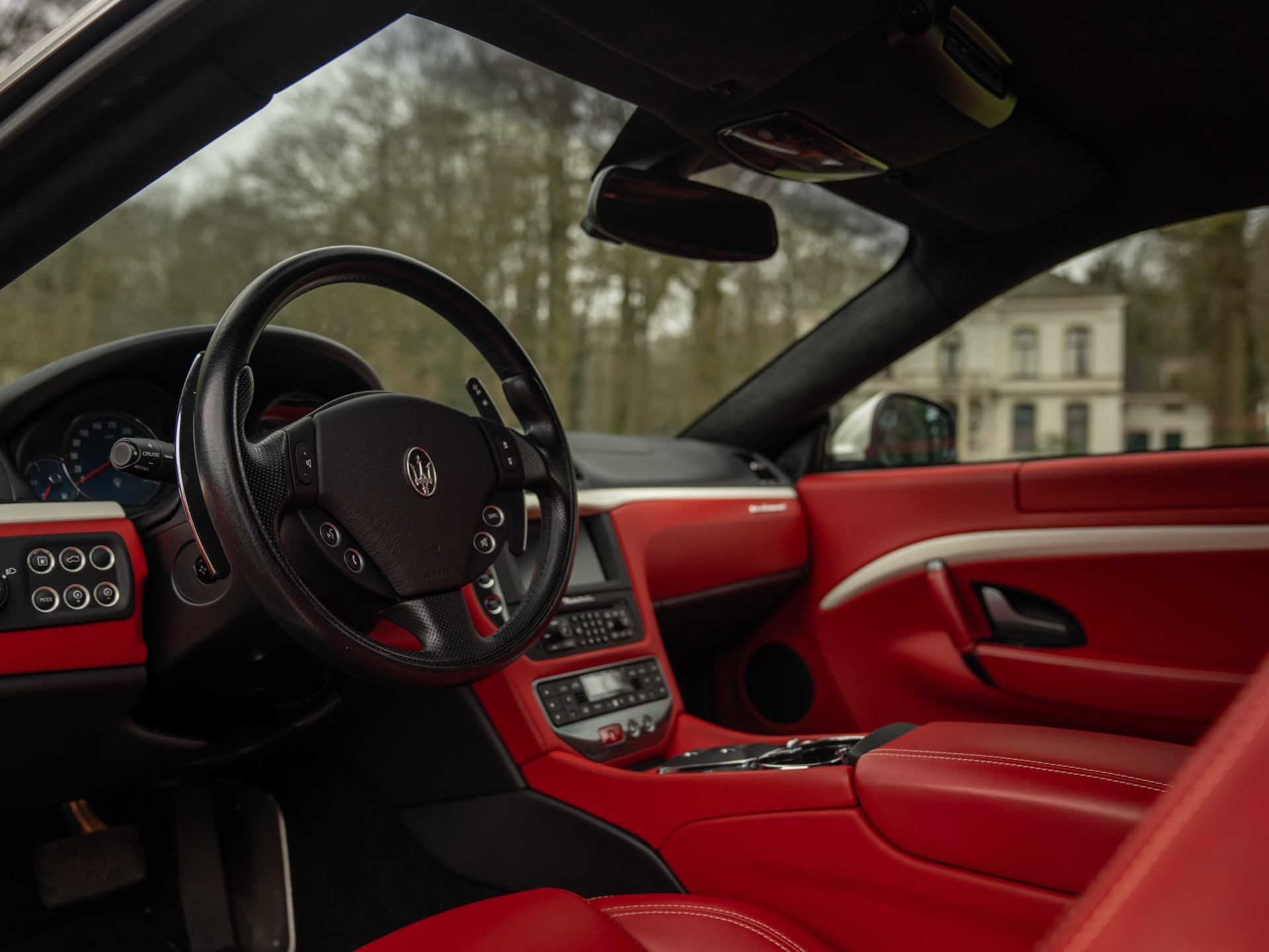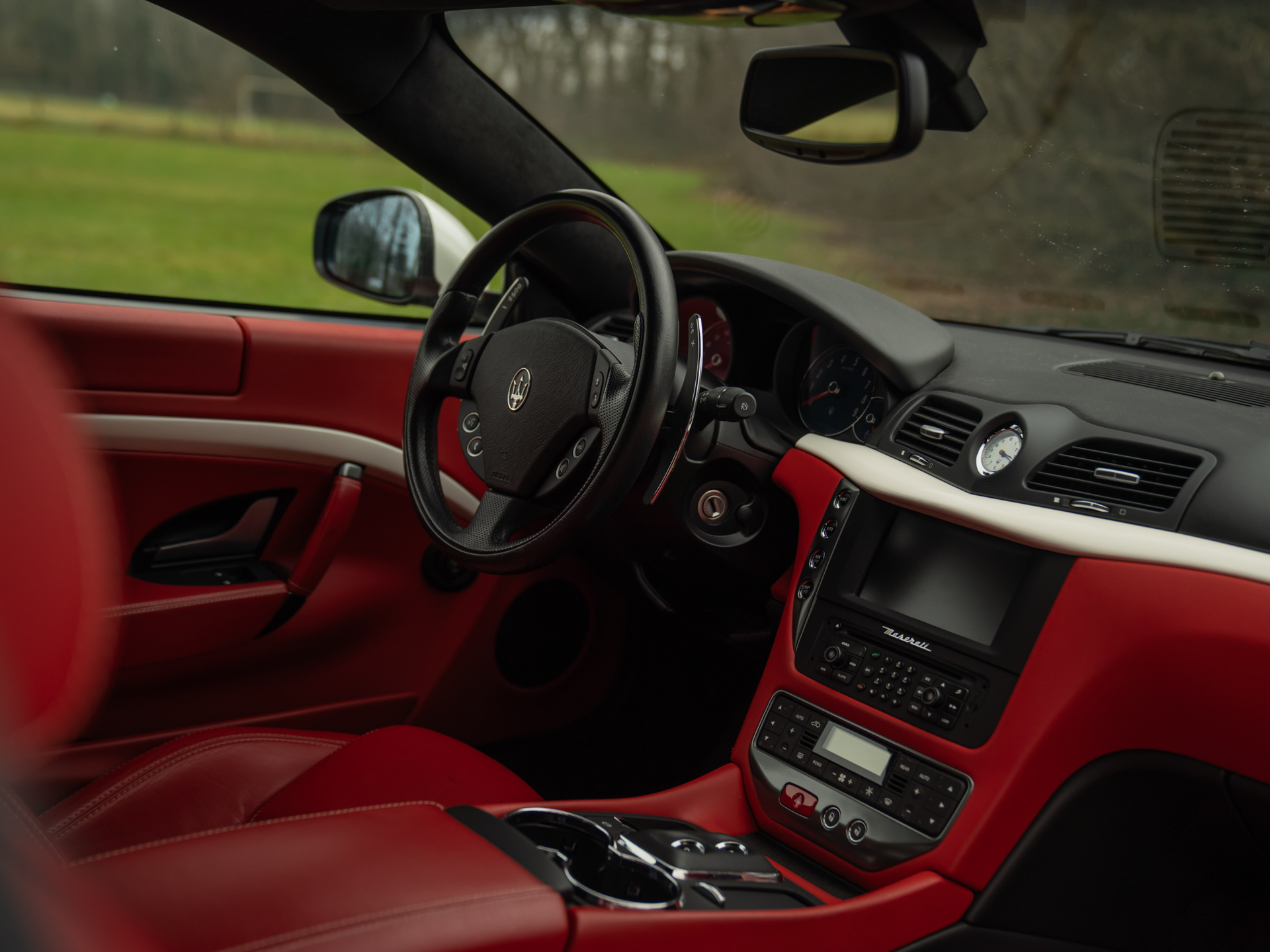 Ja, sommige delen zijn ‘standaard’ zwart, waaronder het lederen stuurwiel, bovenzijde van het dashboard en de Alcantara hemelbekleding. Maar rood overheerst. Rosso Corallo om precies te zijn. Onder andere de lederen stoelen, midden-/tunnelconsole, onderzijde dashboard en portierbekleding beschikken over een knalrode touch. Too much? Nooit! Het is een verademing om een beauty als de Maserati GranTurismo S te zien in een samenstelling die ze verdient. De Avorio contraststiksels, Smoke Quartz afwerking van diverse bedieningselementen plus de Bianco Ice interieurlijsten maken de ultieme smaakmaker uit Italië meer dan af. De legendarische drietand staat gedrukt op de hoofdsteunen en ook het bekende uurwerk mag niet ontbreken op het dashboard, maar de kenner wist natuurlijk allang in kunst op wielen te zijn gestapt.