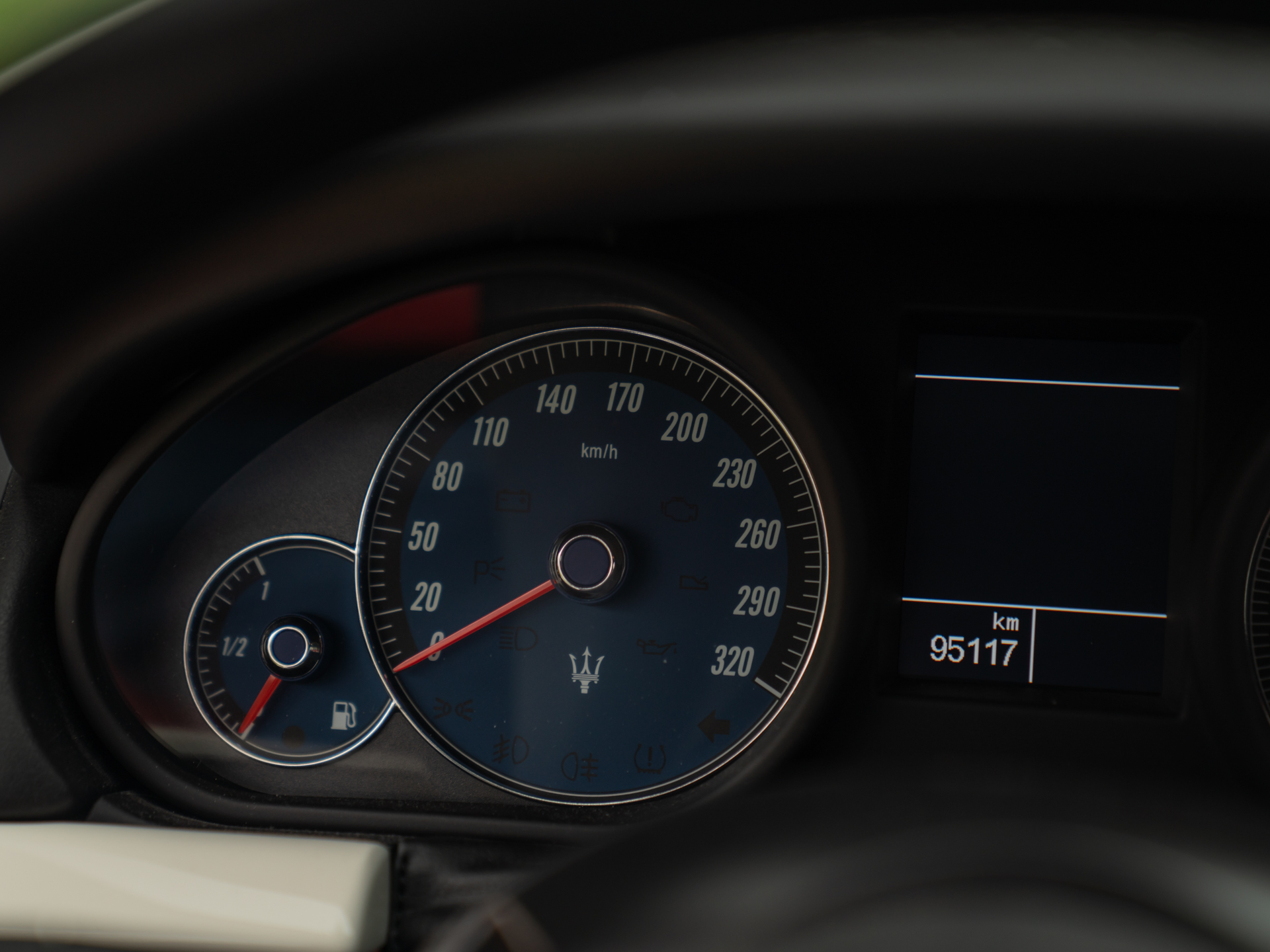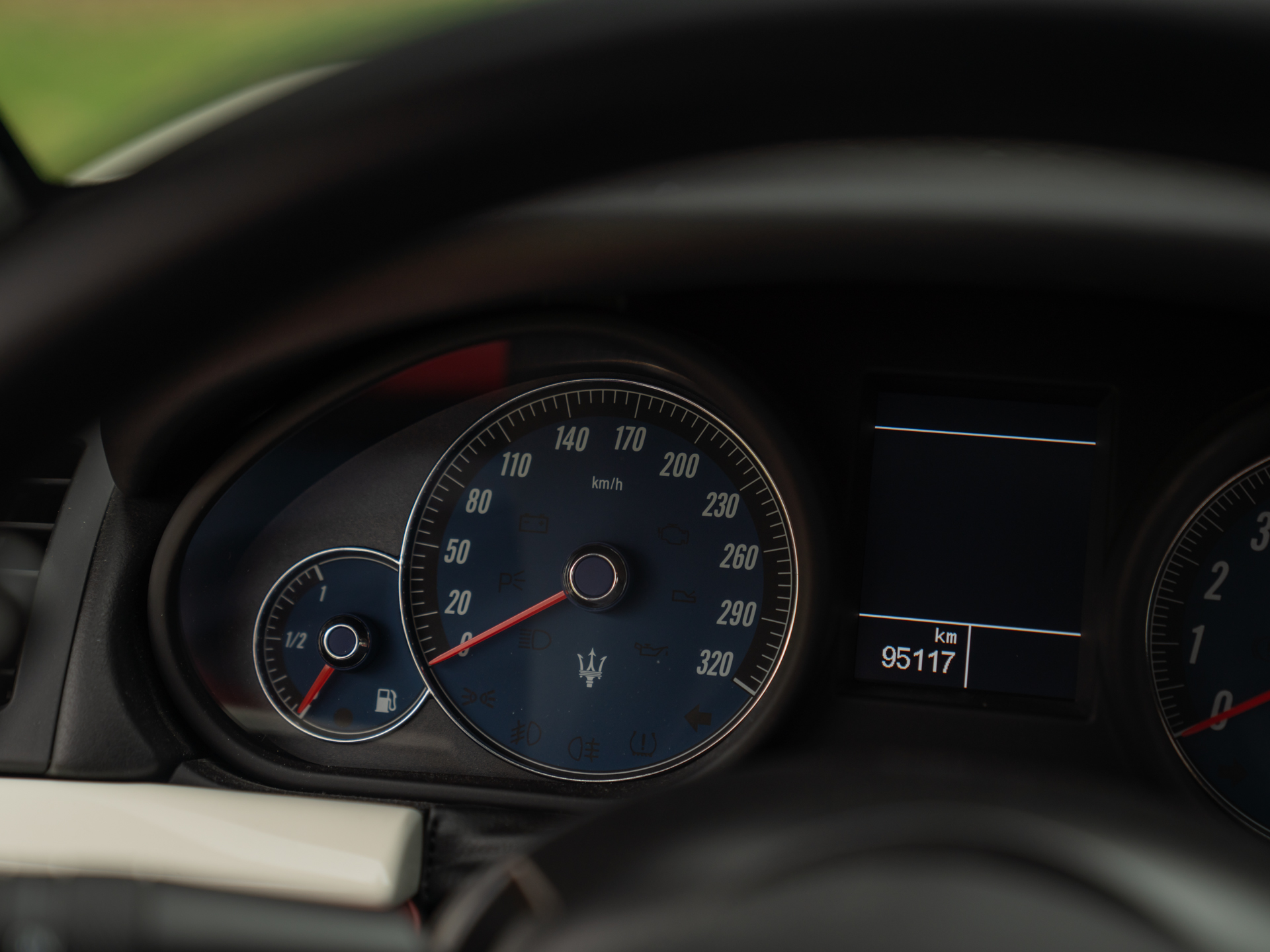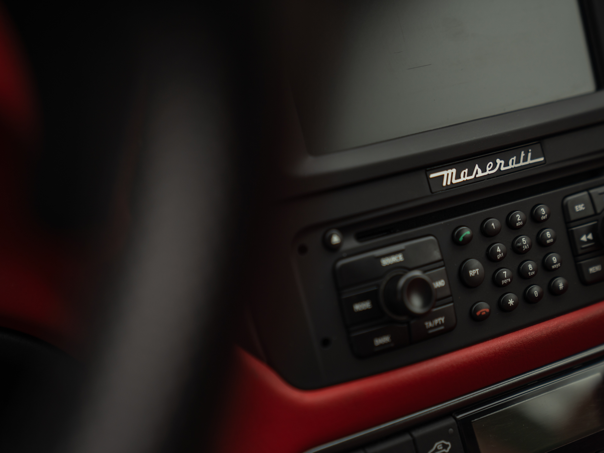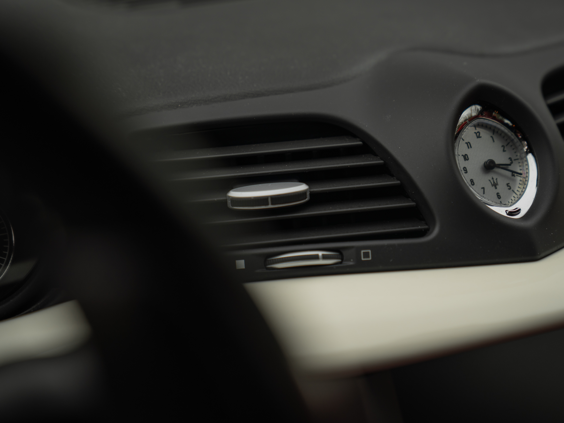 Ja, sommige delen zijn ‘standaard’ zwart, waaronder het lederen stuurwiel, bovenzijde van het dashboard en de Alcantara hemelbekleding. Maar rood overheerst. Rosso Corallo om precies te zijn. Onder andere de lederen stoelen, midden-/tunnelconsole, onderzijde dashboard en portierbekleding beschikken over een knalrode touch. Too much? Nooit! Het is een verademing om een beauty als de Maserati GranTurismo S te zien in een samenstelling die ze verdient. De Avorio contraststiksels, Smoke Quartz afwerking van diverse bedieningselementen plus de Bianco Ice interieurlijsten maken de ultieme smaakmaker uit Italië meer dan af. De legendarische drietand staat gedrukt op de hoofdsteunen en ook het bekende uurwerk mag niet ontbreken op het dashboard, maar de kenner wist natuurlijk allang in kunst op wielen te zijn gestapt.