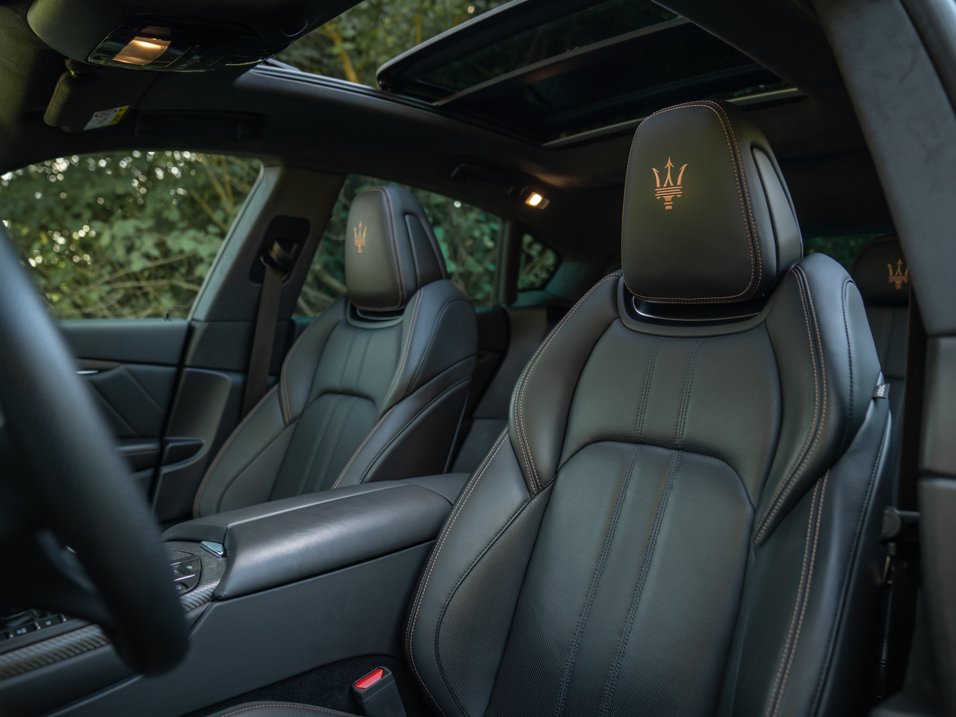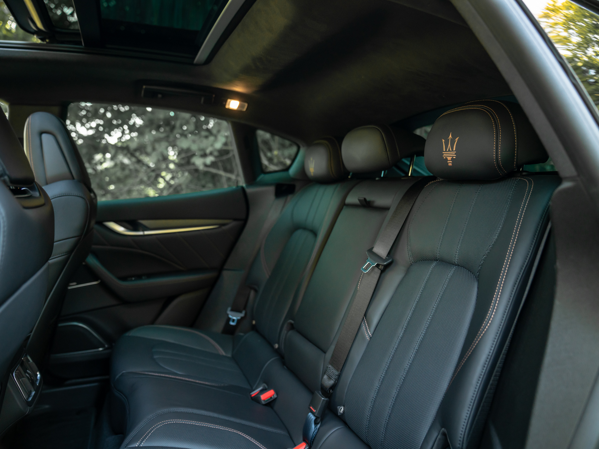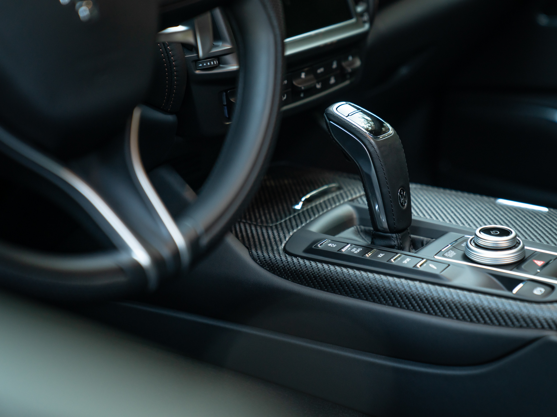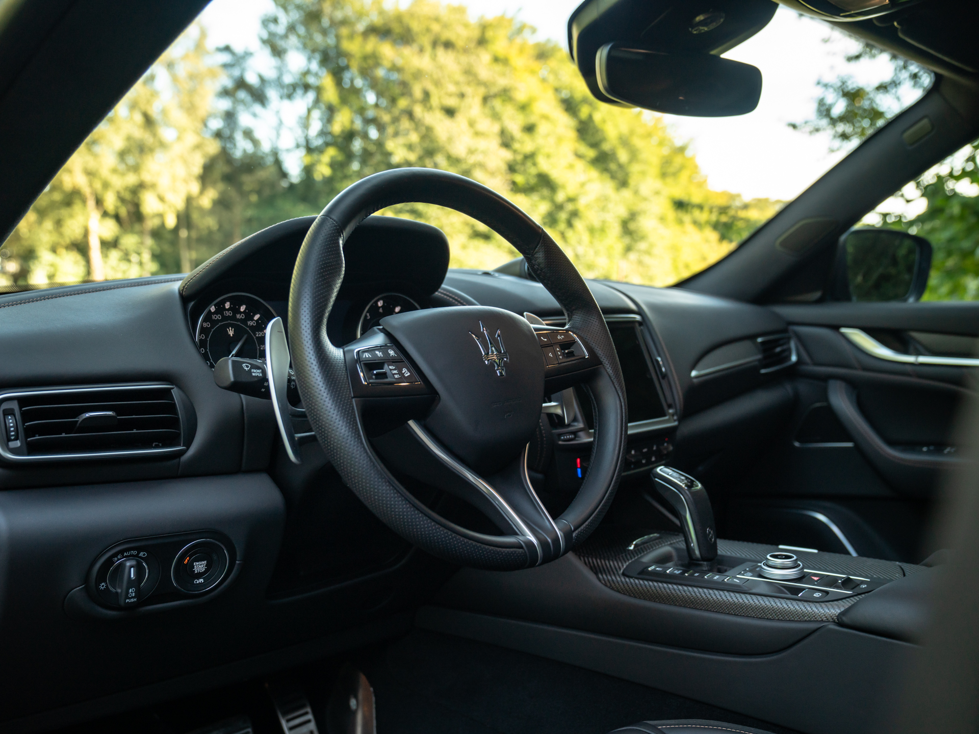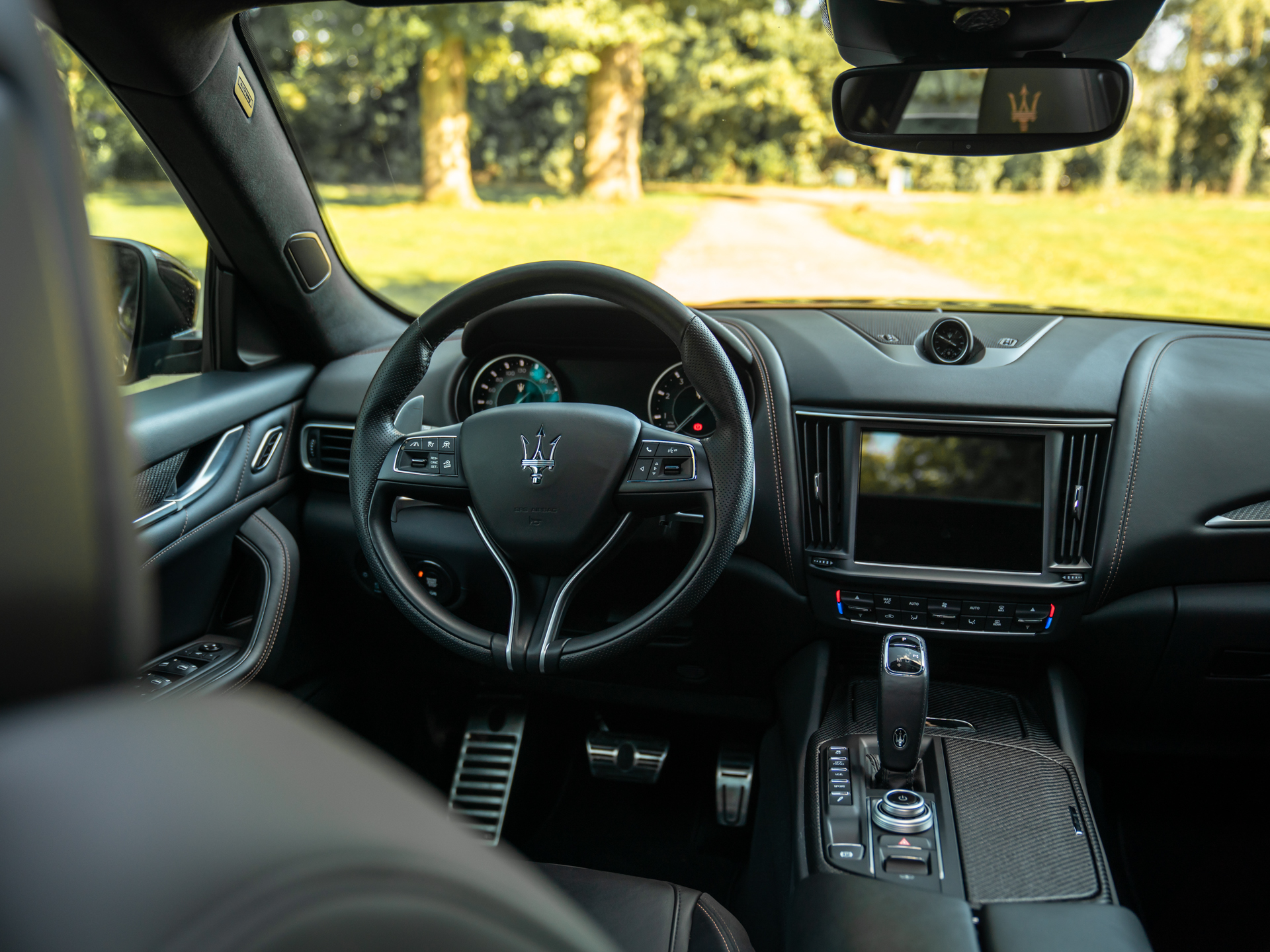 Dat onze Levante 3.0 V6 Modena S een liefhebbersauto pur sang is, is ook aan de binnenkant duidelijk te zien: de zwart lederen bekleding op stoelen, stuur, dashboard en portieren bevat Cuoio contraststiksels voor de perfecte finishing touch – de gestikte Tridents in de hoofdsteunen inbegrepen. Hoogwaardig én hightech is het Carbon Interior Pack. Deze optie omvat peperdure lichtgewicht panelen op portieren, dashboard en tunnelconsole. Een sportieve afwisseling voor het ware cockpit gevoel. Maar krap zal het Maserati interieur never nooit aanvoelen, daar zorgt onder andere het grote glasoppervlak in de vorm van een elektrisch panoramadak wel voor. Het imposante multimedia-/infotainmentscherm biedt daarnaast talloze comfortfuncties. Je zou haast vergeten met een sportauto onderweg te zijn…