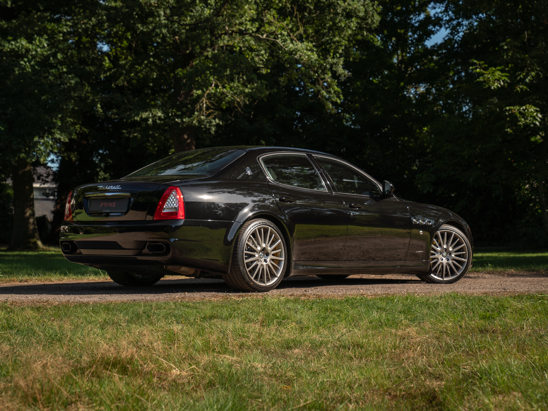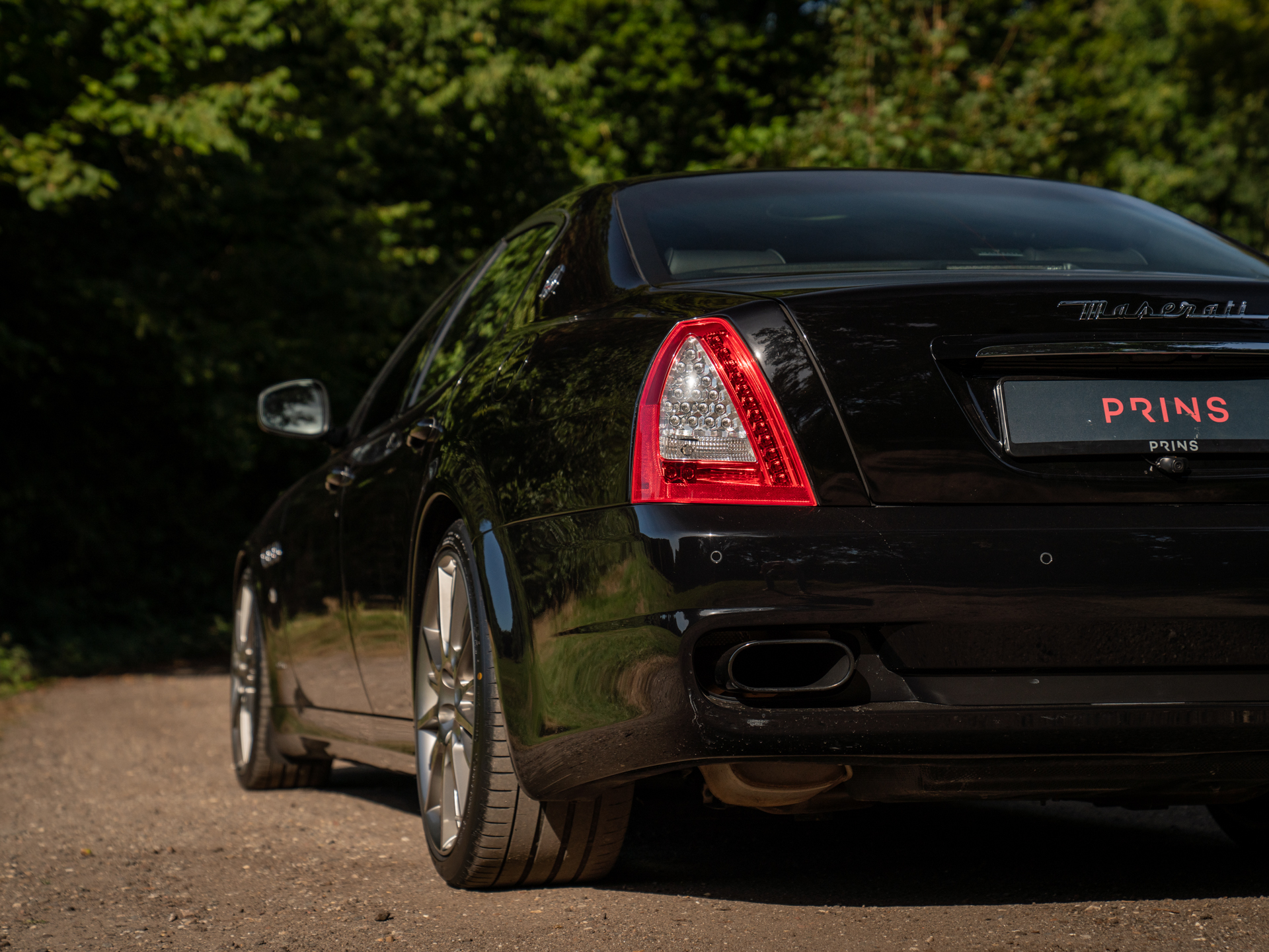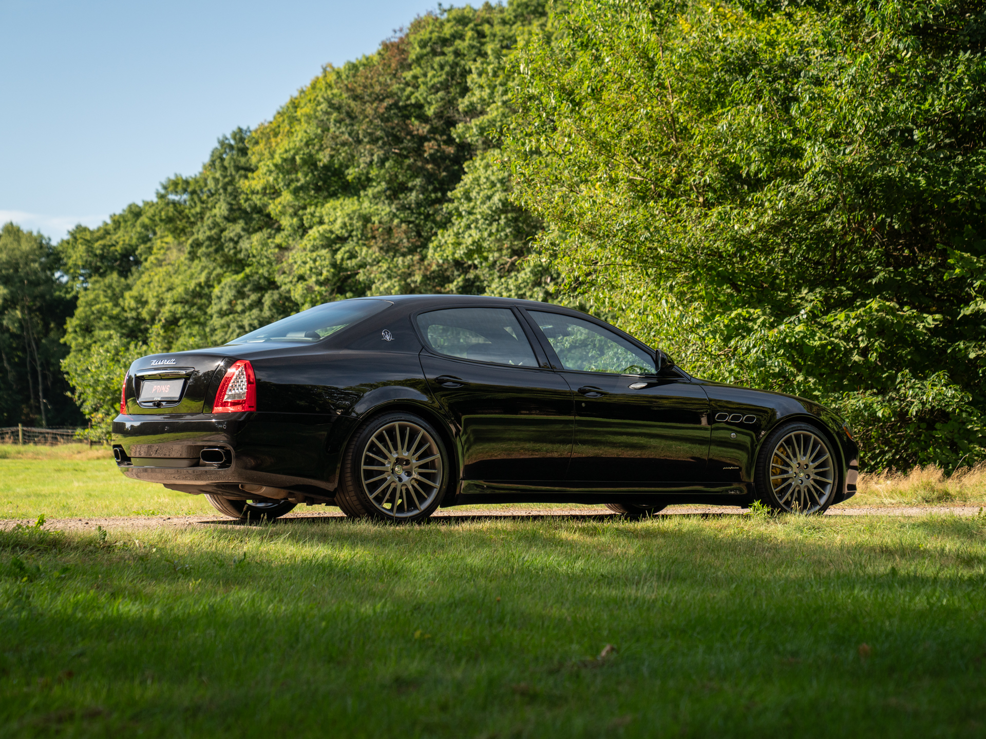 Dit is zonder meer de heilige graal in de wereld van auto’s: de Maserati Quattroporte 4.7 Sport GTS! De uitvoering der uitvoeringen van ’s werelds enige topklasse limousine die het pure sportwagen-DNA op een hoogst stijlvolle manier heeft weten te verpakken. Zoals alleen Italianen dat kunnen! Wat dit specifieke exemplaar nog eens extra zeldzaam, legendarisch en begerenswaardig maakt? Een heleboel… Zo is de staat subliem, het onderhoud door de Maserati dealer uitgevoerd en de samenstelling werkelijk beeldschoon! Highlights zijn onder andere de alcantara interieurfinish, carbon interieurdetails en de super subtiele – maar oh zo effectieve verlaging van het onderstel… Origineel van Maserati! Af-fabriek werd ook het Bose Surround Sound systeem ingebouwd. Maar dit zal met een dubbelgevoel zijn gebeurd, want niets gaat boven de sound van atmosferische Ferrari V8. Laat staan als die voorin de neus van Maserati’s grootste sportsedan ligt!
