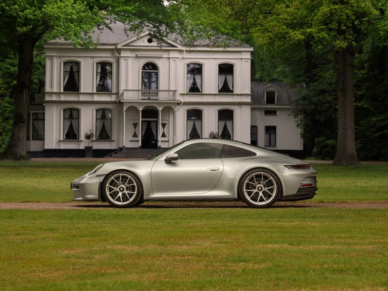 De GT3 is van origine veruit de meest pure Porsche 911 die u zich kunt wensen. In Zuffenhausen houden ze echter rekening met de evolutie van de wensenlijst van de puristen. Want hoe kan een liefhebber zo lang en zoveel mogelijk genieten van een auto als de laatste generatie 992 4.0 GT3? Precies: door hem vergevingsgezinder te maken en daarna het woordje Touring erachter te plakken. De reusachtige en stiekem toch ook wel tikkeltje opzichtige achtervleugel kan hierdoor achterwege worden gelaten. Gespoten in Dolomietzilver metallic blijft dit exemplaar echter dichtbij zijn roots, door de Elfer een traditionele, no-nonsense uitstraling te geven. Inclusief zilverkleurige GT3 wielen, chromen raamomlijsting + typeaanduiding + eindstukken van de dubbele centrale uitlaat en – jawel – een volledig in carbon uitgevoerd lichtgewicht dak. Ook donker van kleur zijn de enorme diffusor, getinte ramen achter en hoogglans zwarte remklauwen die zich in PCCB (Porsche Ceramic Composite Brake) schijven vastbijten. Traditie is mooi, maar verschil moet er zijn…