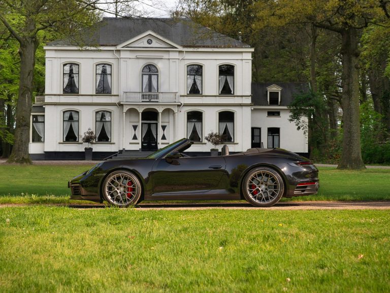 Een heerlijk compromisloze Porsche 992 Carrera 4S Cabriolet: zwart, snel en zonder fratsen. Althans, optisch gezien. Want achter de strakke, subtiel verlaagde 911 koets gaat veel, héél veel luxe schuil. Inbegrepen zijn bijvoorbeeld PASM, een Sport Chrono pakket, liftsysteem, PDLS+ en achterasbesturing. Het GT Sportstuur is verwarmd, de stoelen zijn zowel te verwarmen als te koelen en er is een Licht Design pakket. Om het leven nóg gerieflijker te maken aan boord van de 450 pk sterke Elfer monteerde Porsche zaken zoals Adaptive Cruise Control, Park Assistent inclusief Surround View Camera, Bose Surround Sound en een HomeLink garagedeuropener.