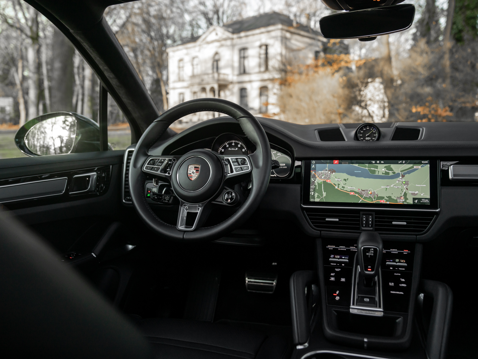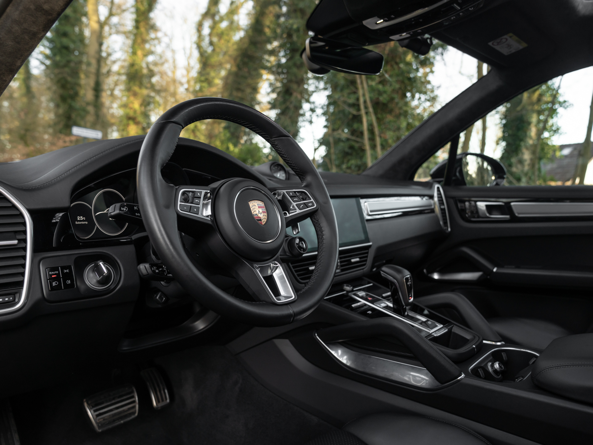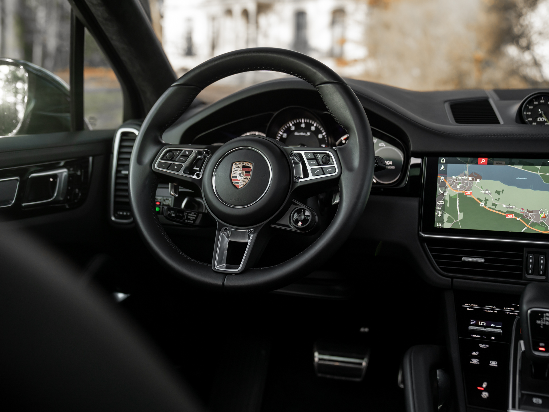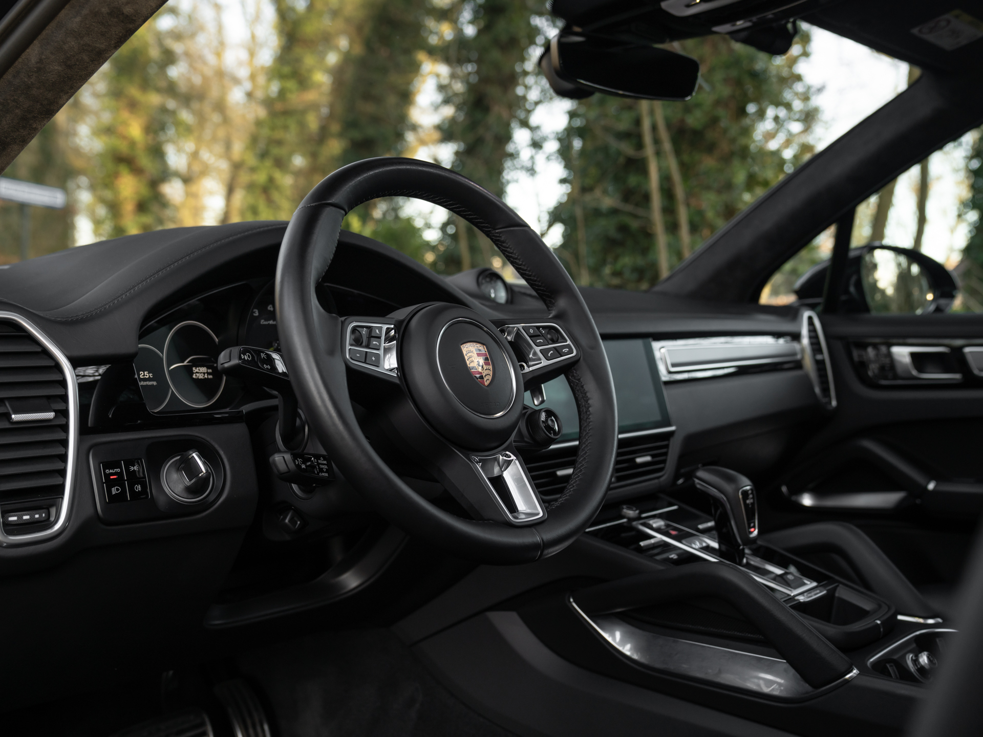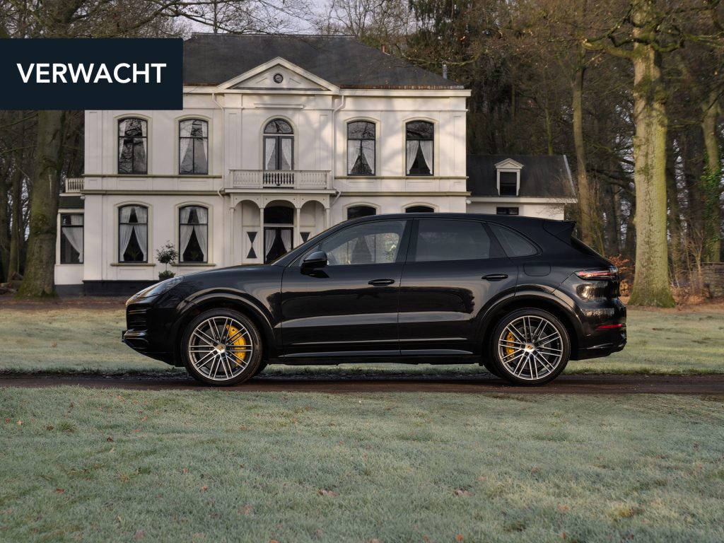 Met de eerste generatie Cayenne drukte Porsche haar stempel op de Performance-SUV. Velen geloofden niet in het concept, maar tegenwoordig valt een hoge topsporter in het hoge segment niet meer weg te denken onder de zichzelf respecterende sportautomerken. Aan de absolute top van de voorlaatste serie Porsche Cayenne’s staat deze Turbo S E-Hybrid. Ons exemplaar dikt zijn spierballen extra aan door middel van het SportDesign pakket. Geprononceerdere bumperspoilers, sideskirts, alsook de (verstelbare!) dakspoiler maken optisch het verschil. Achter de two-tone multi-spaakwielen schuilen gigantische gele remklauwen die nog indrukwekkendere keramische schijven vastgrijpen. De LED Matrix-koplampen zitten standaard verscholen in een donkere koplampbehuizing, welke naadloos aansluit op de Diepzwart metallic carrosserie. Ook de eindstukken van de sportuitlaat zijn alvast zwart gemaakt, want dat worden ze toch na een stevige rit…