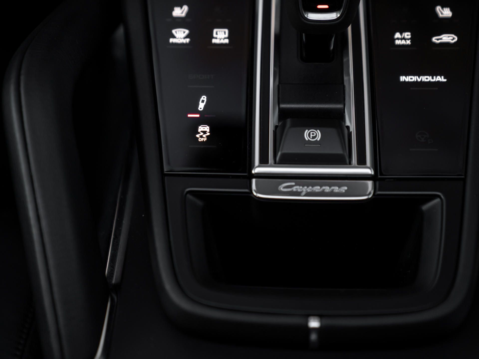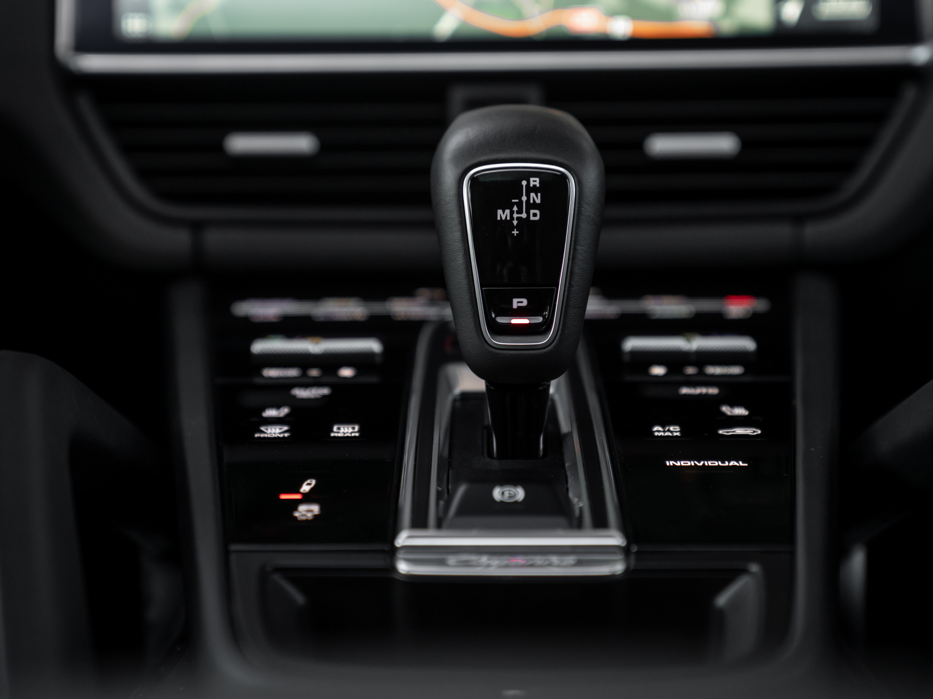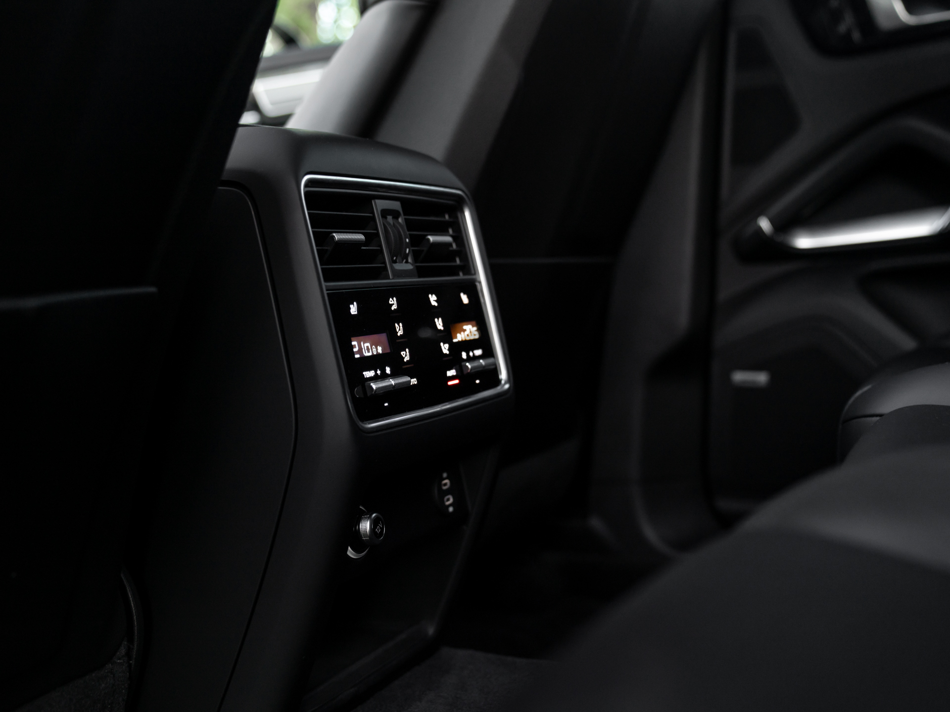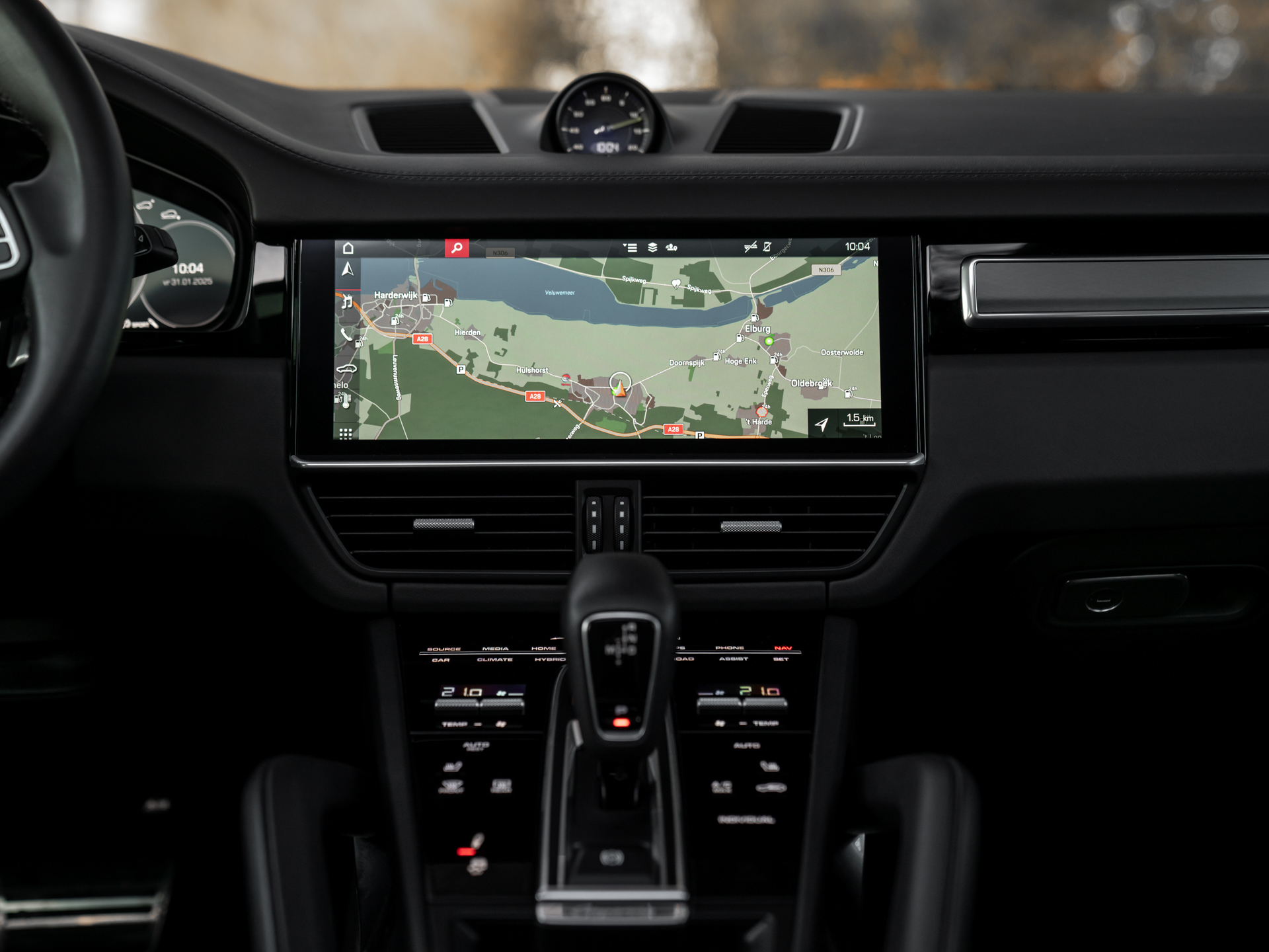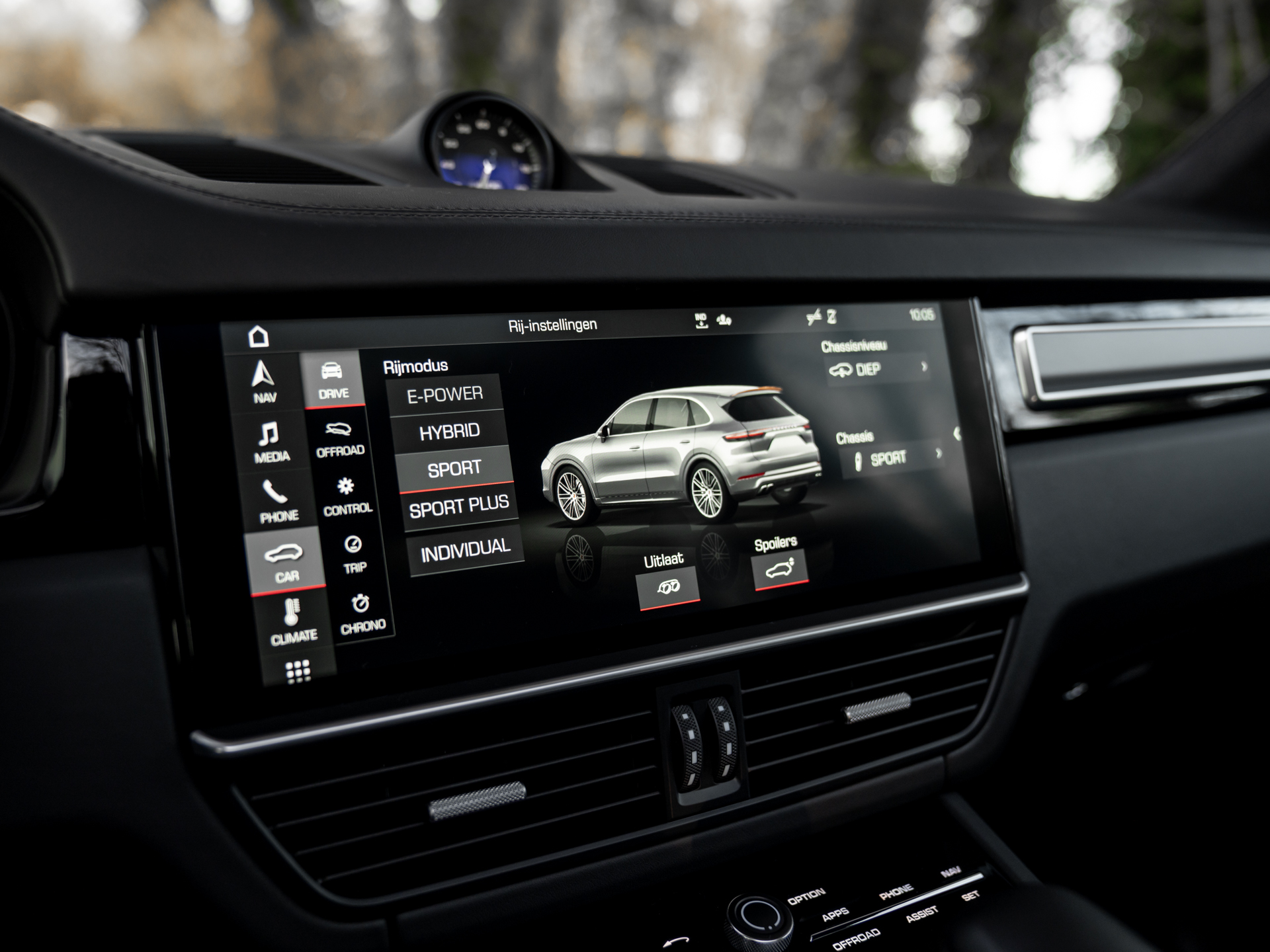 De cockpit van onze Porsche Cayenne Turbo S E-Hybrid durft qua kleur niet af te wijken van het exterieur, al vonden de knappe engineers wél afwisseling in het soort afwerking: het leder op het dashboard, de Adaptieve Sportstoelen en de middenarmsteun wordt stijlvol afgewisseld door Alcantara bekleding op de dakhemel + stijlen. En uiteraard verdient het inmiddels traditionele Sport Chrono klokje een prominente positie midden bovenop het dashboard. Wie zich hierdoor laat leiden komt gegarandeerd veelvuldig met zijn of haar achterhoofd in contact met de prachtige Porsche emblemen in de hoofdsteunen. Dezelfde iconische badge siert de middenarmsteun op. Voor de rest geen gekkigheden aan boord van de super strakke plug-in hybride Cayenne Turbo S. Of het moet de bizarre hoeveelheid luxe zijn. Ambient Lighting weet als geen ander de weelderige sfeer te belichten. Letterlijk.