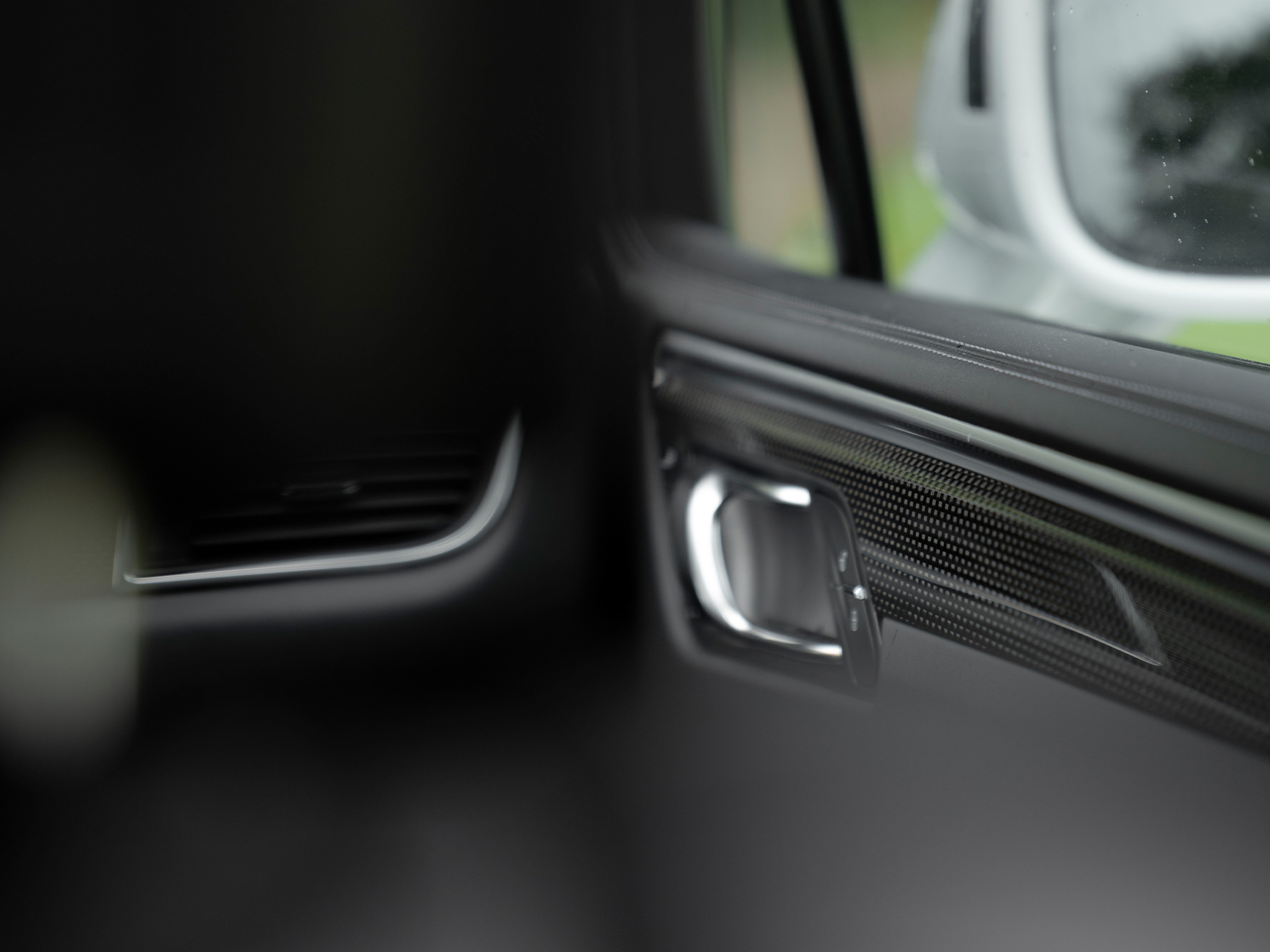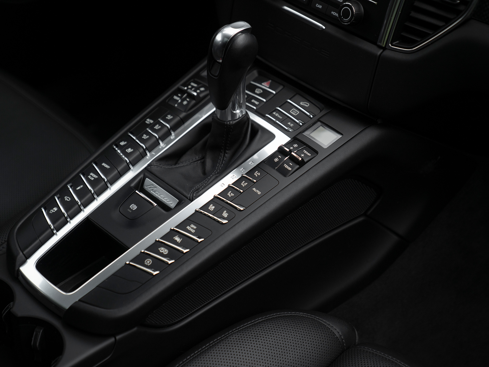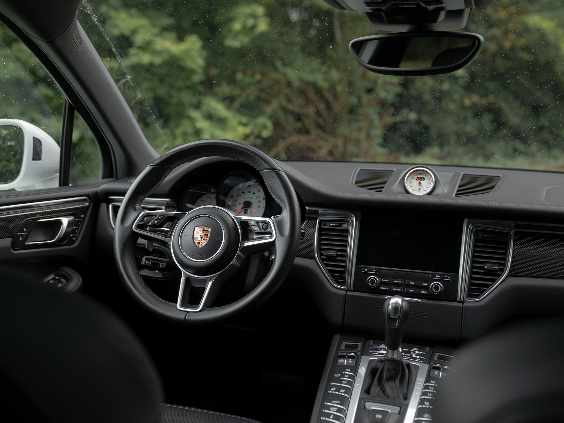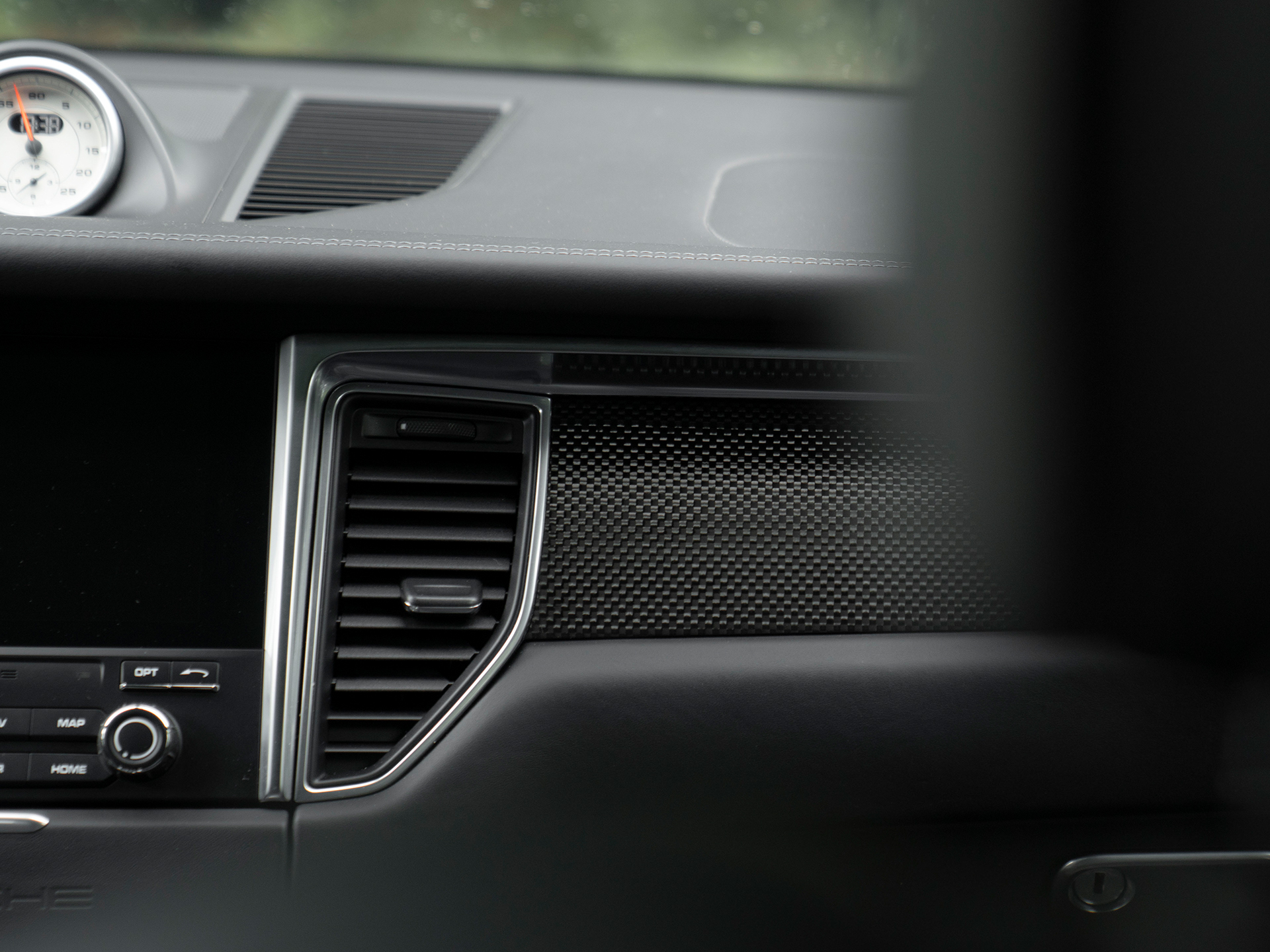 Binnenin wordt het thema zwart zowaar nog verder uitgebreid: de met leder beklede Adaptieve Sportstoelen, alsmede het dashboard en de deurpanelen kleuren stuk voor stuk egaal zwart. Tot en met het gedrukte Porsche embleem in de hoofdsteunen aan toe! Niet zwart, maar ook niet minder donker zijn de hightech onderdelen uit het exclusieve carbon interieurpakket. Dashboard, portierlijsten en dorpellijsten zijn gemaakt van dit peperdure, super racy materiaal. Schitterende Macan opschriften – inclusief vuurrode GTS opdruk, garanderen dat de toon meteen is gezet zodra u wilt instappen. Handen aan het stuur, Sport Chrono klokje op scherp en klaar voor een onvergetelijke rit…