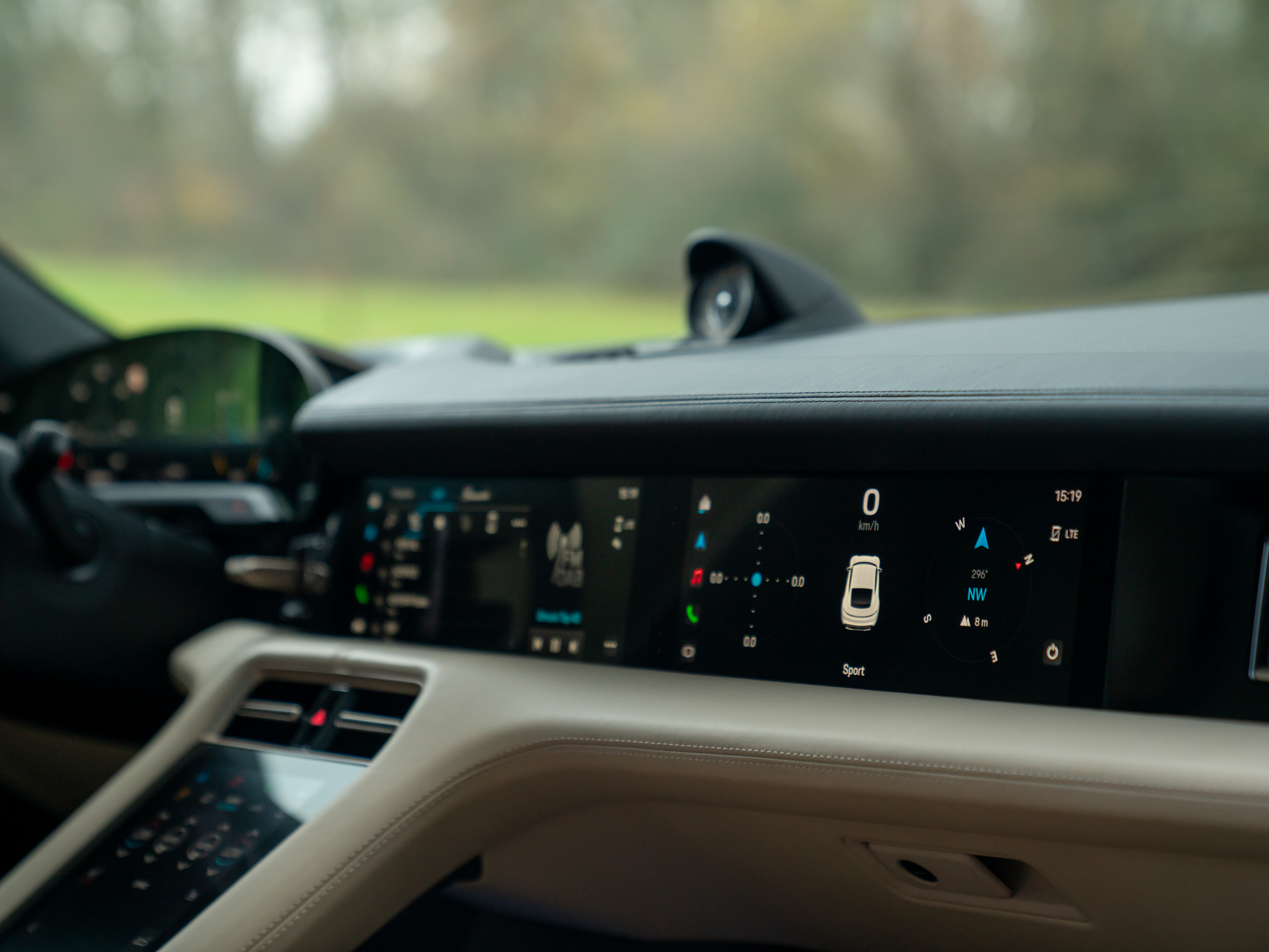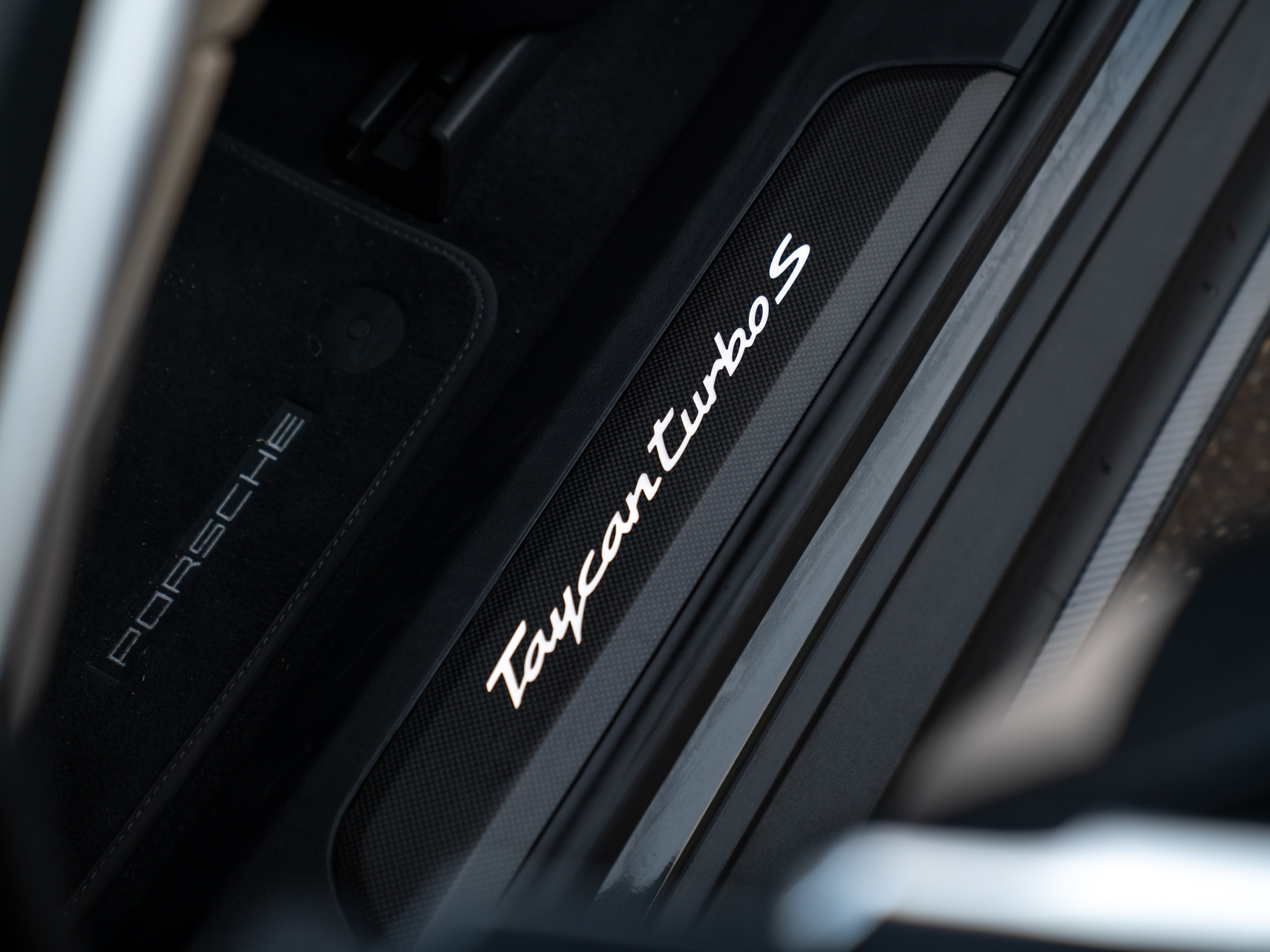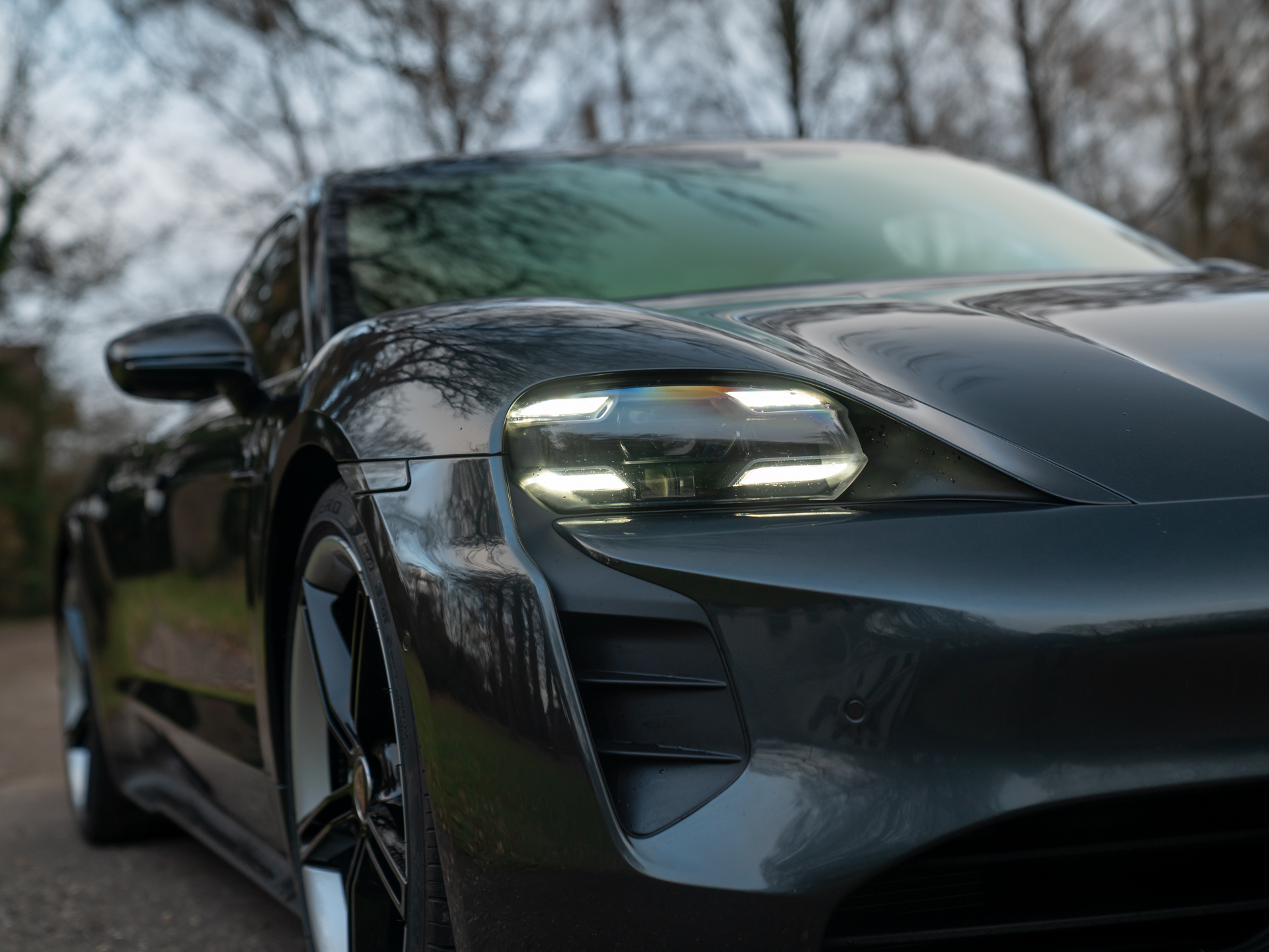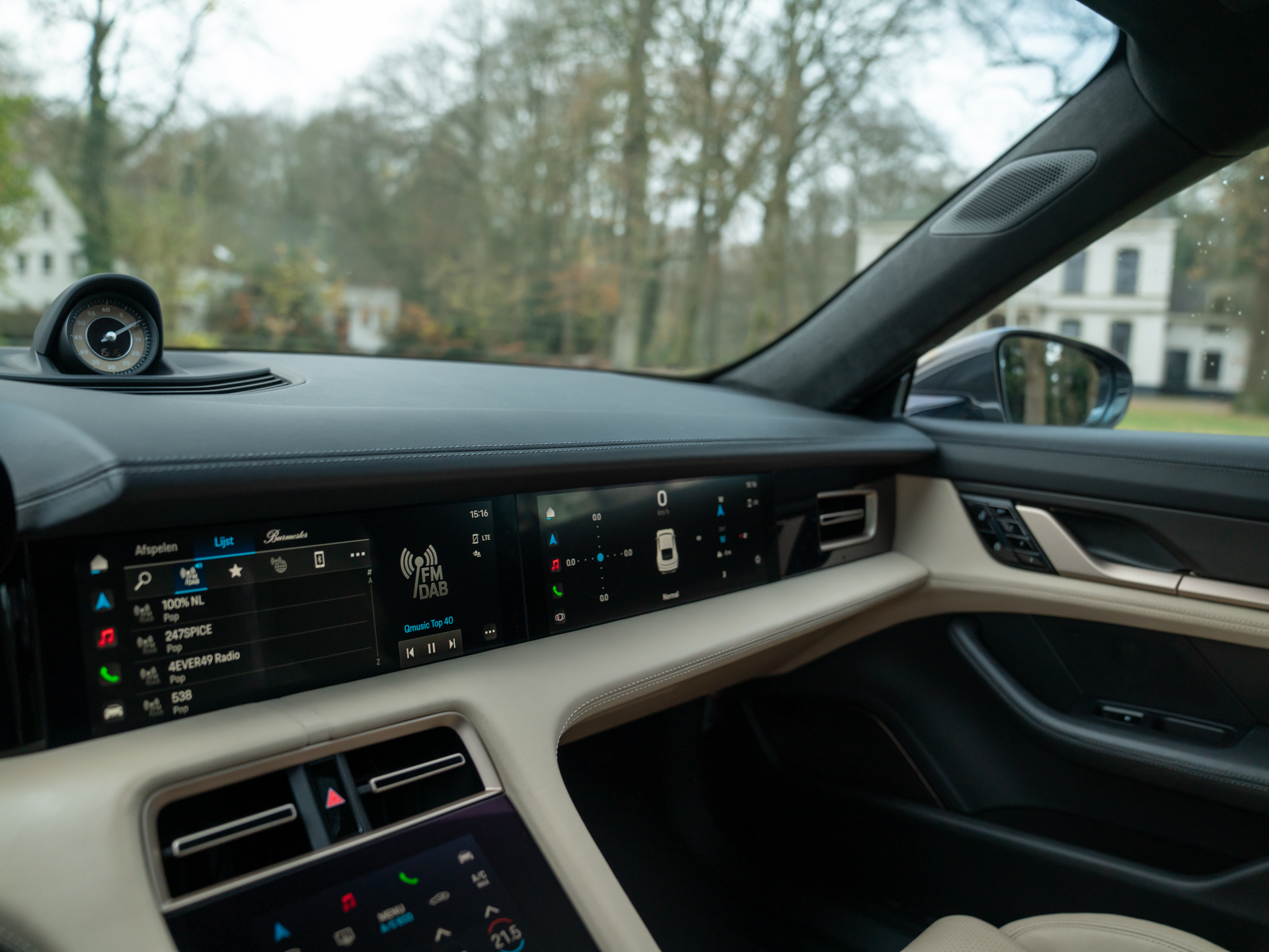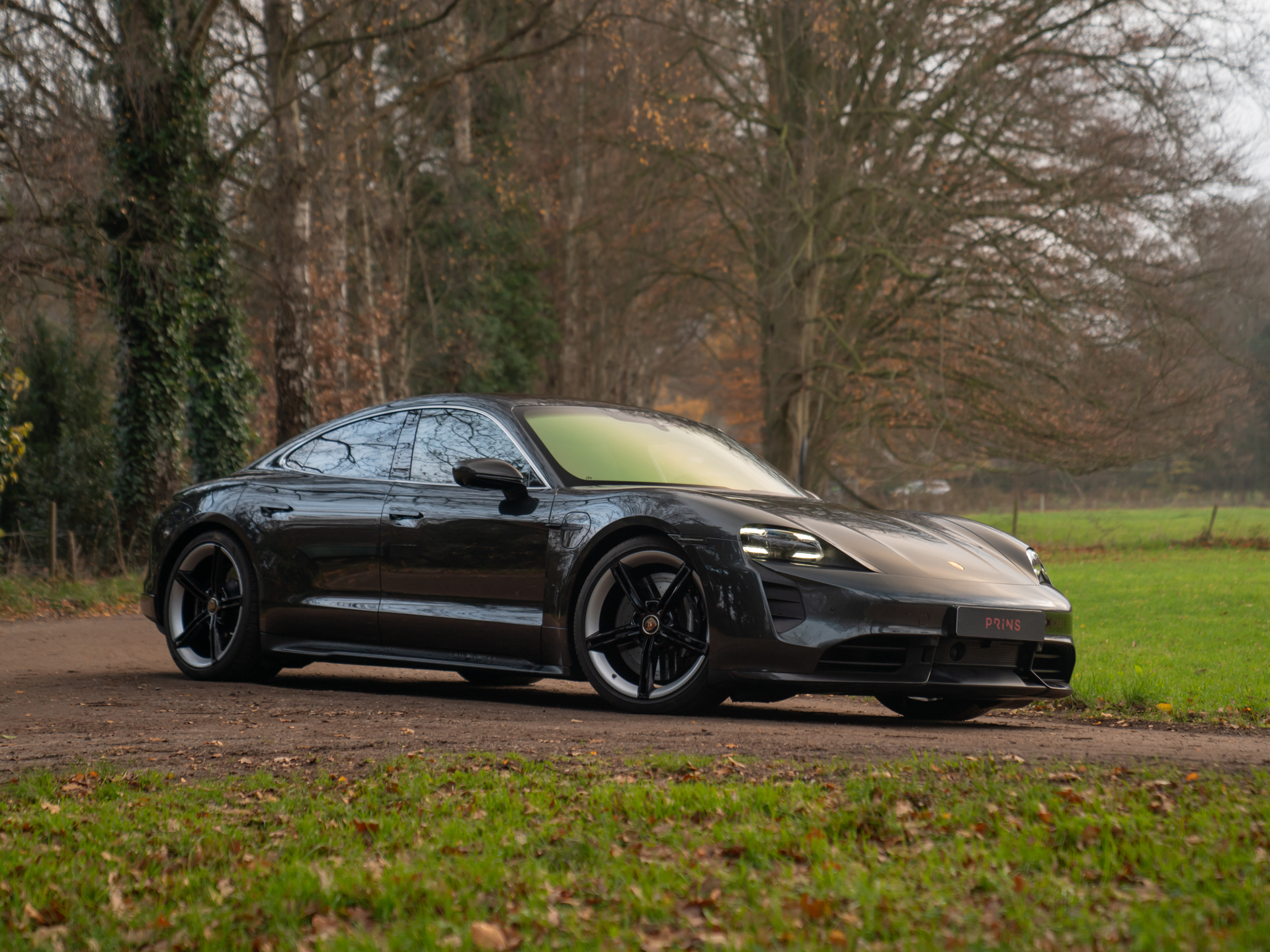 Het lijkt Porsche’s missie te zijn geworden om elektrisch rijden spannend te maken. Deze heerlijke Taycan Turbo S op 21 inch grote Mission E Design velgen is daarvan het rijdende bewijs. Met 761 pk en 1.050 Nm koppel (!) aan boord maakt de EV alvast een verpletterende indruk als het om prestaties gaat: 0 naar 100 km/h in 2,8 seconden… Welke hypercar met benzinemotor doet ‘m dat na? Zo ingetogen als het Vulkaangrijs metallic lakwerk aandoet, zo explosief is de snelheidsopbouw. En dan te weten dat de Porsche Taycan nog tamelijk functioneel is ook: met 4 portieren en 5 zitplaatsen hoeft u niet te kiezen welk gezinslid er meegaat om een F1-achtige acceleratie te ervaren. Het motorgeluid schittert door afwezigheid, maar het Burmester 3D High-End Surround Sound systeem weet dit op oorstrelende manier te compenseren. Andere hoogwaardige extra’s treft u in de vorm van een panoramadak, achterasbesturing, luchtvering, Surround View Camera, stoelverwarming, stuurverwarming, Matrix LED-koplampen en een Licht Design pakket. Het Basalt Clubleder op stoelen, midden-/tunnelconsole, portieren en onderzijde dashboard is origineel en smaakvol tegelijkertijd. Het spannendste zijn echter de opties die het adrenalineniveau door het dak laten gaan: zowel het SportDesign exterieurpakket als het GT Sportstuur bevat carbon elementen. Kortom, helemaal hightech en puur op performance gericht. Net als Porsche Dynamic Chassis Control Sport (PDCC Sport) en Porsche Ceramic Composite Brake (PCCB) om al dit technische geweld weer veilig en stabiel tot stilstand te kunnen brengen. Nee, dit is geen Porsche zoals we Porsche kennen. Aan de andere kant: hij doet zijn naam Turbo S zonder twijfel eer aan.