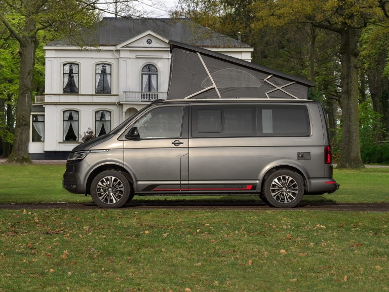 De Volkswagen California is de Mercedes onder de kampeerbusjes. Gebaseerd op de Transporter bedrijfswagen, is de auto in basis über-functioneel ingericht. Toch zien we vooral ook heel veel Multivan trekjes, want de afwerking is van een hoge kwaliteit en maximaal gericht op personenvervoer. Dit maakt dat de VW California een prachtige mix te bieden heeft van doelmatigheid, comfort en uitstraling. Dat laatste is ook terug te zien aan de buitenkant: het faceliftmodel, gebaseerd op de Transporter 6.1, maakt het verschil met zijn gewijzigde front dat net wat imposanter is dan voorheen dankzij een grotere grille en verder gefinetunede koplampunits. Onze Ocean Edition staat op 17 inch lichtmetalen velgen voorzien van een donkere inlay die mooi matcht met de donkergrijs metallic carrosserielak. De Ocean en Edition badges inclusief bijbehorende rode striping geven de T6.1 California een krachtige en stoere uitstraling. Hier kunt u wel mee voor de dag komen op de camping!
