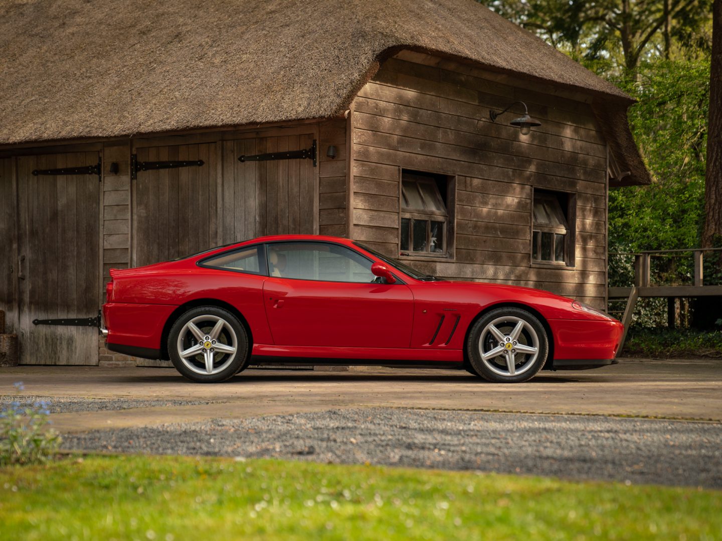 You can recognize a modified Ferrari 550 by several subtle interventions, such as the 3 round lamps per headlight unit, excluding the mini ones in the top corner. In contrast to the pre-facelift model, the background of the 575M headlights is completely painted in body color. The shape of the glassware or covers remained identical. The adjusted lighting layout had a direct influence on the grille: the fog lights were no longer integrated, creating more space for an opening with horizontal and vertical bars. Remarkably, the design has been kept simpler, and the same goes for the cooling slots next to it. Speaking of cooling: the air intake in the hood and double vents behind the front wheels were taken directly from the original Maranello. Doors, side skirts, mirrors, roofline; it’s no less smooth on the 575M than on the 550. Also note the single air-duct behind the door, which is only on the left. It’s all about the details… Seen from the side, the Ferrari Modificata completley relies on its slightly modified wheel design, and is recognizable at the rear by the 575M badge. The bright red Rosso Corsa lacquer is a real stunner. The Ferrari passion is as pure as possible!