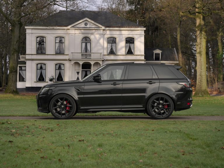 De Range Rover Sport SVR houdt niet van half werk. Gelukkig geldt voor de egaal zwarte uitdossing exact hetzelfde: het chique Santorini Black lakwerk wordt bijgestaan door vele (hoogglans) zwarte details. Waaronder de 21 inch grote SVR-wielen, inzetpanelen op de voorste schermen en bumpers, rand rondom de grille, luchtsleuven in de motorkap, raamlijsten, diffusor achter, dorpelverbreders en typeaanduidingen in het front plus achter. Het optionele Black Pack betekent dat het dak en de spiegelkappen sowieso ook door een zwart bad zijn gegaan.