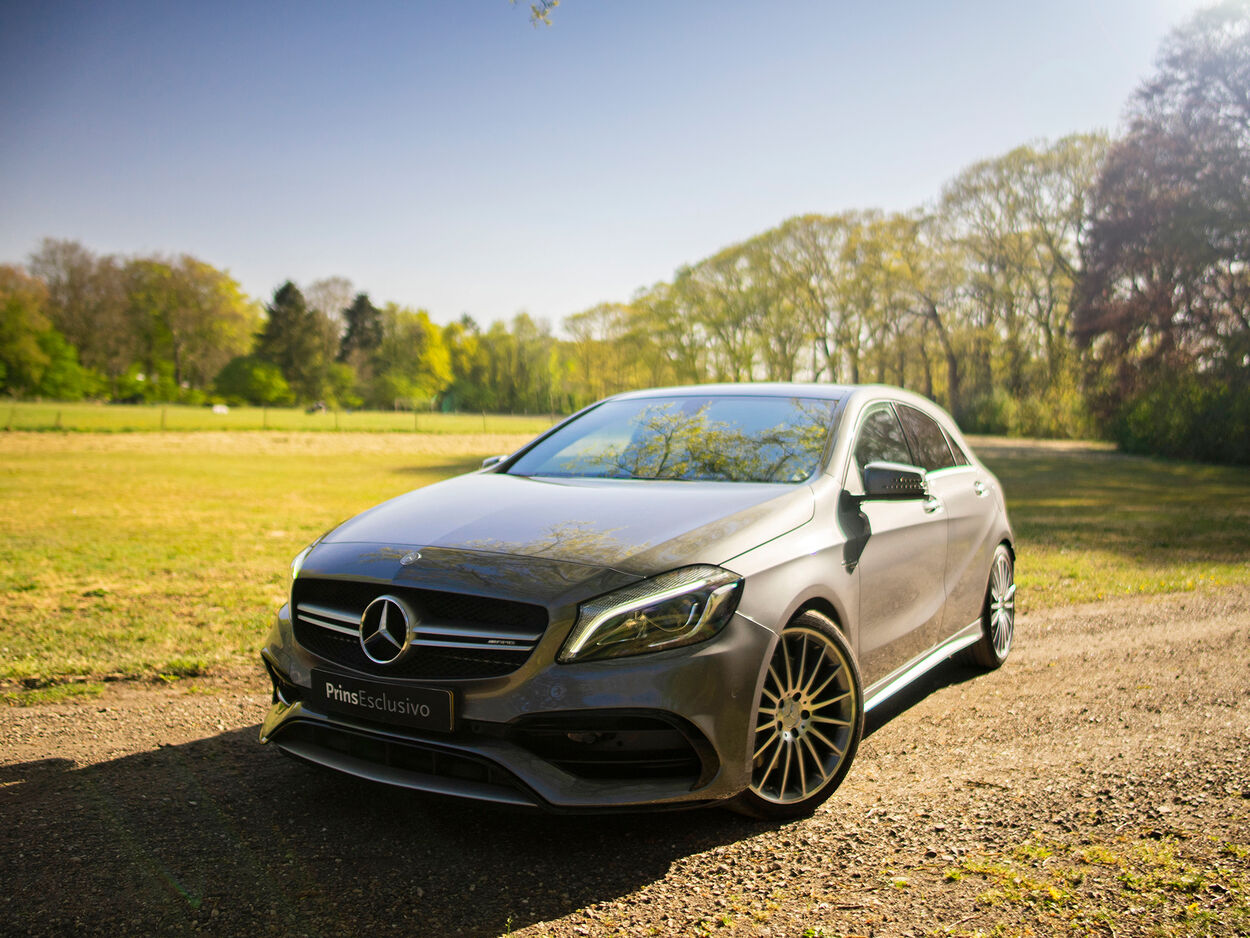 In lijn met het agressievere AMG-uiterlijk werden op dit exemplaar 19 inch wielen af-fabriek gemonteerd. Daarnaast behoren een Park Pilot + achteruitrijcamera, LED-koplampen, panoramadak, diverse pakketten en een instelbaar uitlaatklepsysteem tot de royale uitrusting van deze compacte A-Klasse AMG.